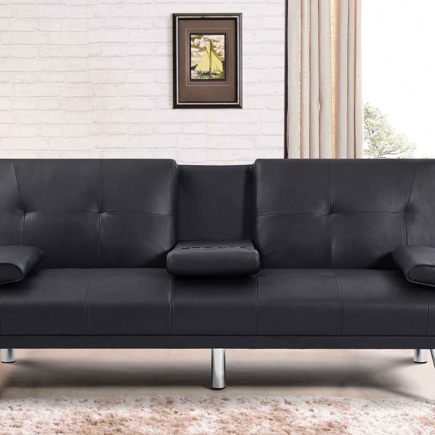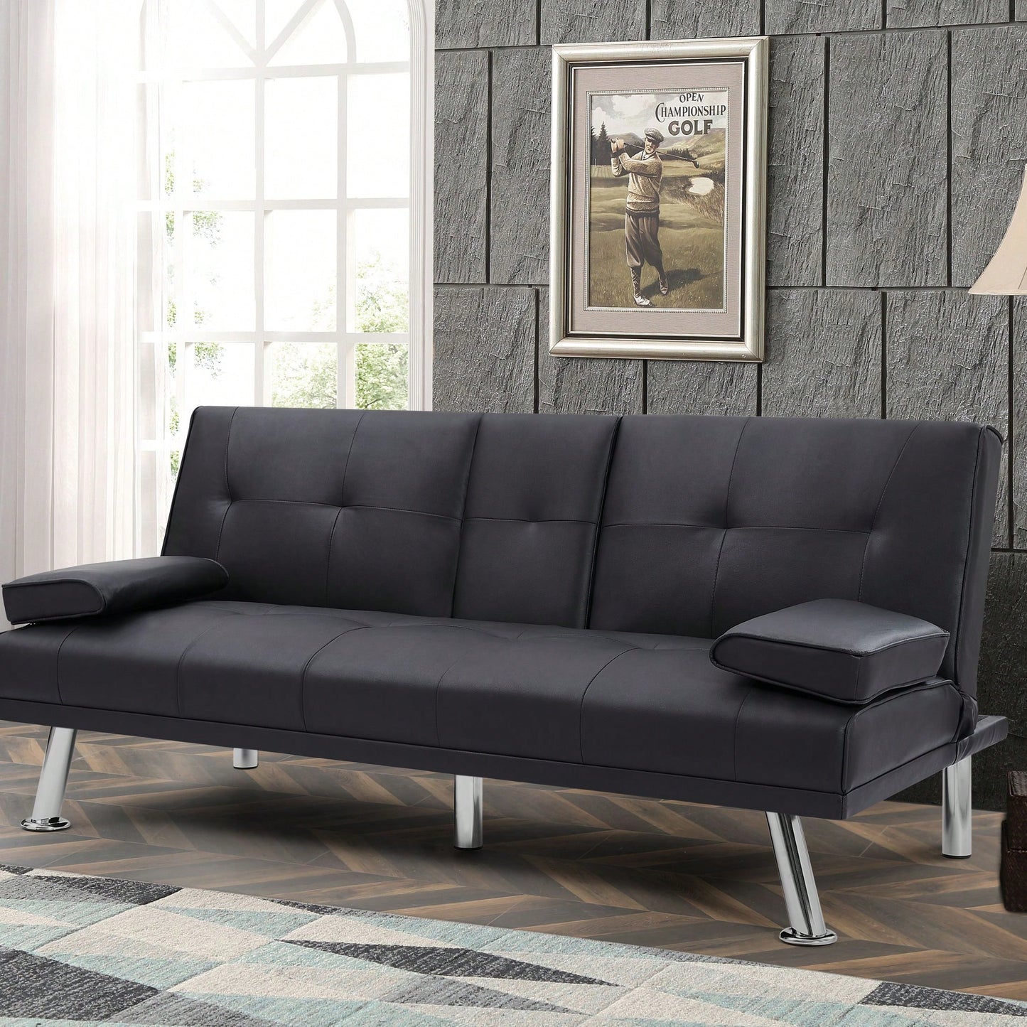 Here are 5 Features that summarize the product description of a black foldable sofa bed with cup holder: