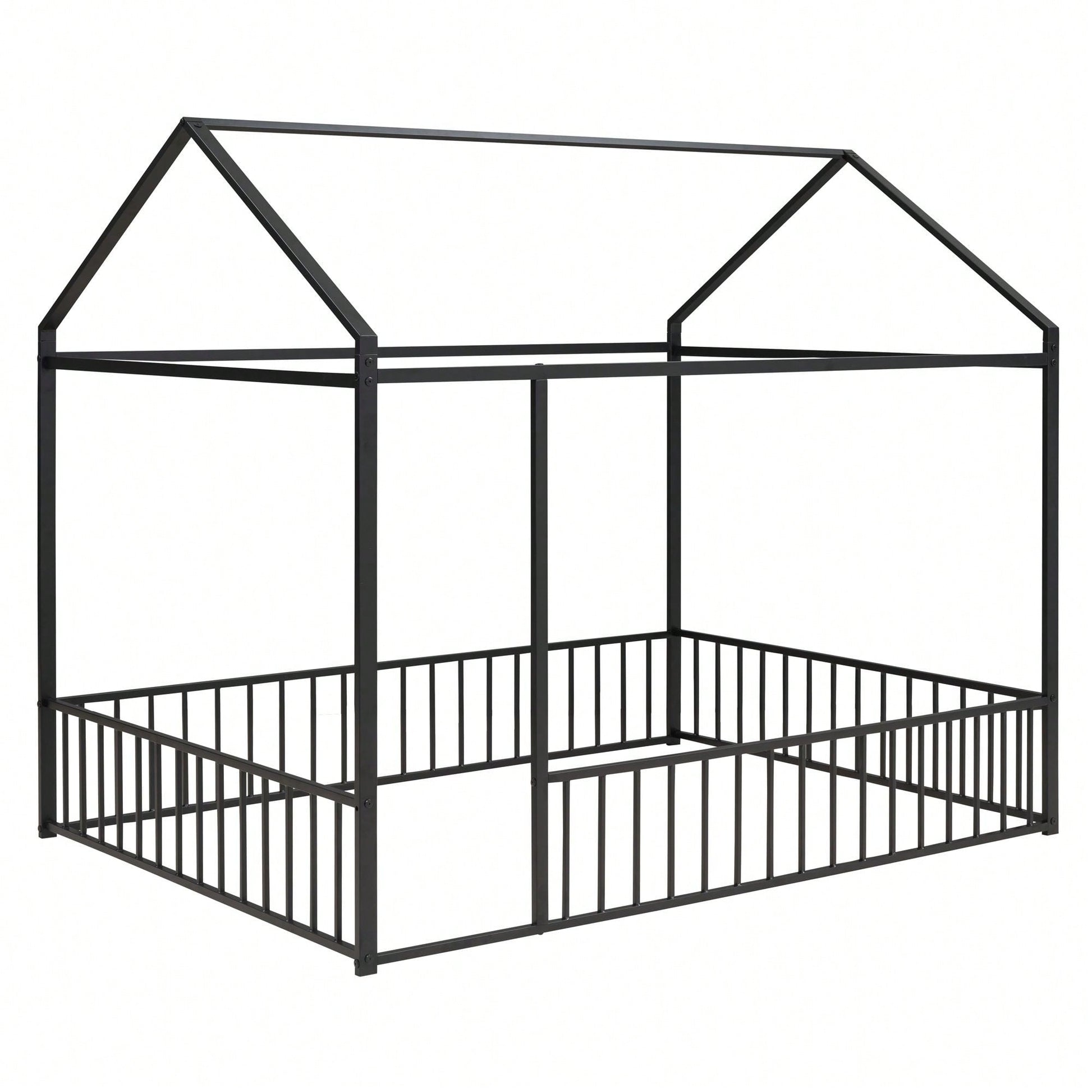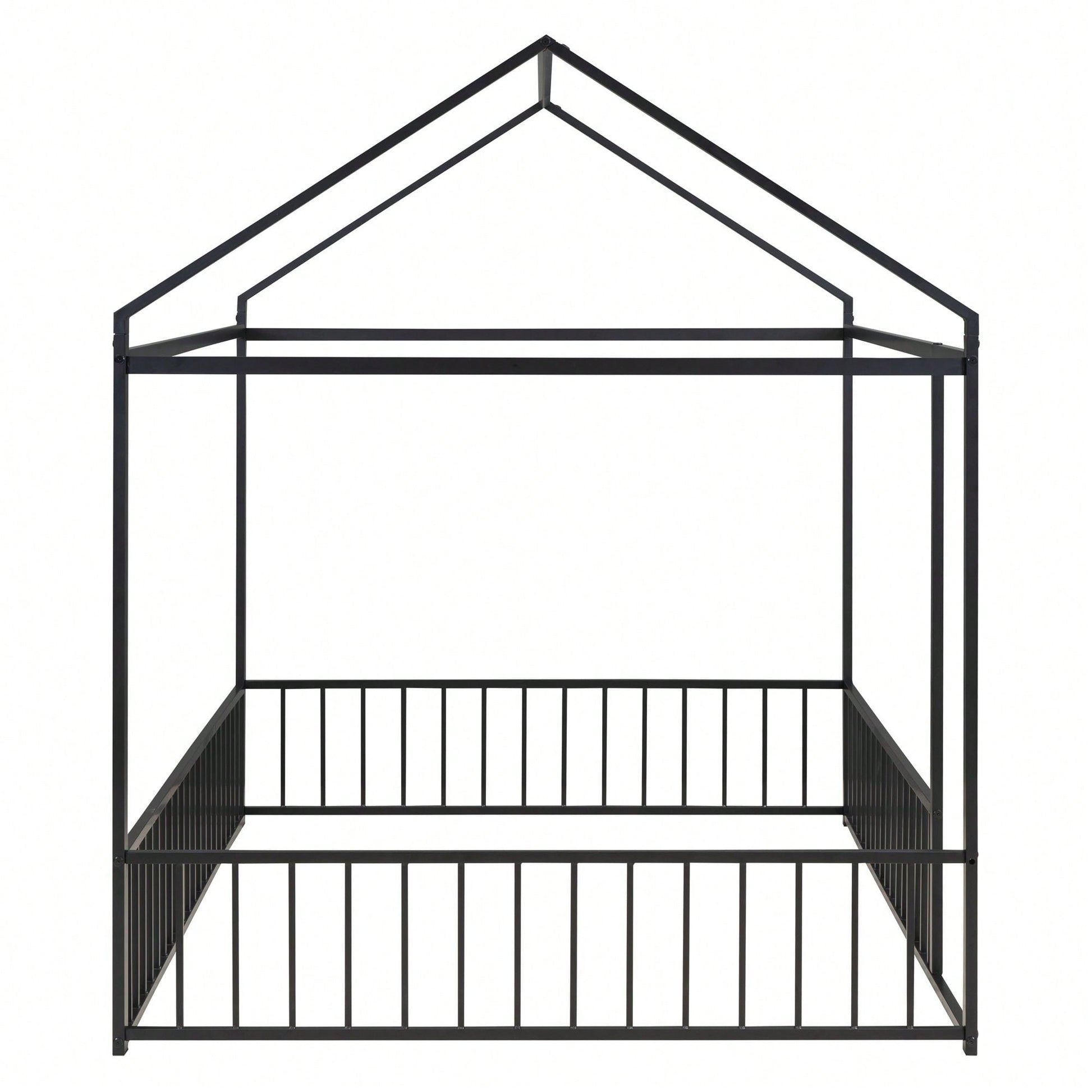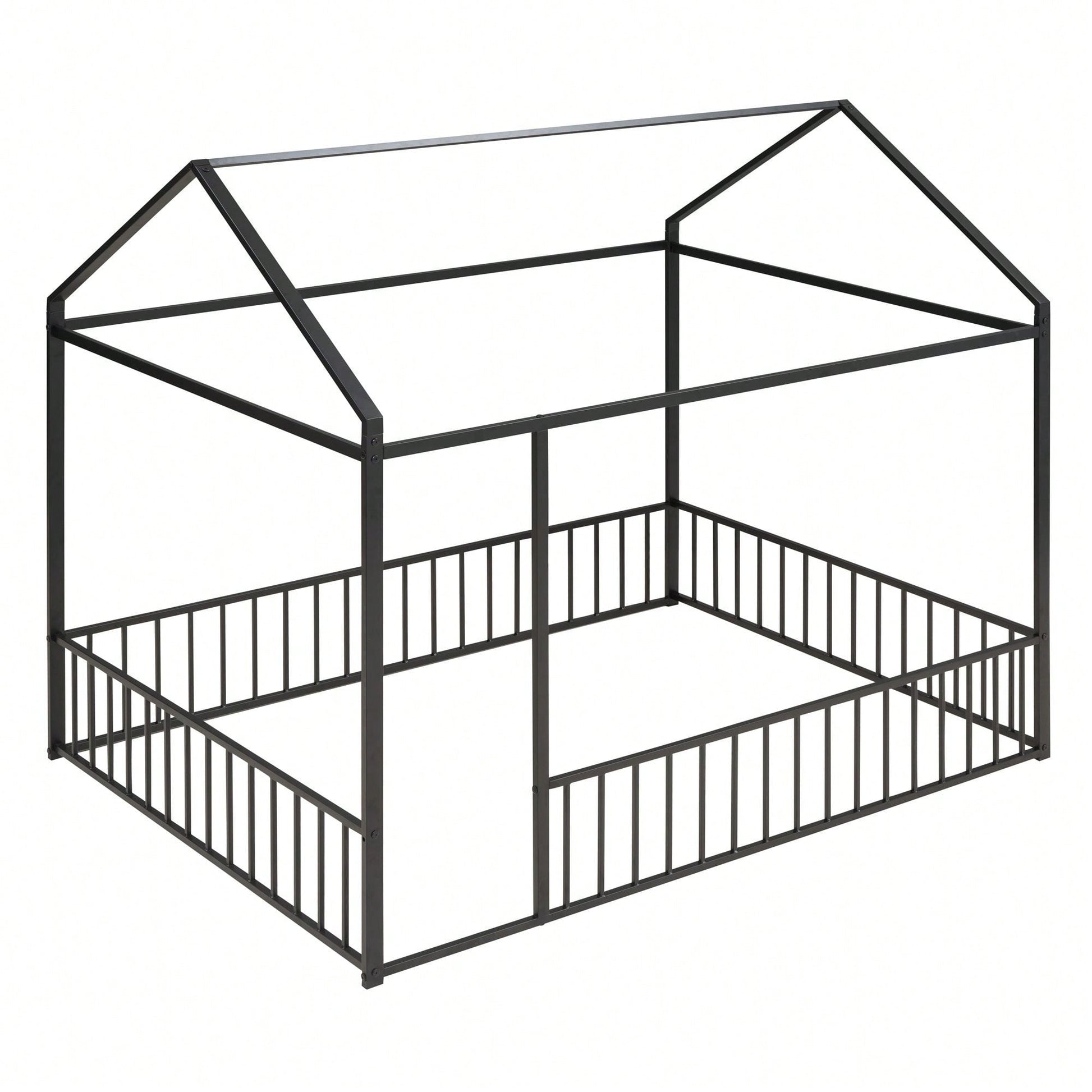 Full Size Metal Bed House Bed Frame With Fence, For Kids, Teens, Girls, Boys