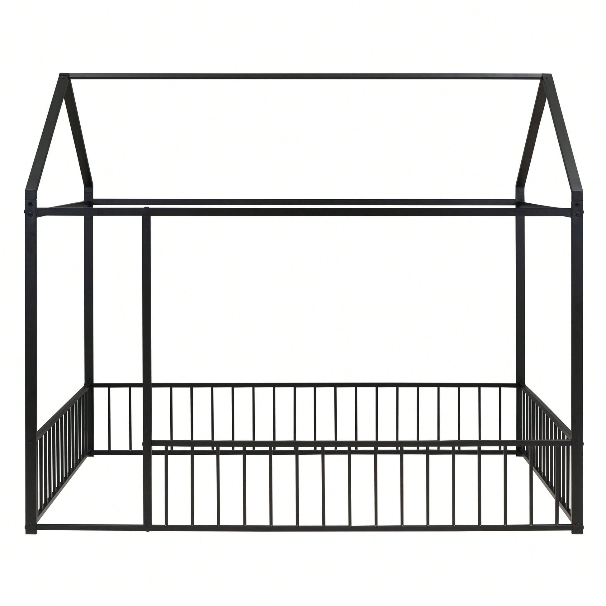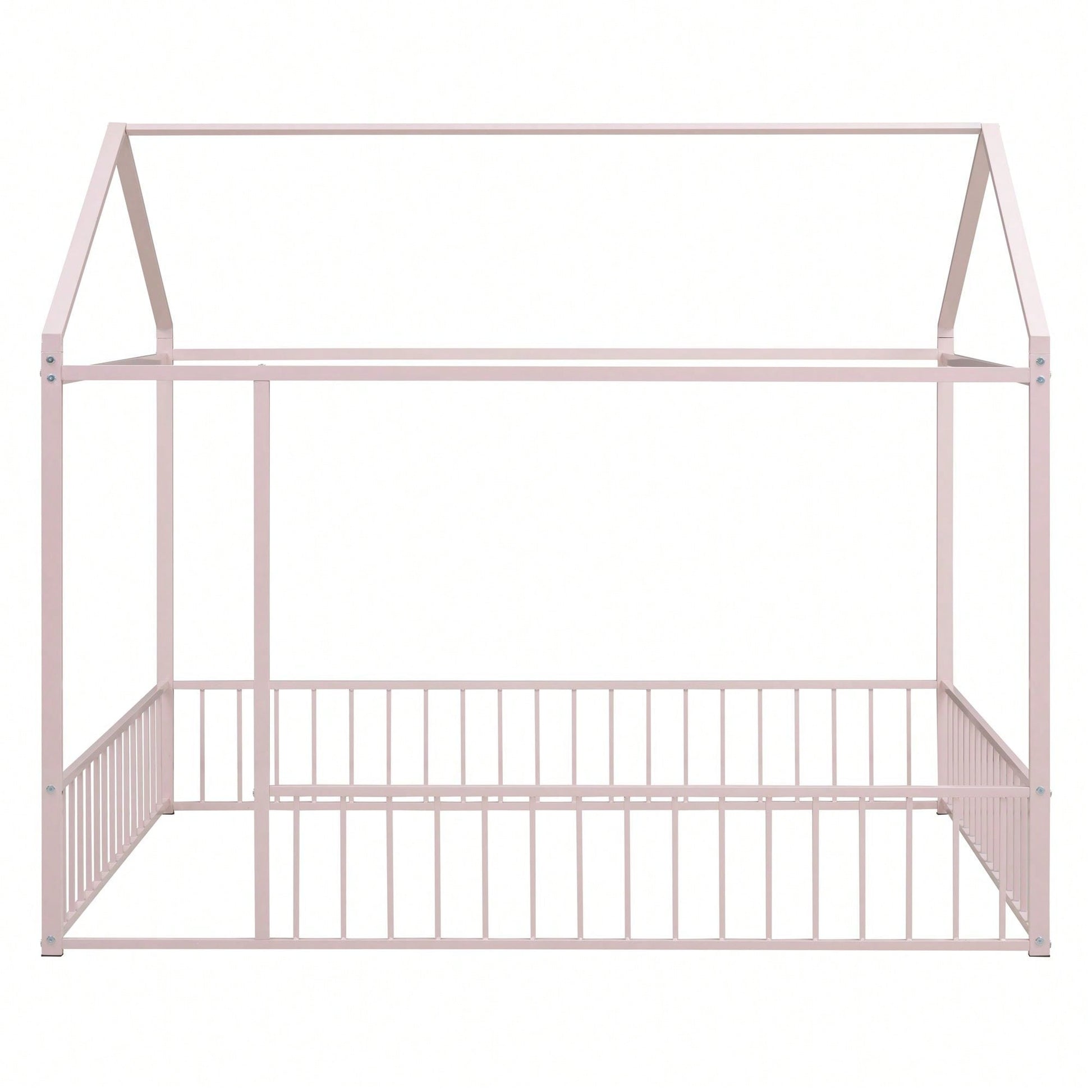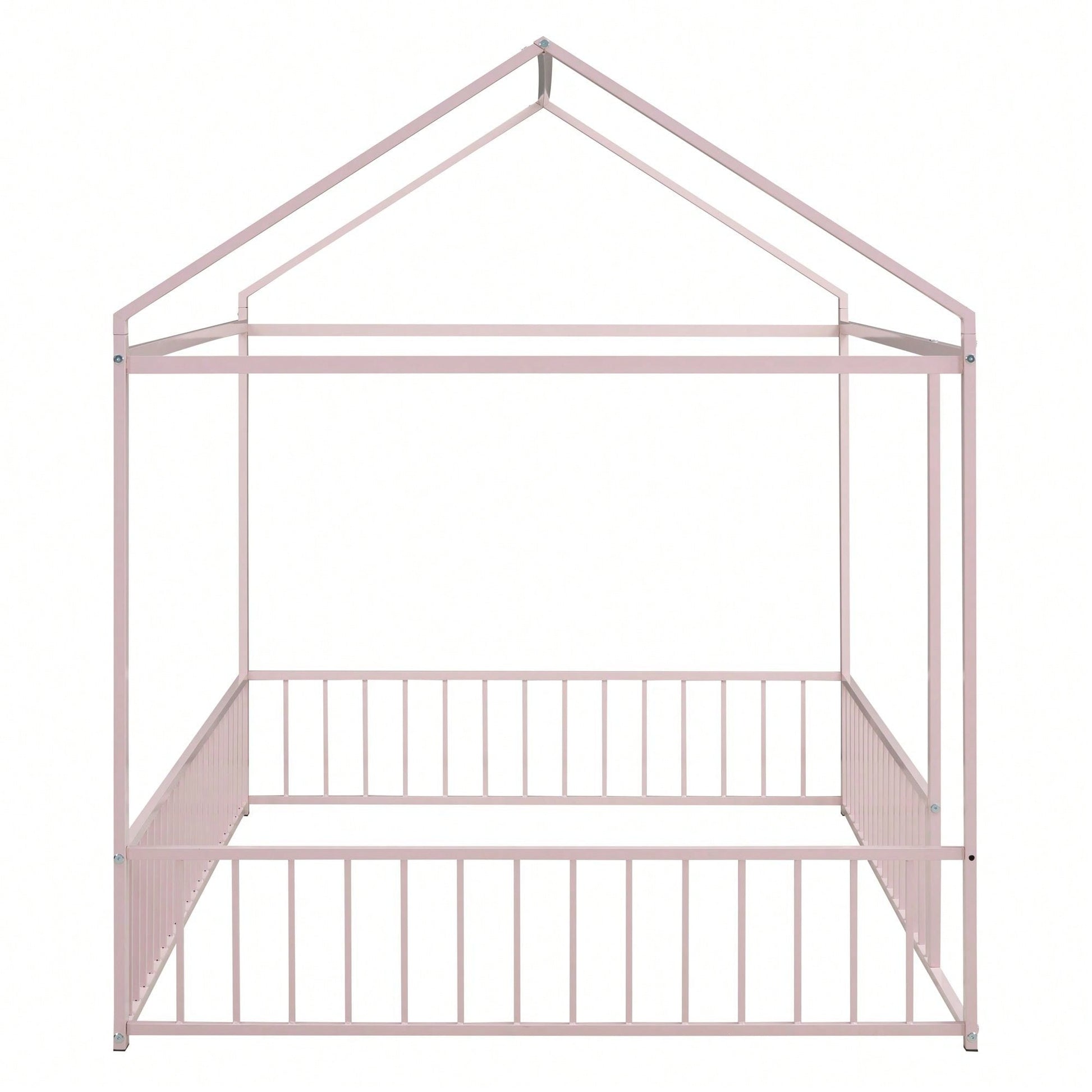 Full Size Metal Bed House Bed Frame With Fence, For Kids, Teens, Girls, Boys