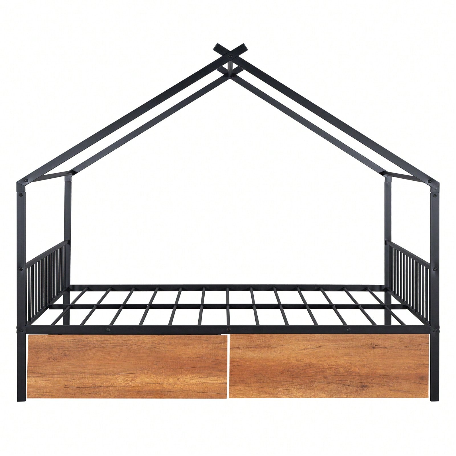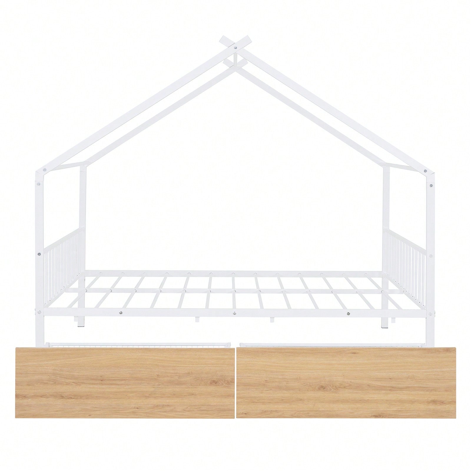 This metal platform bed in a whimsical house shape seems like a great option for a child's bedroom. The two built-in drawers provide useful storage space, while the sturdy metal frame and 350 lb weight capacity ensure safety and longevity. The house-inspired design should help create a cozy, imaginative sleeping environment for kids. The easy assembly and inclusion of all necessary hardware is also a nice convenience factor.