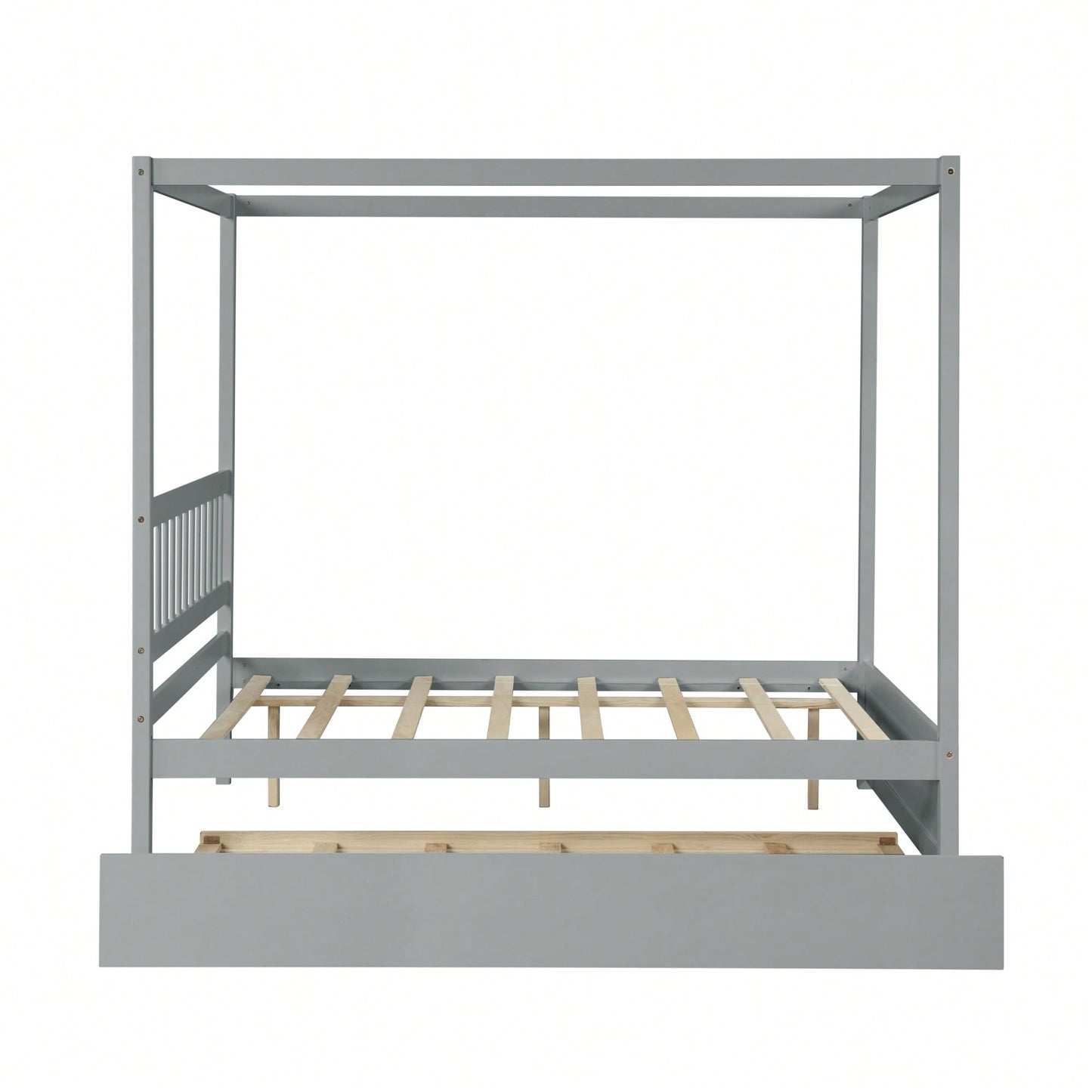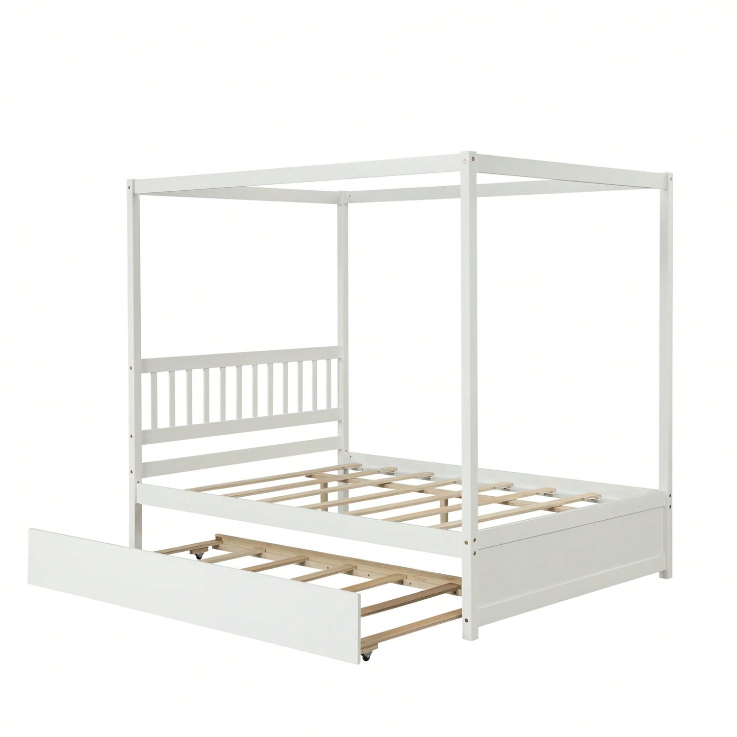 Full Size White Canopy Bed With Twin Trundle Solid Wood Frame And Headboard No Box Spring Required For Kids