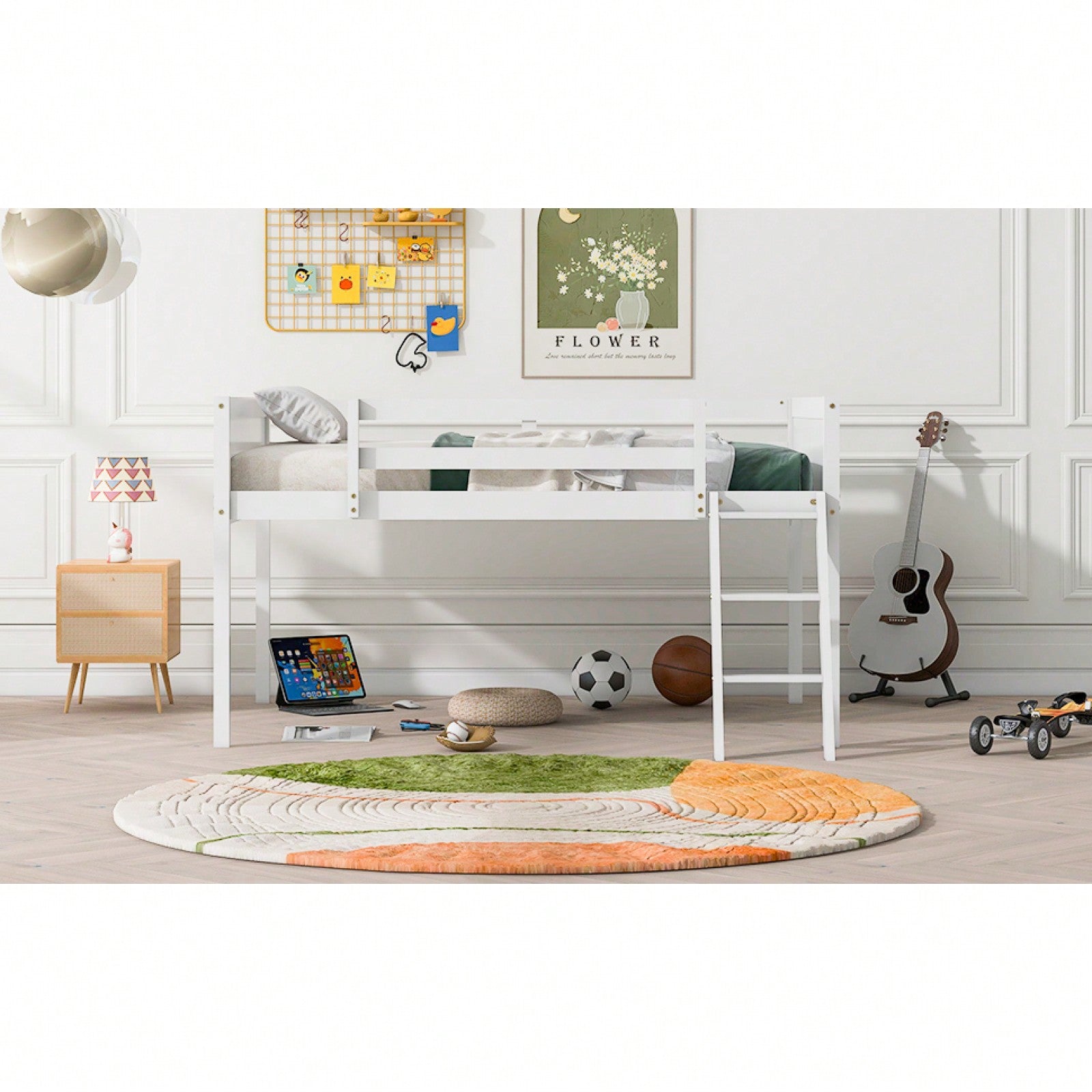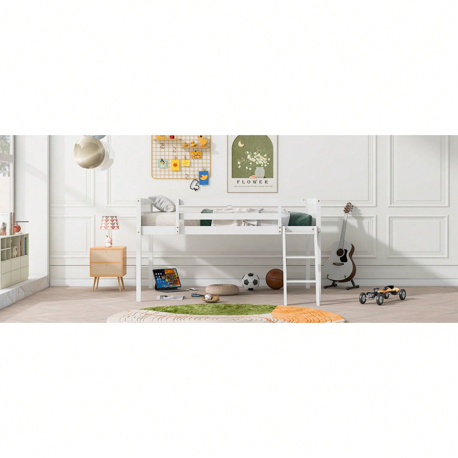 This full-size wood low loft bed offers a practical and fun solution for maximizing space in a bedroom. Designed with versatility in mind, the ladder can be positioned on either the left or right side, allowing for easy access to the upper sleeping area. The bed features a high guardrail design for safety, along with a ladder that includes handrails for added security. The space beneath the bed can be utilized for various activities, making it a great choice for both sleeping and play. Assembly is required, but the process is straightforward with the included instructions.