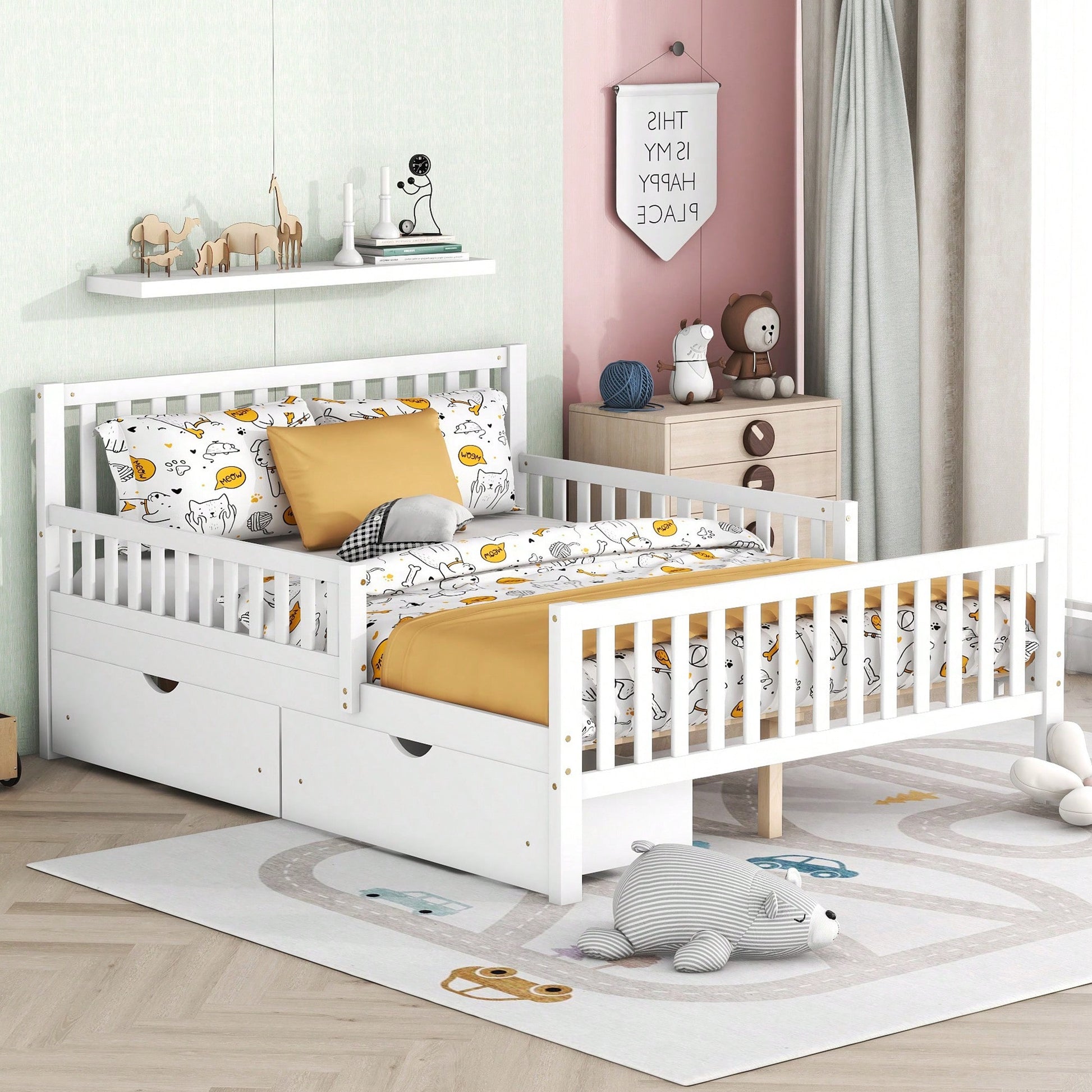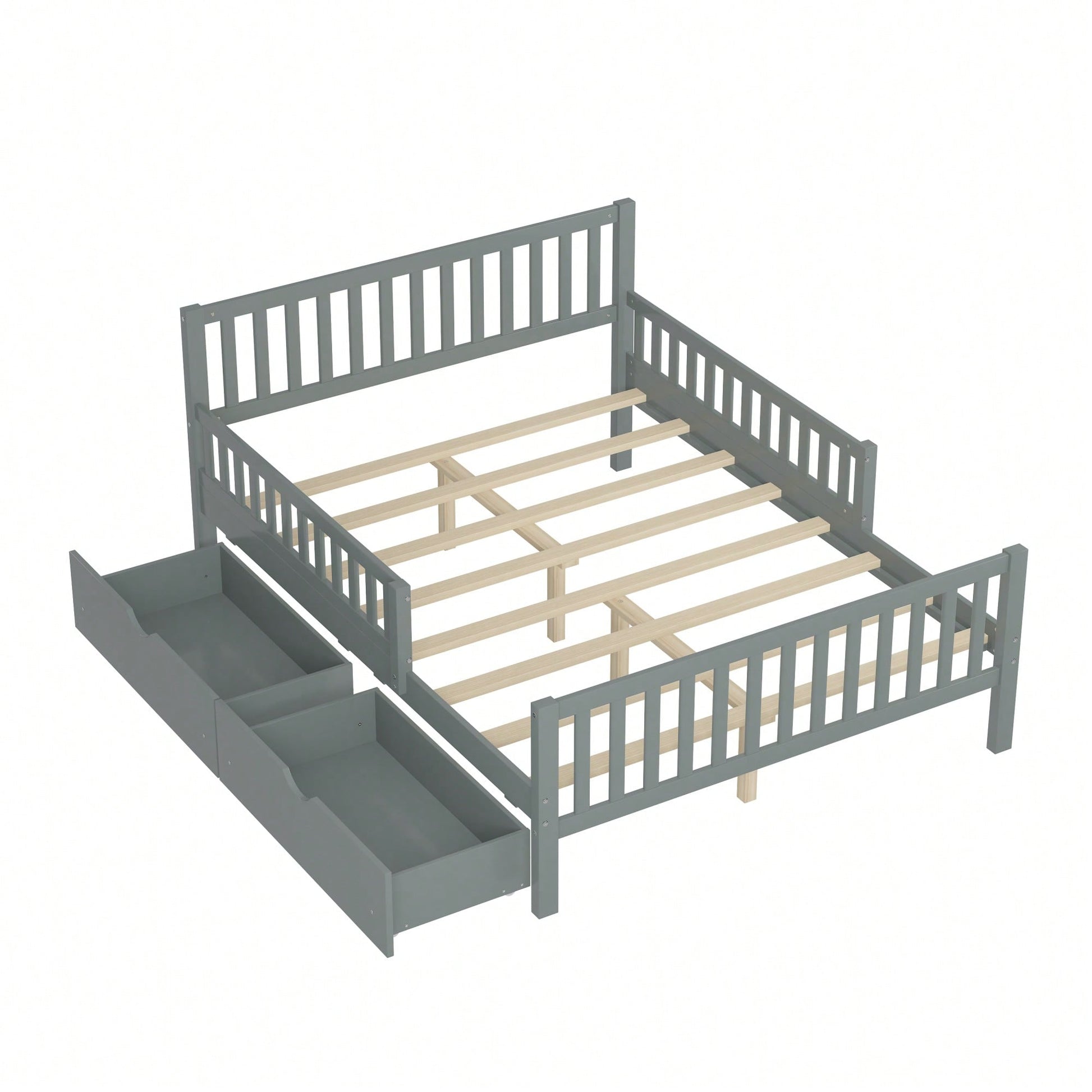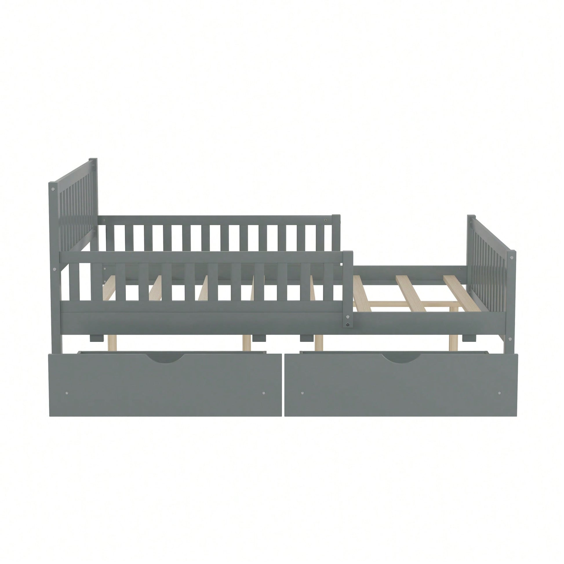 Full Size Wood Platform Bed With Safety Guardrails And Dual Storage Drawers In Gray