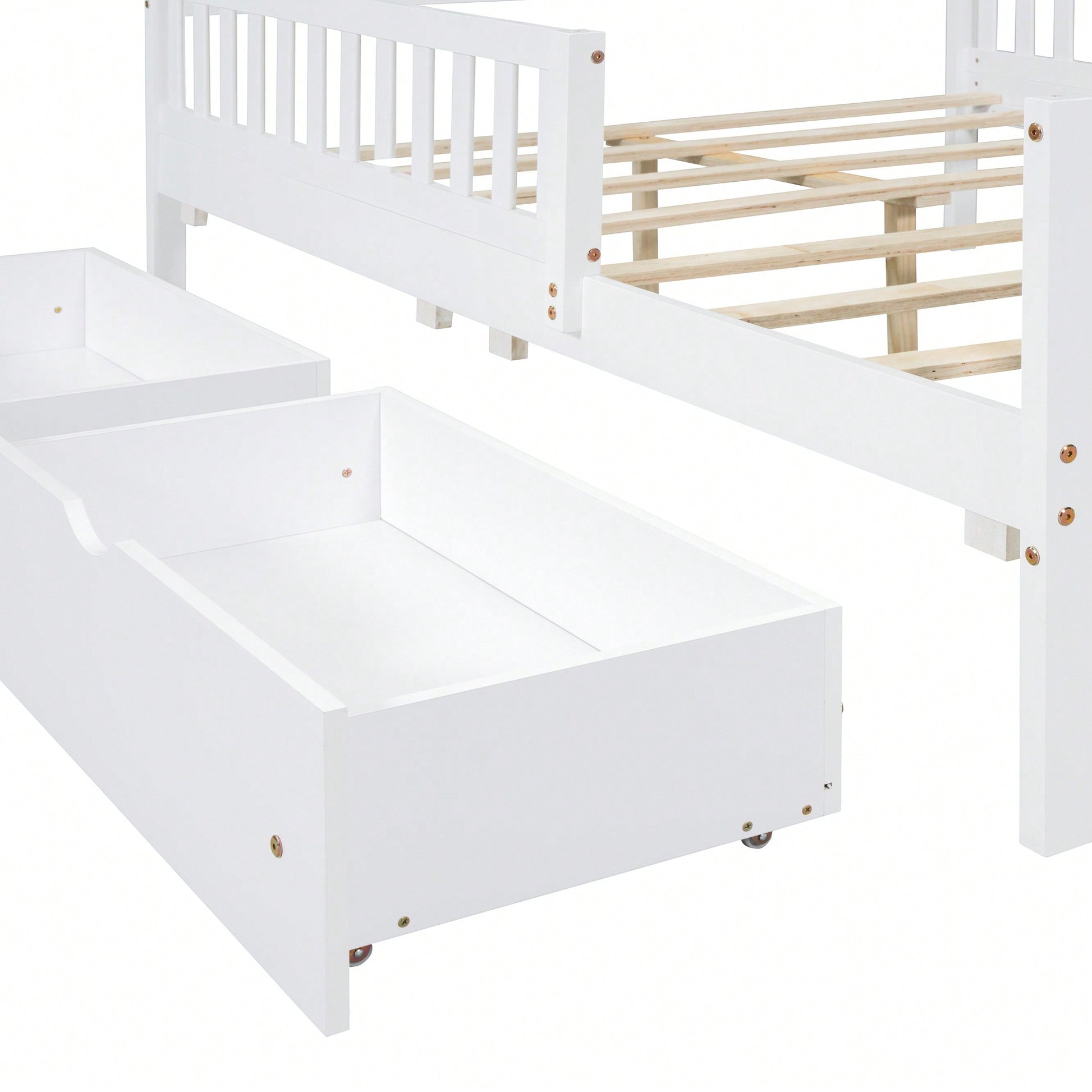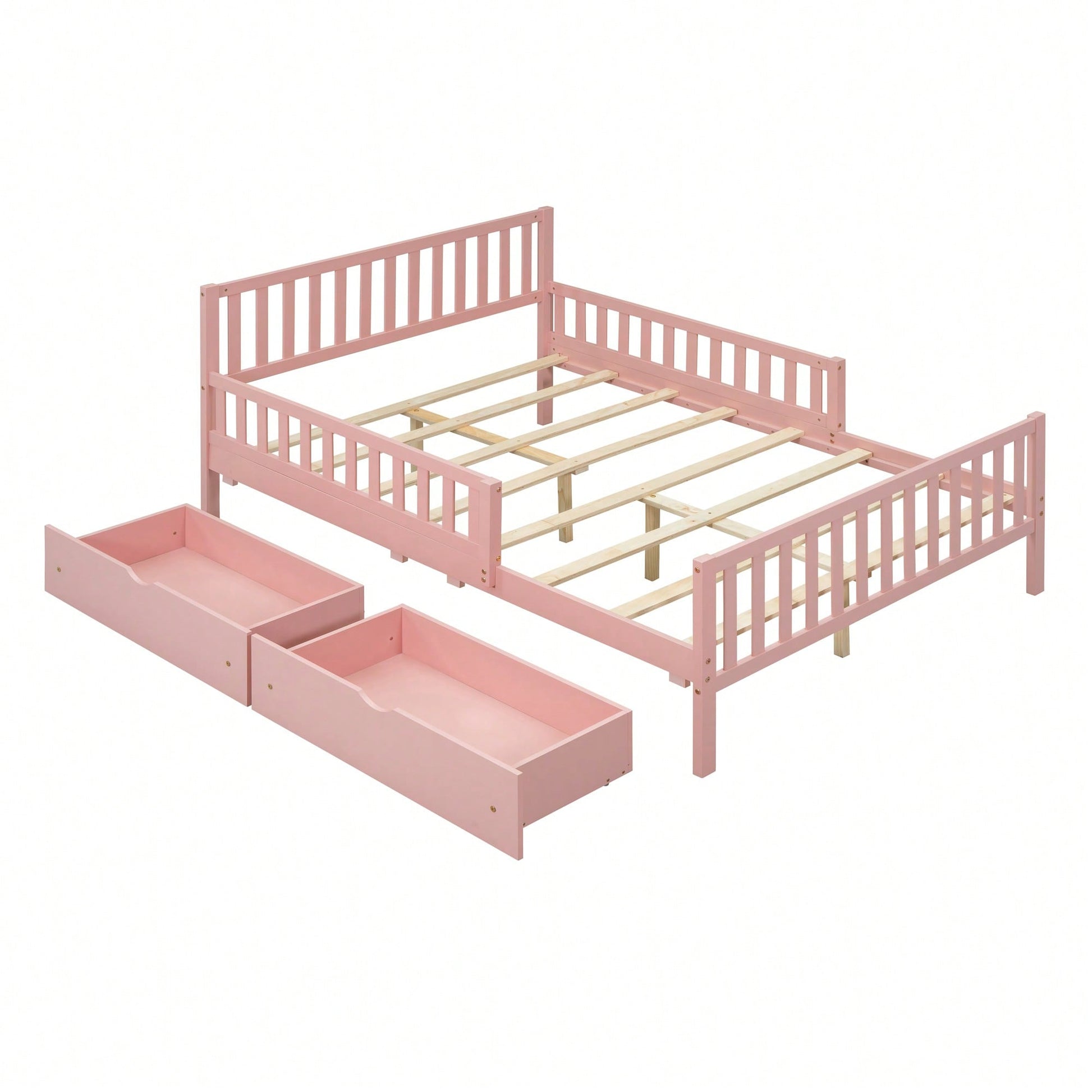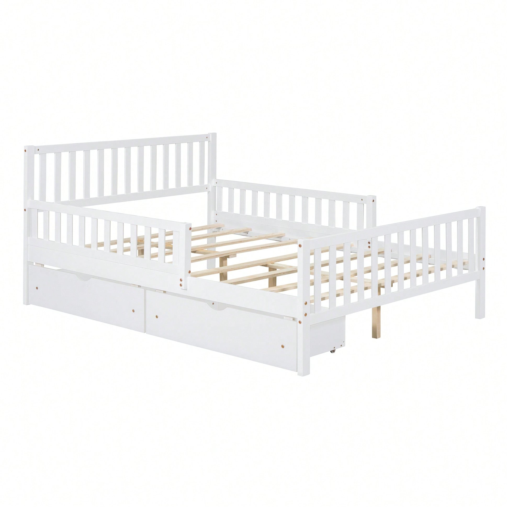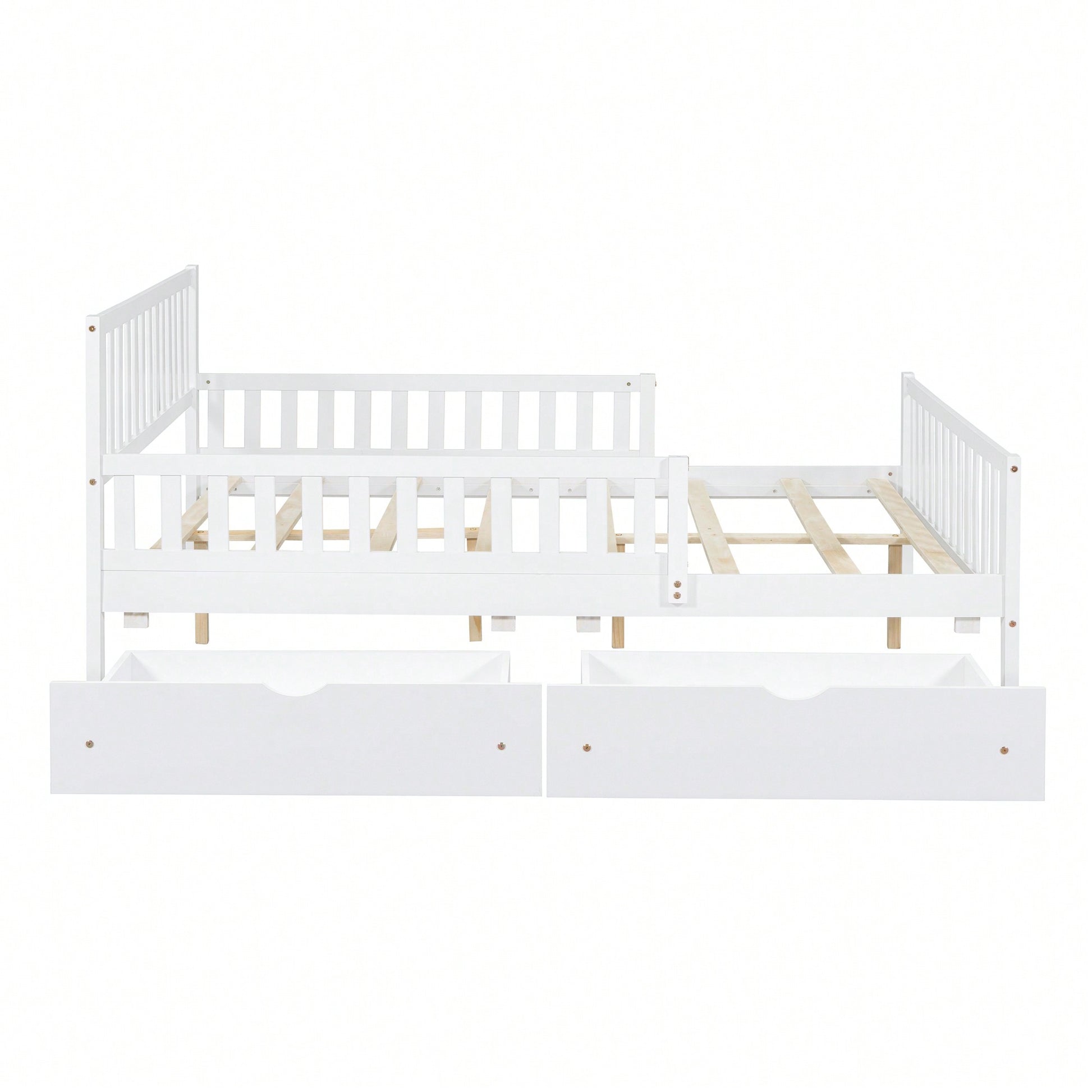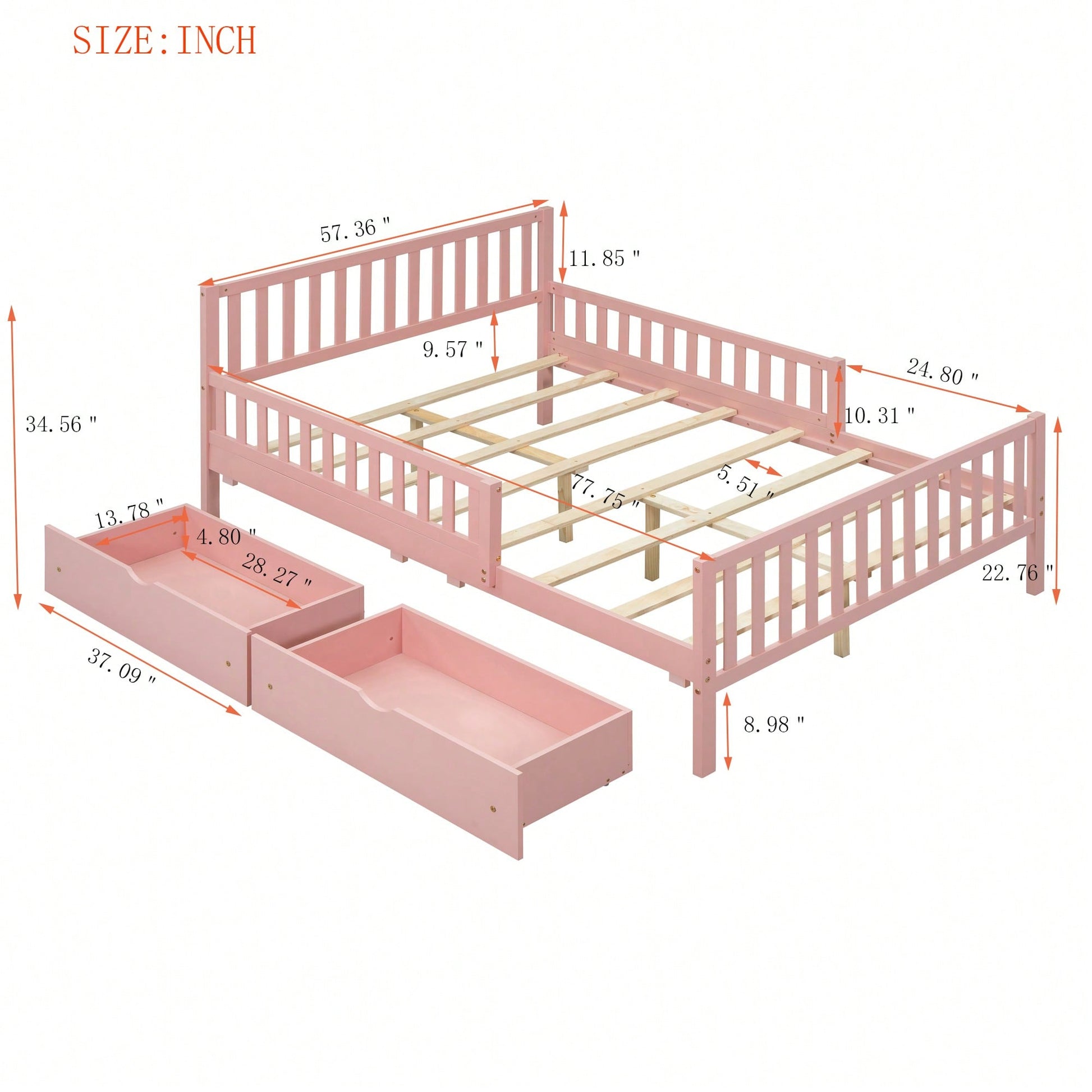 **Key Features** - Classic and simple design with a smooth wooden surface - Solid construction for durability and lightweight convenience - Guardrails on both sides for added safety - Two large storage drawers for efficient space-saving - Eight solid wood slats for enhanced stability **Product Description** This full-size wood platform bed features a timeless design with a straight-line headboard and a warm wooden finish, making it a versatile addition to any bedroom decor. Its solid construction ensures durability while allowing for easy movement of the furniture. The bed is equipped with guardrails on both sides to prevent falls during the night, providing peace of mind for users. Additionally, the two spacious drawers beneath the bed offer ample storage for clothes and other items, helping to keep your bedroom organized. With eight evenly spaced wooden slats, this bed delivers exceptional support and stability for years of comfortable use. **Specifications** - Overall Product Dimensions: 77.4"L X 57.5"W X 35.4"H - Assembly required with included instructions and tools