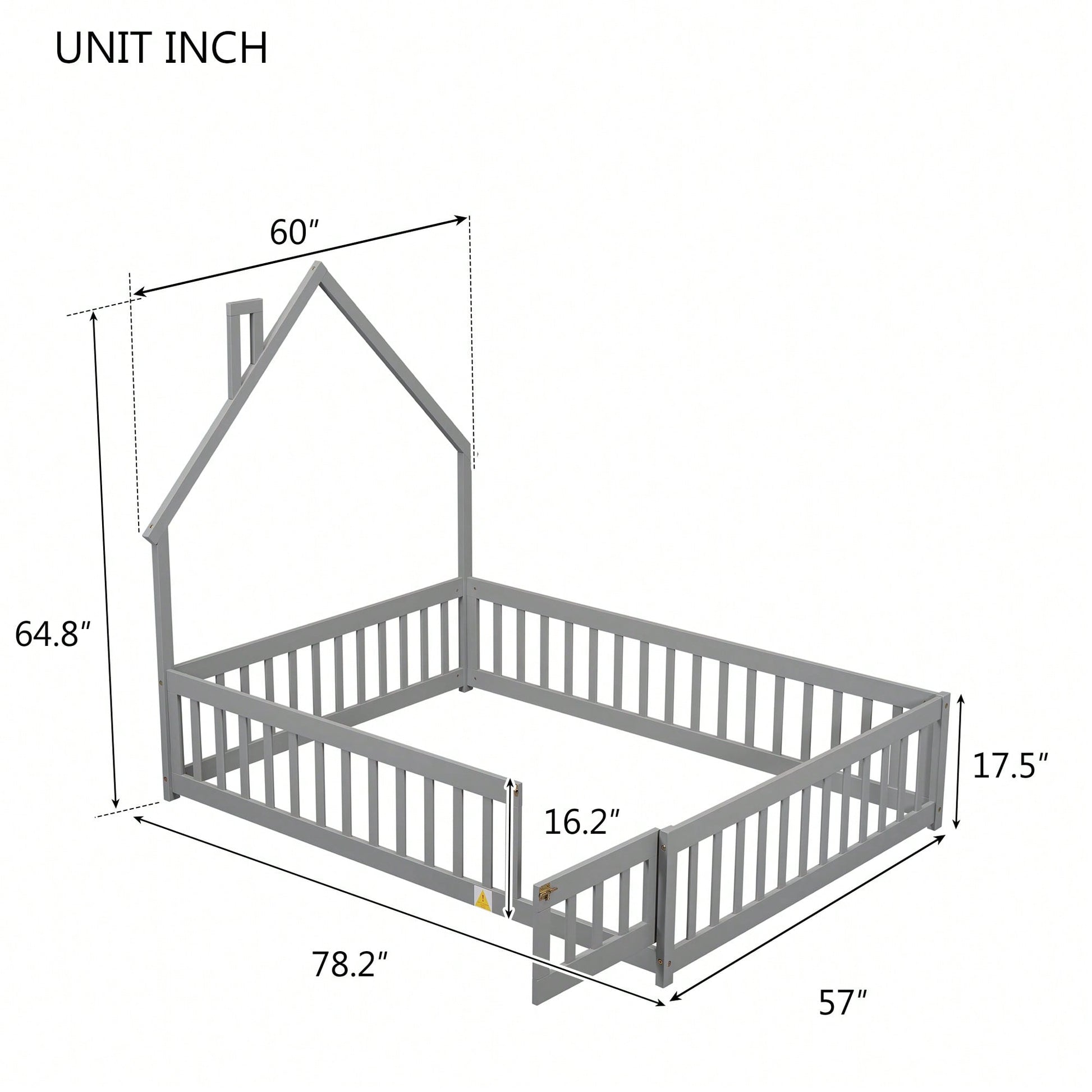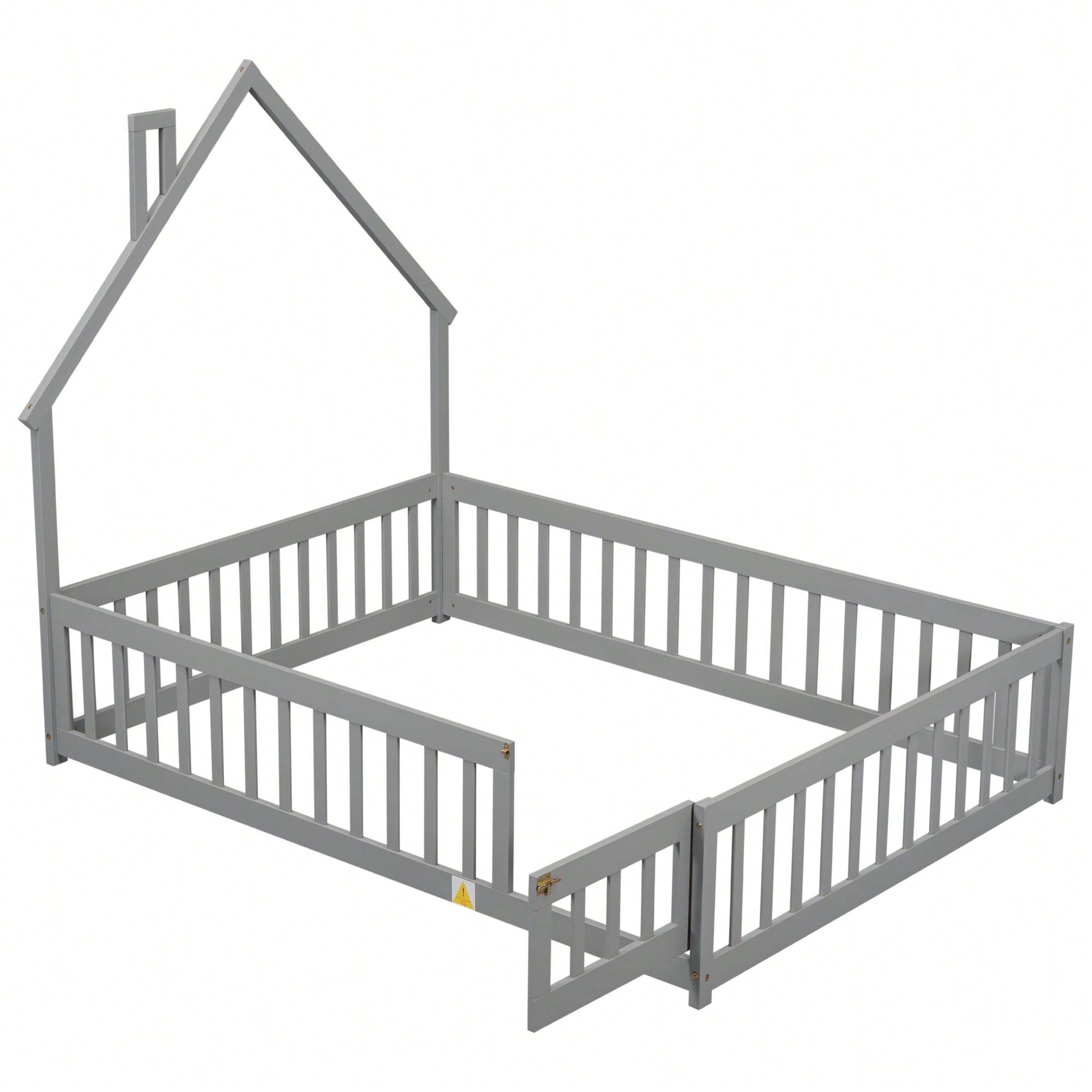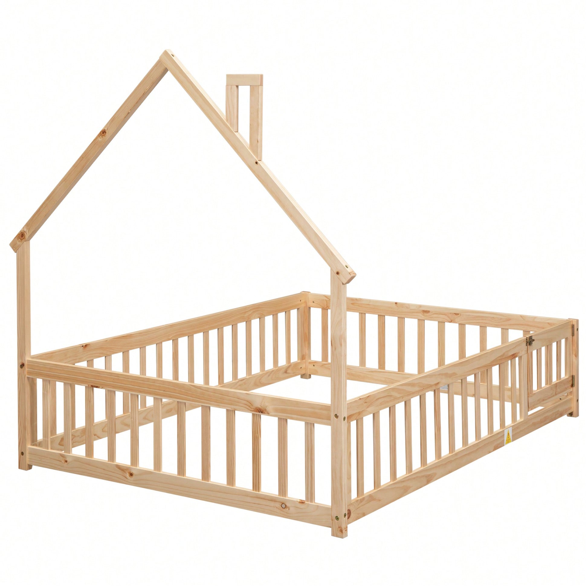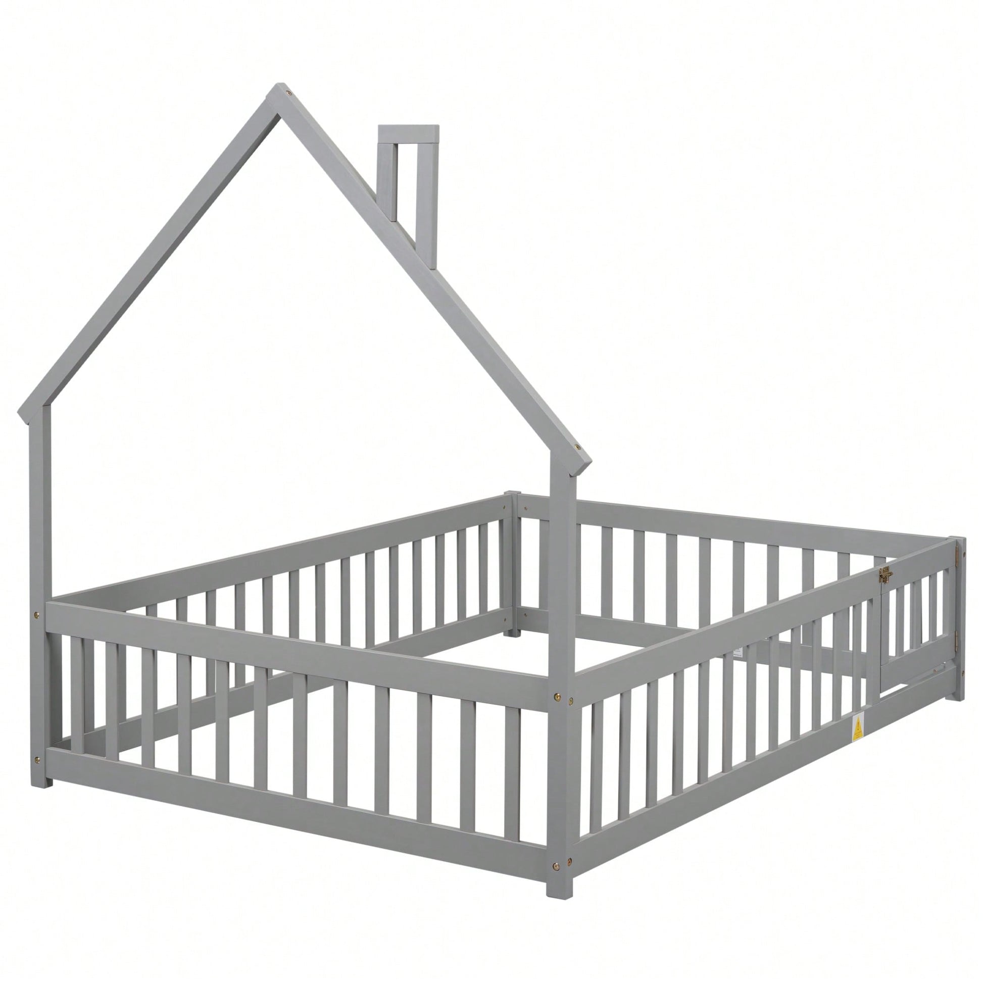 This full house-shaped headboard floor bed features a unique design that brings a cozy and imaginative atmosphere to any bedroom. The bed platform is equipped with safety guardrails and a convenient door, ensuring a fun yet secure sleeping environment. Constructed from durable pine wood, this bed promises lasting sturdiness and stability for a restful night's sleep. A full-size mattress can be placed within the frame, providing a secure fit. Easy assembly is guaranteed with included instructions and hardware.