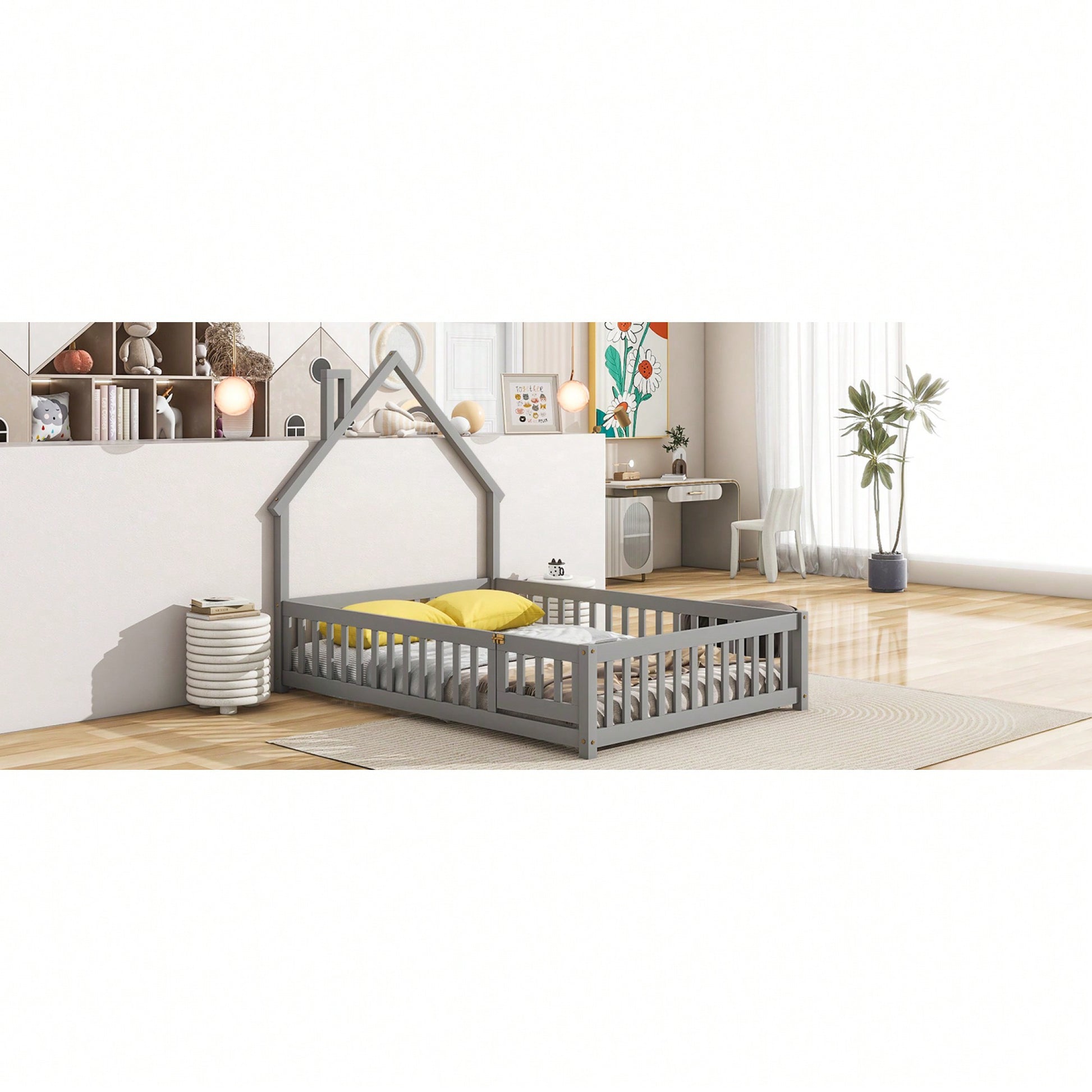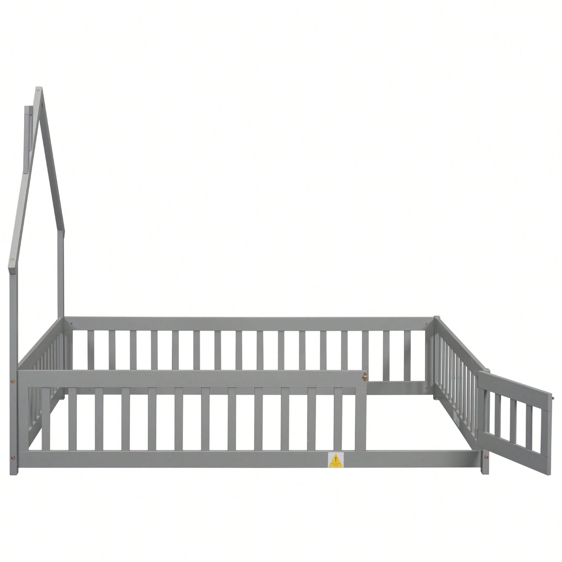 Grey Full House-Shaped Headboard Floor Bed With Safety Fence For Kids Room