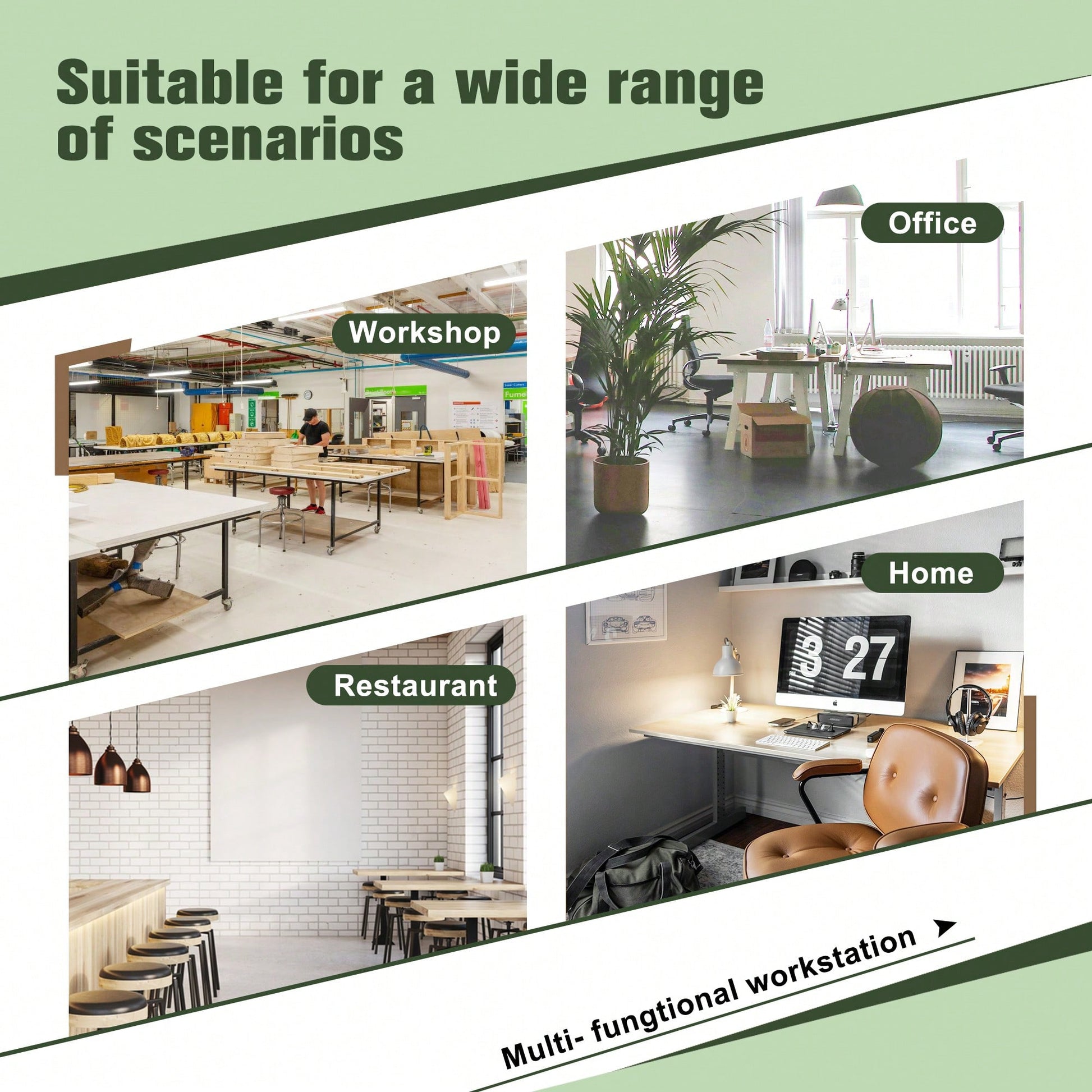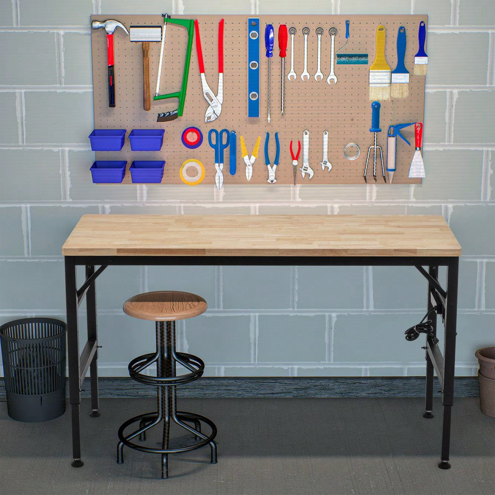 **Key Features** - 60" x 24" solid rubber wood top with a heavy-duty metal frame - Supports a weight load capacity of over 2000 lbs - 6-level adjustable height from 28.74" to 39.37" for comfortable standing or sitting - Equipped with 4 AC power outlets and 1 switch for easy access to electric tools - Adjustable rubber non-slip foot pads for stability on uneven surfaces **Product Description** This adjustable height workbench features a solid rubber wood top and a robust metal frame, designed to support heavy loads of up to 2000 lbs. With a height adjustment range of 28.74" to 39.37", it allows users to work comfortably in both standing and sitting positions, promoting better posture and reducing fatigue. The workbench includes a built-in power strip with 4 AC outlets, providing convenient access for various electric tools and lighting. Each leg is equipped with adjustable non-slip foot pads to ensure stability, even on uneven ground. This versatile worktable is suitable for workshops, garages, offices, or as a home computer desk, making it a practical addition to any workspace. **Specifications** - Dimensions: 60" x 24" - Height Adjustment Range: 28.74" to 39.37" - Load Capacity: 2000 lbs - Power Outlets: 4 AC outlets and 1 switch - Material: Solid rubber wood top, metal frame - Adjustable Foot Pads: Yes