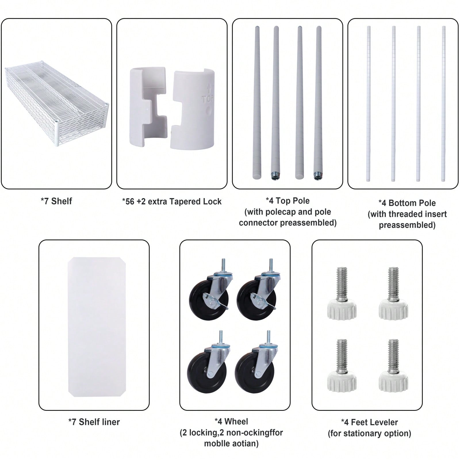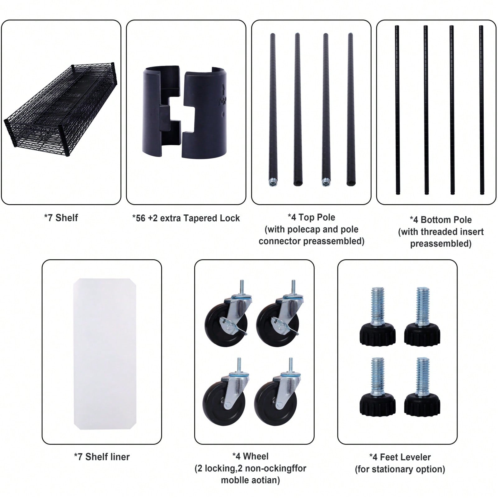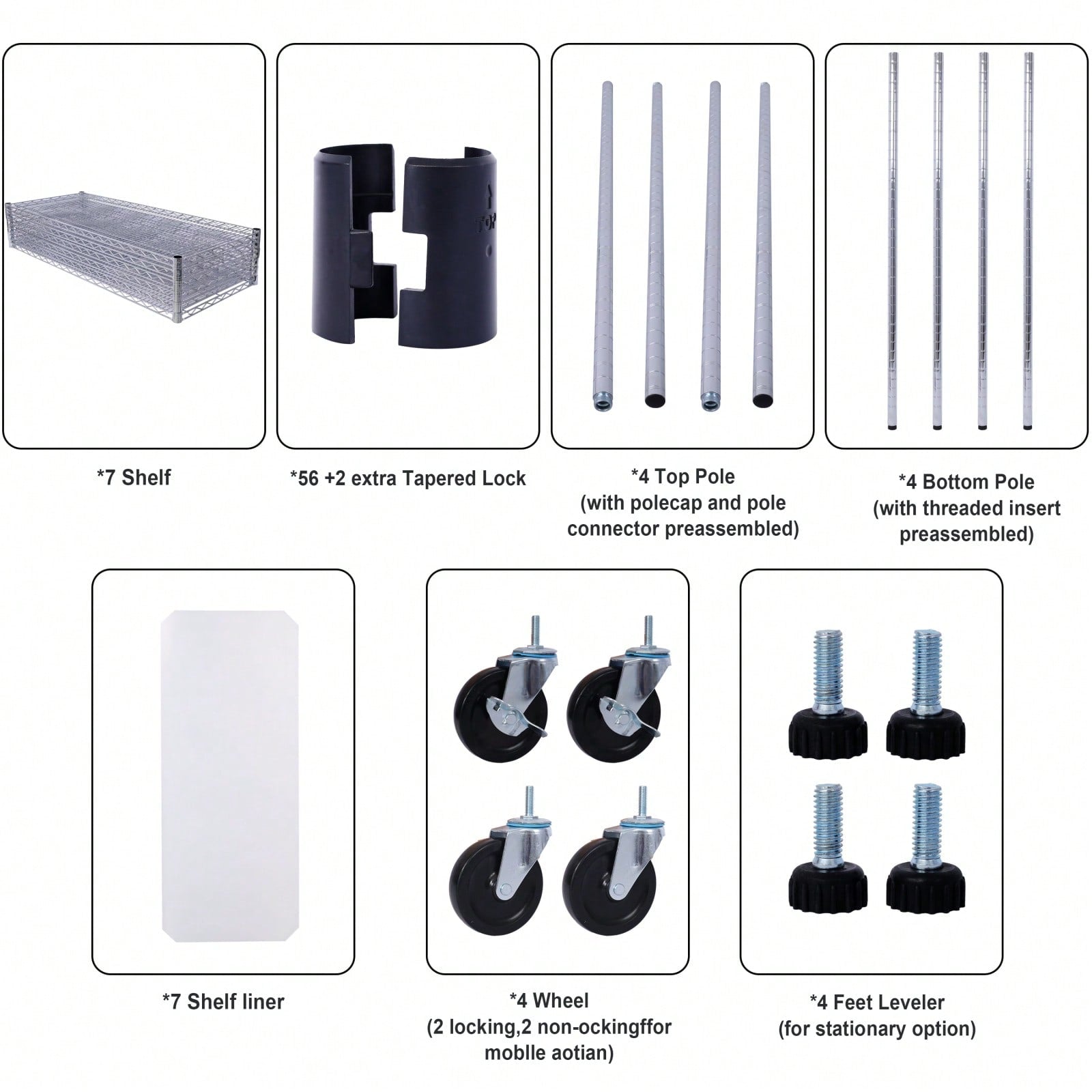 Product Description: This 7-tier metal shelf wire shelving unit is a heavy-duty and adjustable storage rack designed for use in various settings such as closets, kitchens, garages, basements, and commercial spaces. The shelves are customizable and versatile, with each shelf adjustable in 1-inch increments to accommodate items of different sizes. The spacious shelving unit features 7 tiers with a maximum load capacity of 2450 lbs, with each shelf capable of holding 350 lbs. The unit is easy to move around thanks to its leveling feet and industrial wheels, making it ideal for different storage needs. The durable construction of the wire shelving ensures longevity and functionality, with rust and oxidation resistance for added durability.