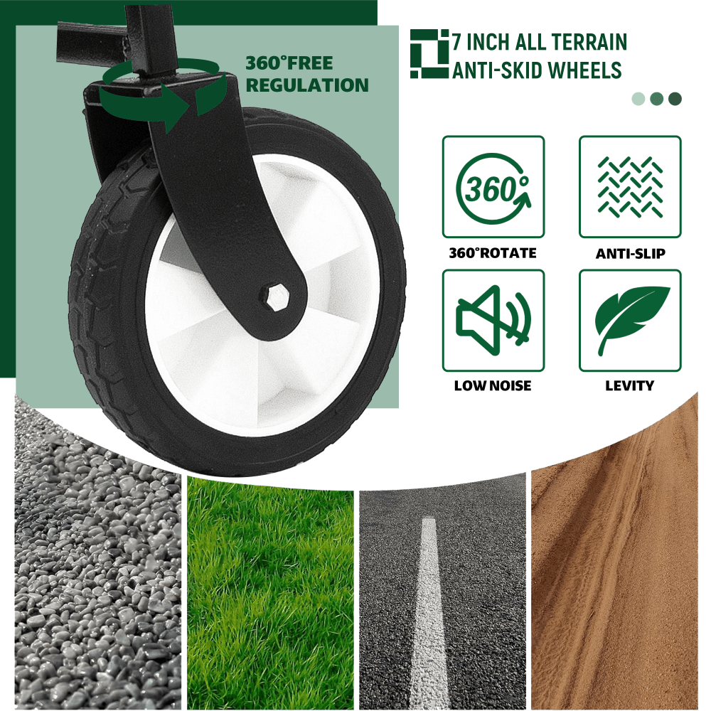 **Key Features:** - Collapsible design for easy storage and transport - Unique strapping system for securing taller or longer items - Stylish two-tone color scheme for a modern look - Heavy-duty frame with a rust-resistant powder-coated finish - All-terrain 360-degree swivel wheels for easy maneuverability **Product Description:** This collapsible foldable wagon cart is perfect for various activities such as gardening, shopping, beach outings, and camping. It includes a waterproof plastic liner and cover set that protects against stains, scratches, and outdoor elements like rain and dust. The lightweight design ensures easy handling, while the unique strapping system allows for secure transport of larger items. With a stylish two-tone design and a durable heavy-duty frame, this wagon combines functionality with modern aesthetics. The all-terrain 360-degree swivel wheels make it easy to navigate different surfaces, making it a versatile and convenient choice for any adventure. **Specifications:** - Weight capacity: 360 lbs - Wheel size: 7 inches - Includes 3 plastic liner bags