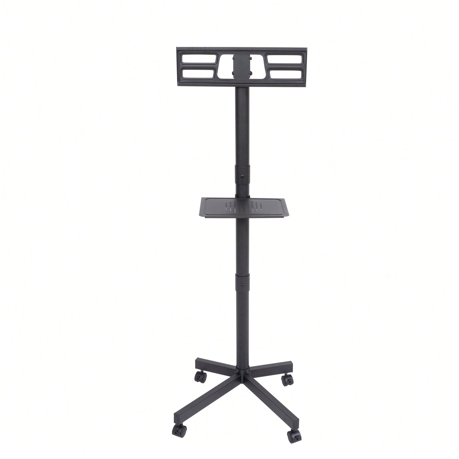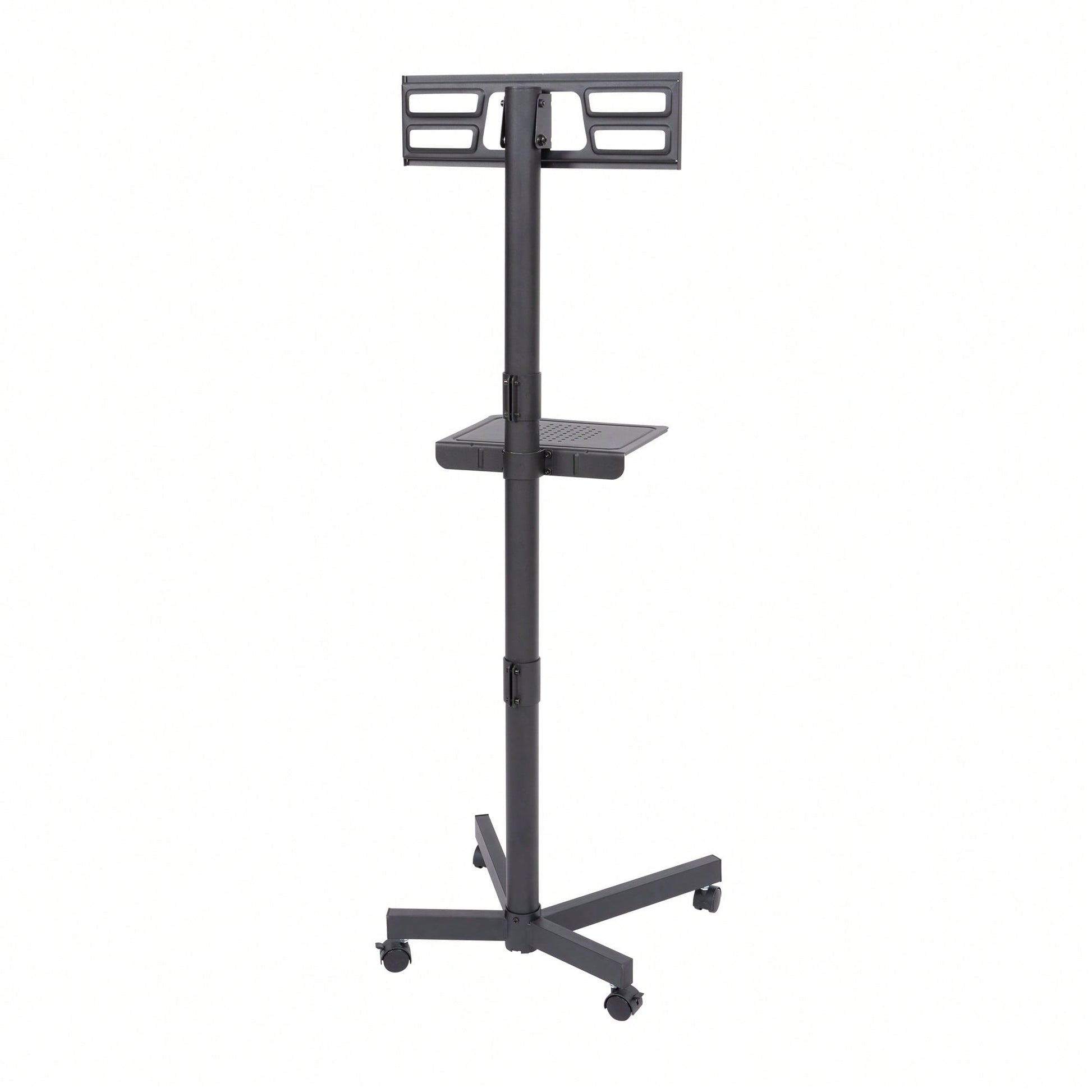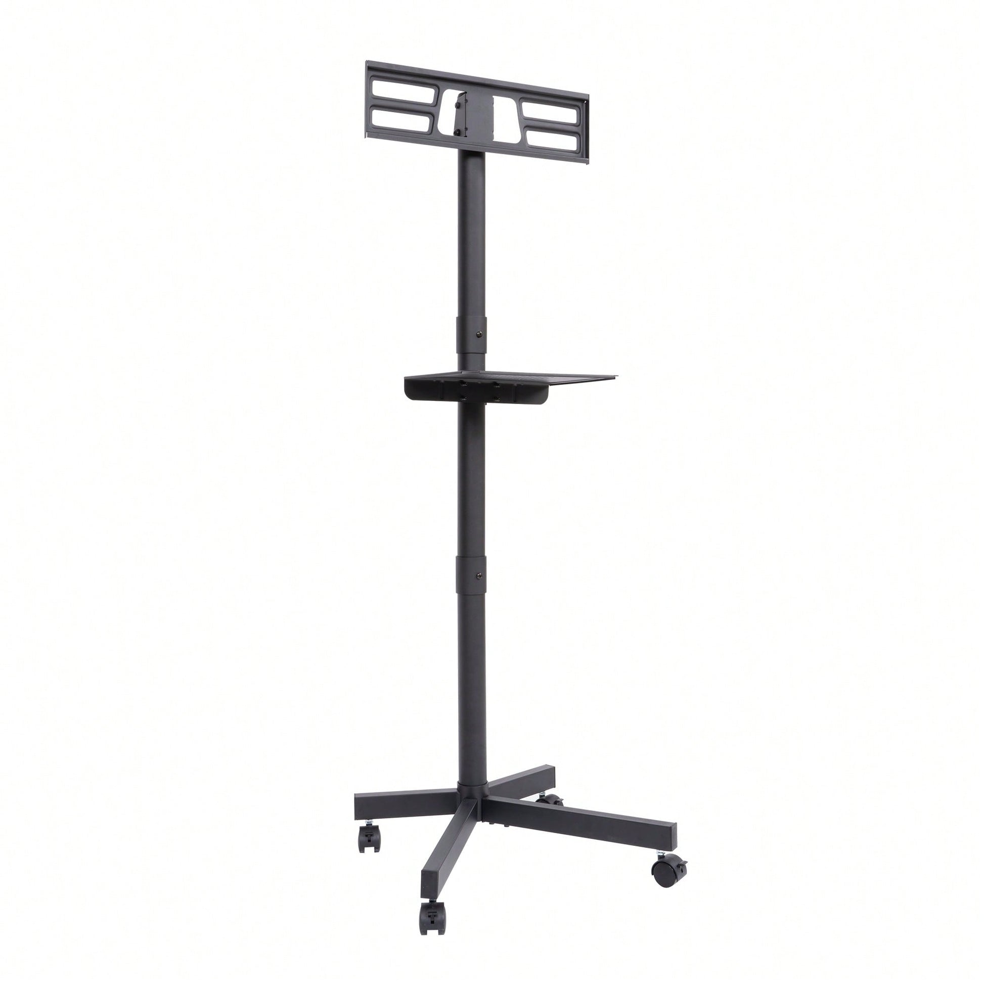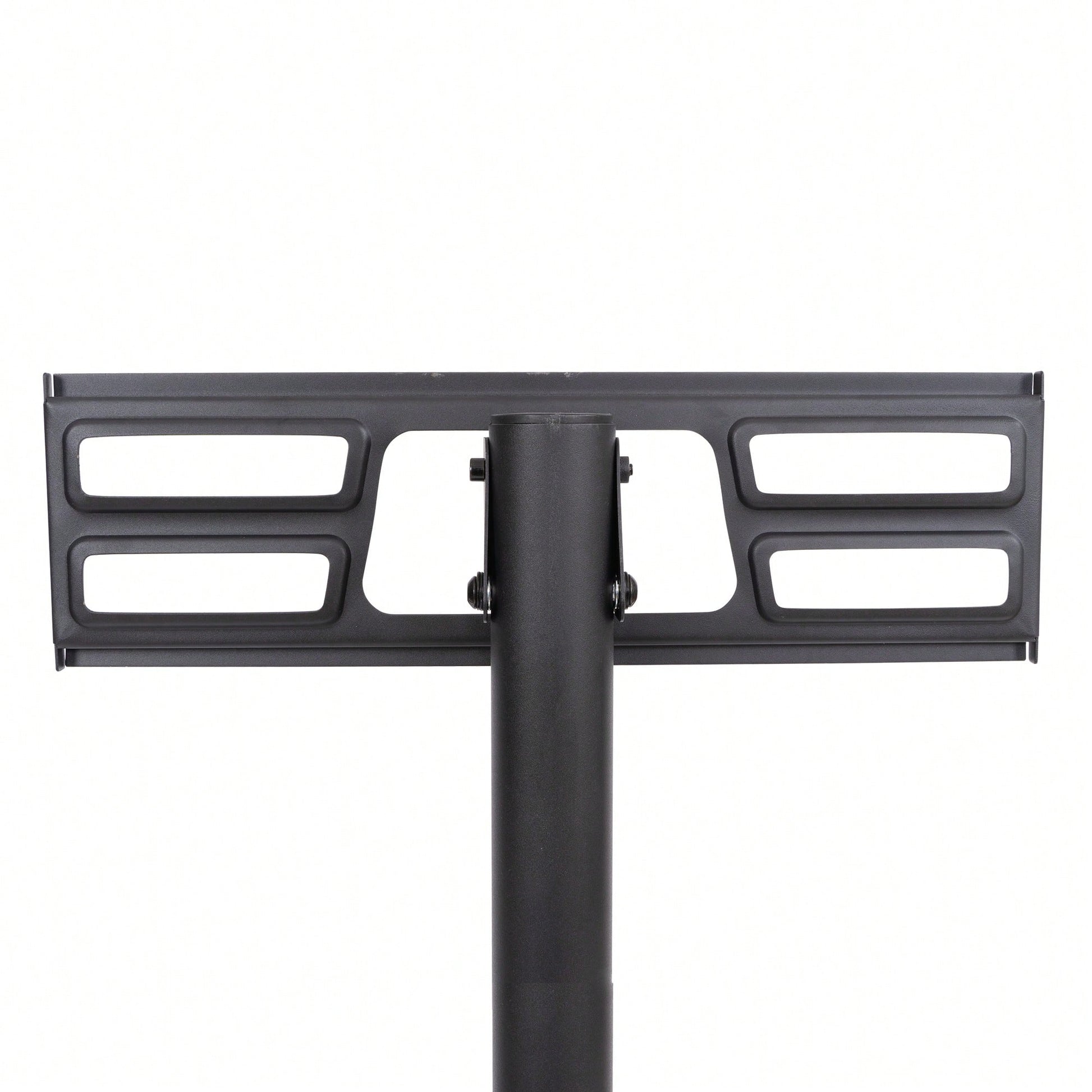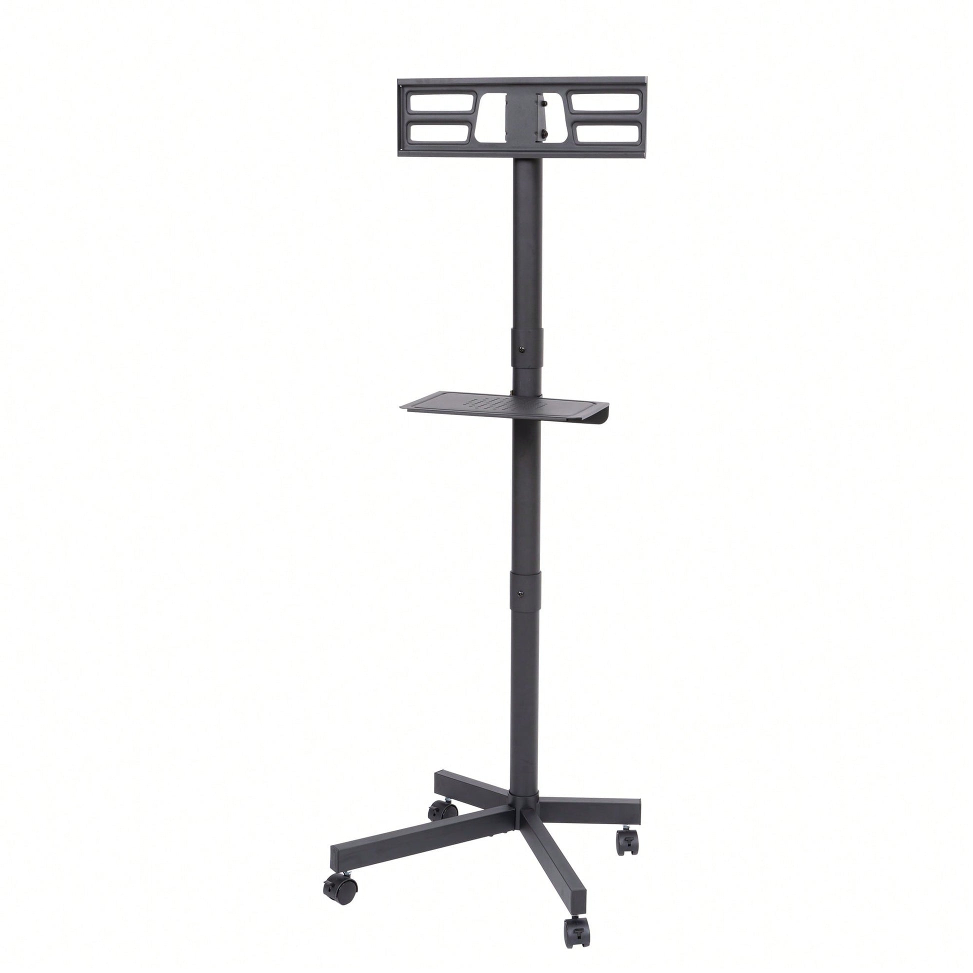Additionally, the stand includes an integrated cable management system to keep wires and cables organized and out of sight, contributing to a clean and tidy setup. Constructed from high-quality steel, this rolling TV stand combines functionality with a sleek design, making it an excellent choice for both personal and professional environments.