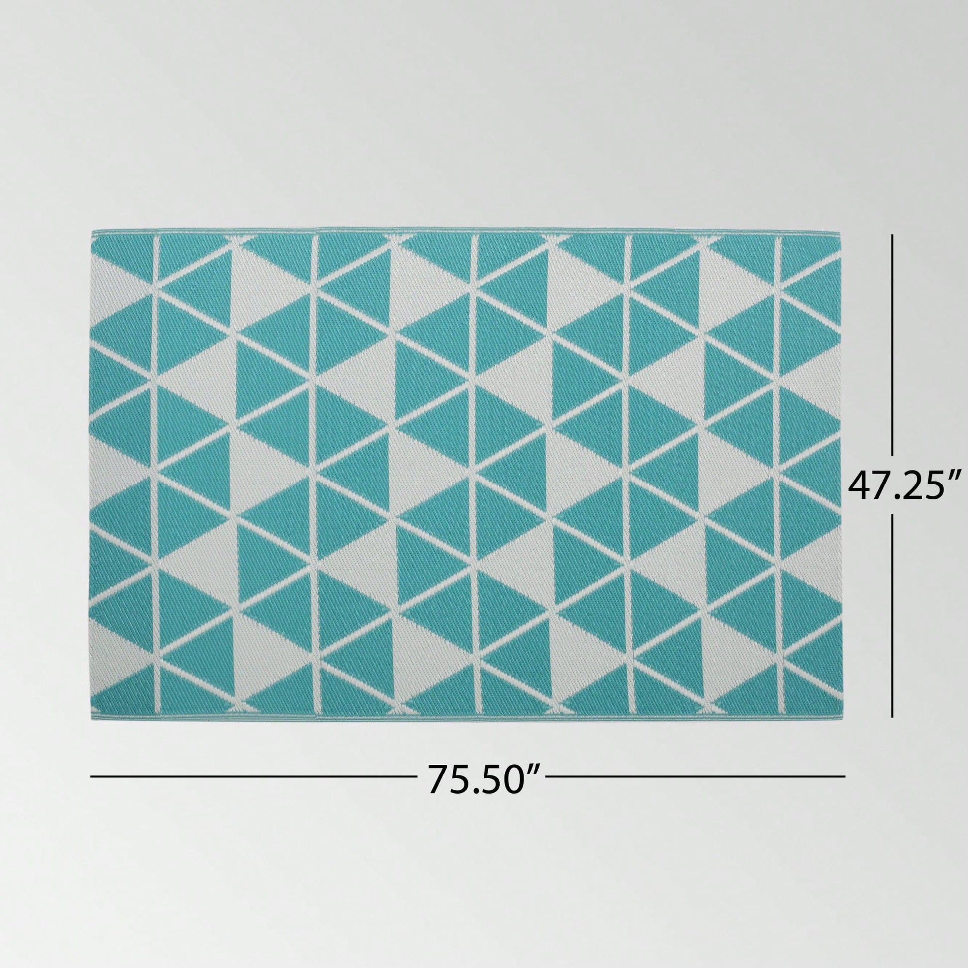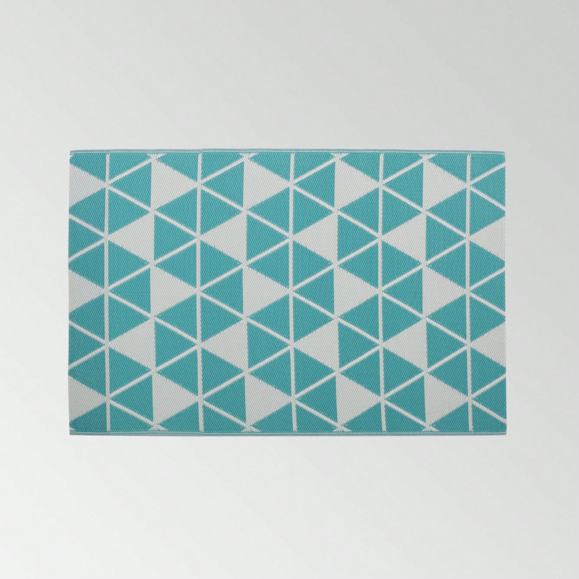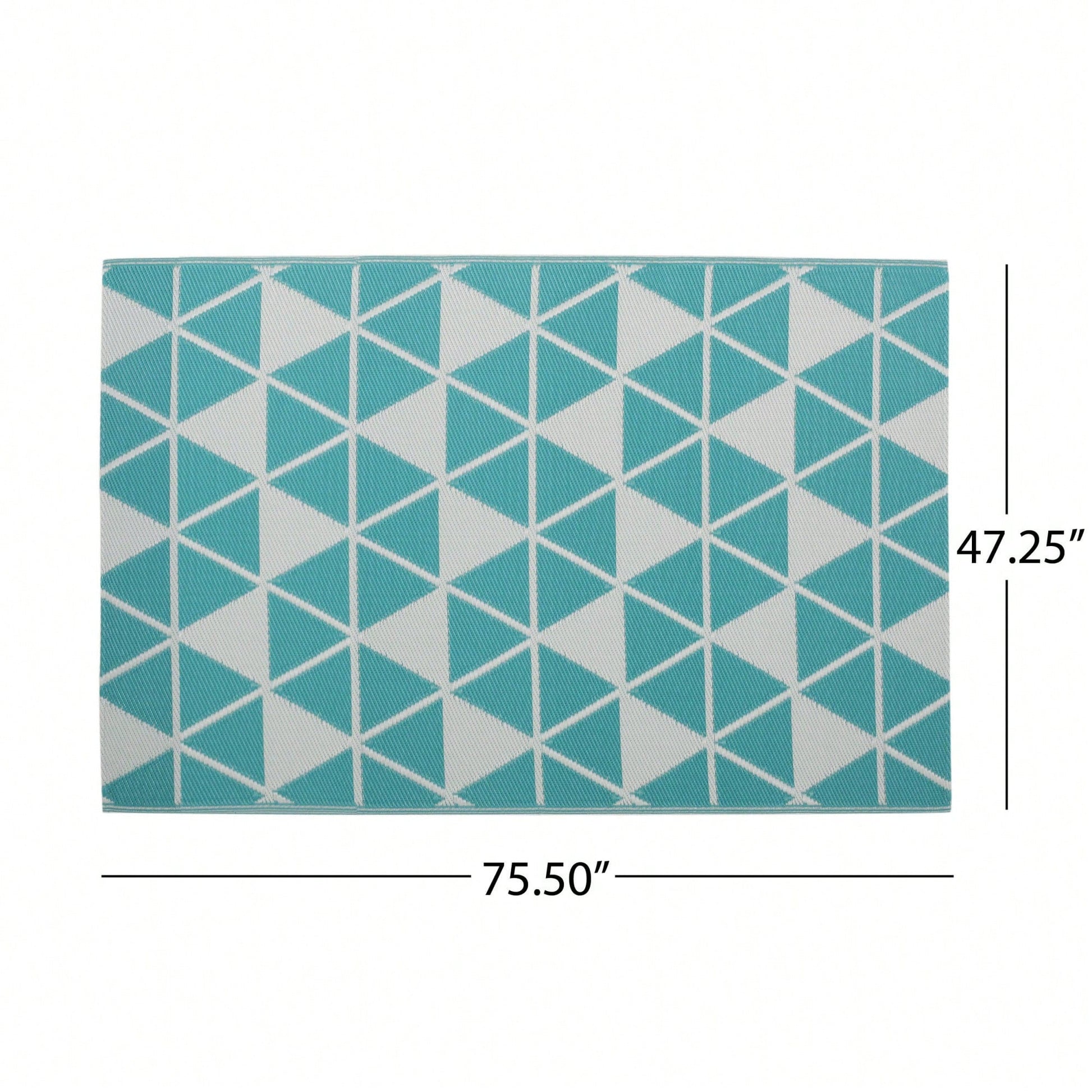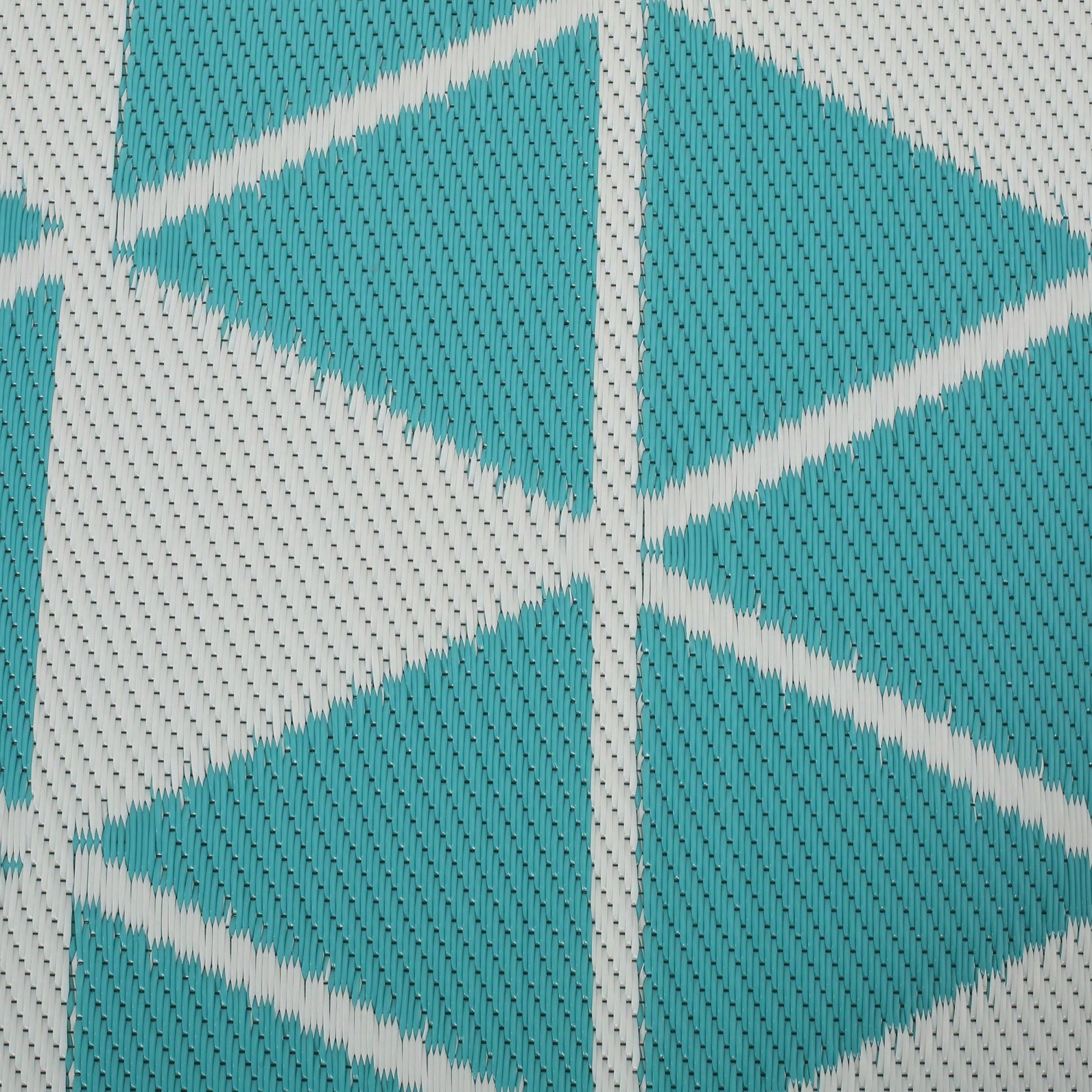 Transform your outdoor space with this beautiful herringbone rug. Featuring vibrant turquoise and white colors, this hand-crafted rug adds a touch of elegance to any backyard setting. Made from durable PVC strands, it is designed to withstand the elements while providing a stylish outdoor experience. With no assembly required, you can easily enhance your outdoor decor in no time.