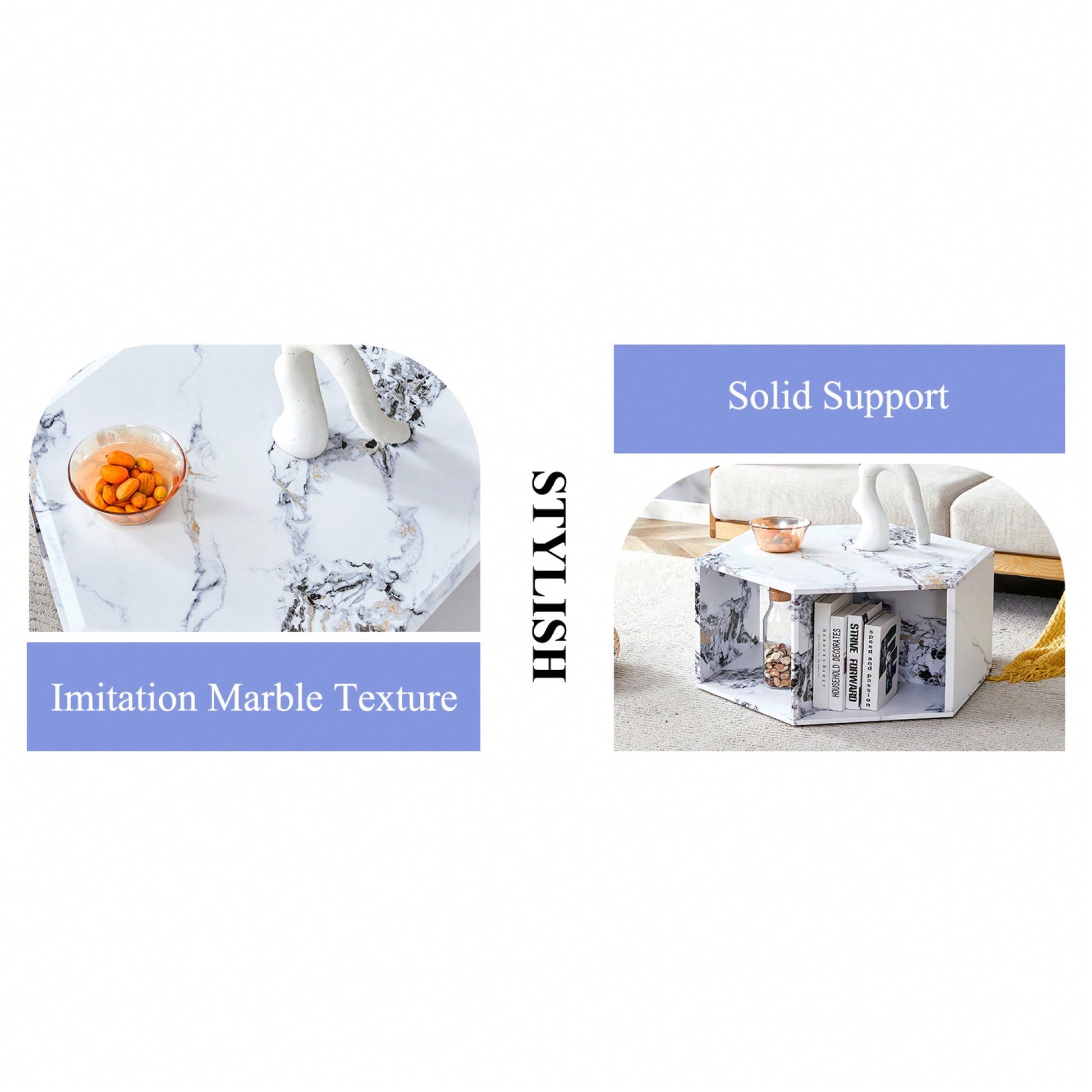 **Key Features:** - Hexagonal design with characteristic pattern stickers - Multi-hole design for enhanced storage space - Smooth MDF surface, easy to clean and maintain - Stable and load-bearing with modern contours - Space-saving stand-up design, ideal for small apartments **Product Description:** This uniquely designed coffee table combines functionality and aesthetics, making it a perfect addition to any modern home. With its hexagonal shape and characteristic pattern stickers, it adds a stylish touch while offering ample storage through its multi-hole design. The smooth MDF surface ensures easy cleaning and maintenance, while its durability guarantees long-lasting use. The clean lines and modern contours provide an elegant feel, enhancing the overall decor of your living space. Available in white, wood color, and black, this coffee table caters to various personal styles. Assembly is straightforward, with included instructions and tools, allowing most users to set it up in just 10-15 minutes. **Specifications:** - Material: MDF - Color Options: White, Wood Color, Black - Assembly Time: 10-15 minutes - Design: Stand-up for space-saving