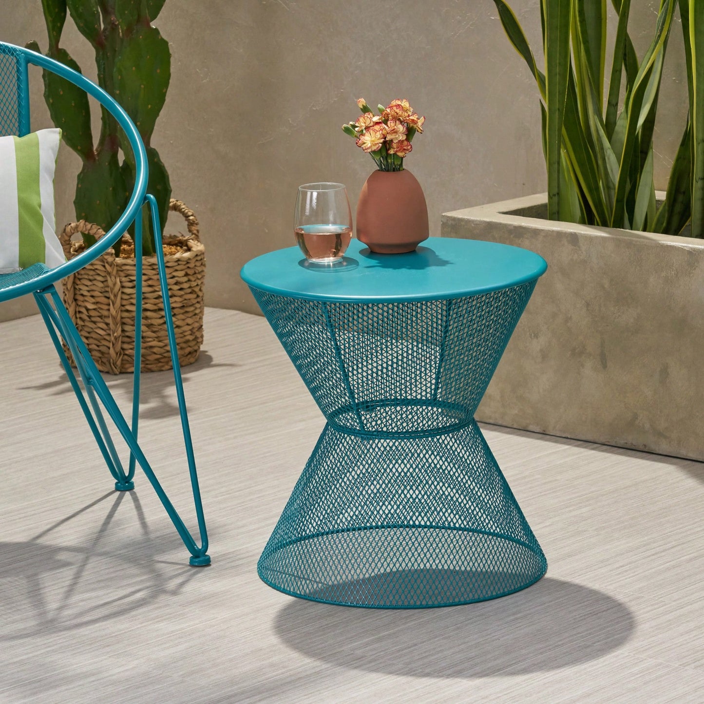 This side table is designed for both style and functionality, making it an ideal addition to your outdoor space. Its bold hourglass shape and breezy mesh design create a striking visual appeal that complements various furniture styles. Crafted with a durable iron frame, this table promises longevity while maintaining a refreshing aesthetic. Perfect for holding drinks or books, it enhances your patio experience, inviting relaxation under the sun. Its versatile design allows it to seamlessly fit into eclectic or modern settings.