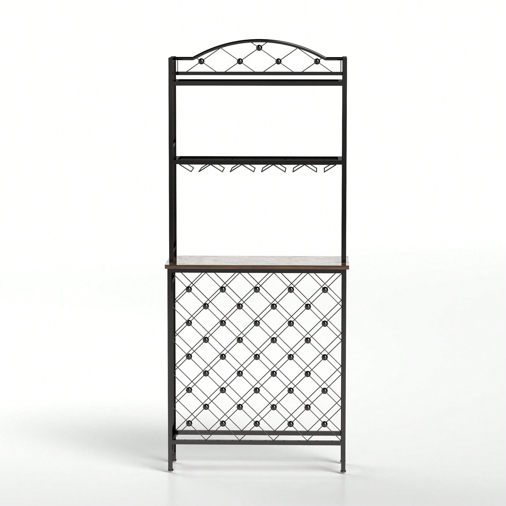 This industrial wine rack bar table features a 3-tier design, providing ample storage space for your wine collection. The top shelf is perfect for displaying bottles and glasses, while the middle shelf includes a glass holder for hanging wine glasses. The bottom shelf can accommodate up to 20 bottles, making it ideal for various home settings such as the kitchen, dining room, or living room. The combination of a sturdy metal frame and a warm wooden tabletop showcases a classic industrial style, enhancing both functionality and aesthetics.
