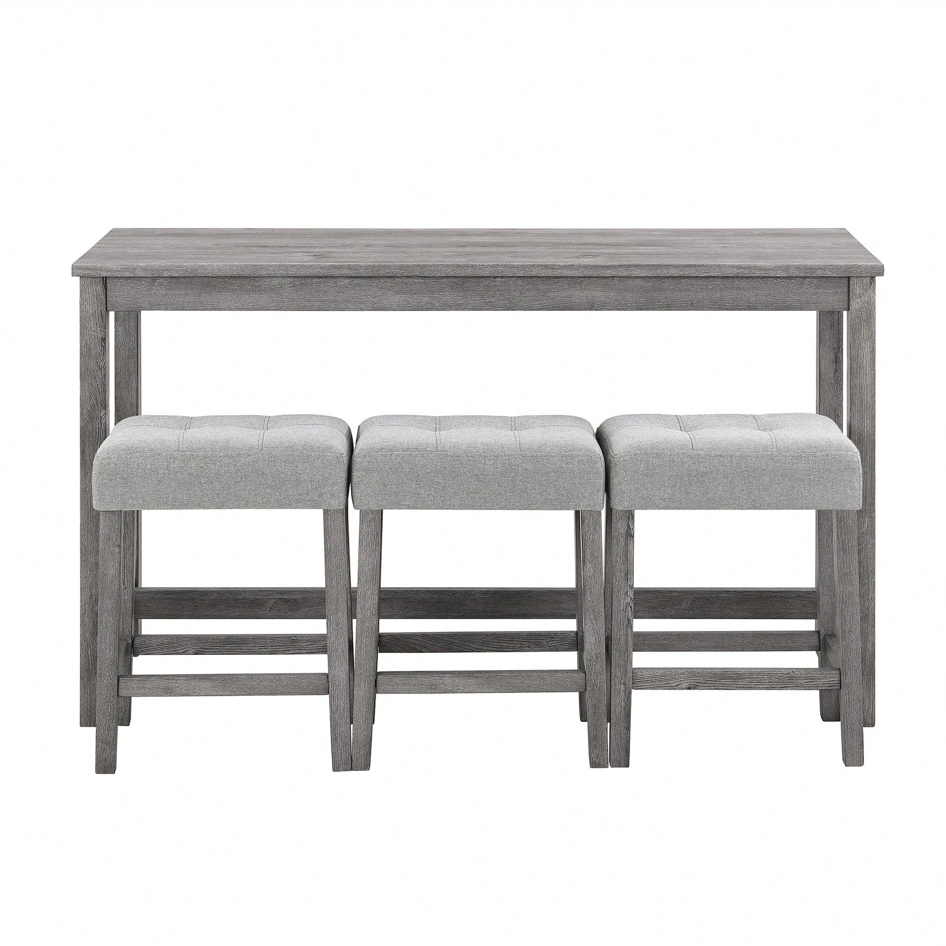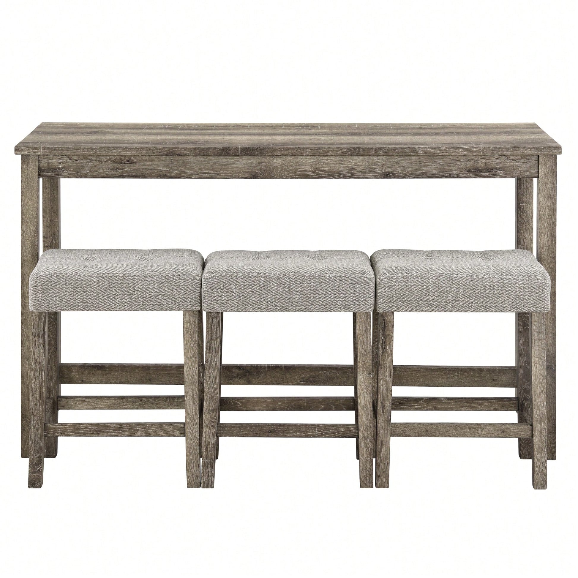 This bar table set features an elegant industrial design with a high-quality imitation wood grain surface, making it an ideal addition to kitchens, gaming rooms, or living rooms. The set includes three bar stools that can be neatly tucked under the table when not in use, maximizing space while enhancing aesthetics. The stools are designed for comfort, equipped with soft fabric and curved cushions, allowing for extended periods of sitting without discomfort. Constructed from durable MDF and high elasticity foam, the materials used in this set ensure longevity and ease of maintenance. Assembly is straightforward, with all hardware included and easy-to-follow instructions provided.