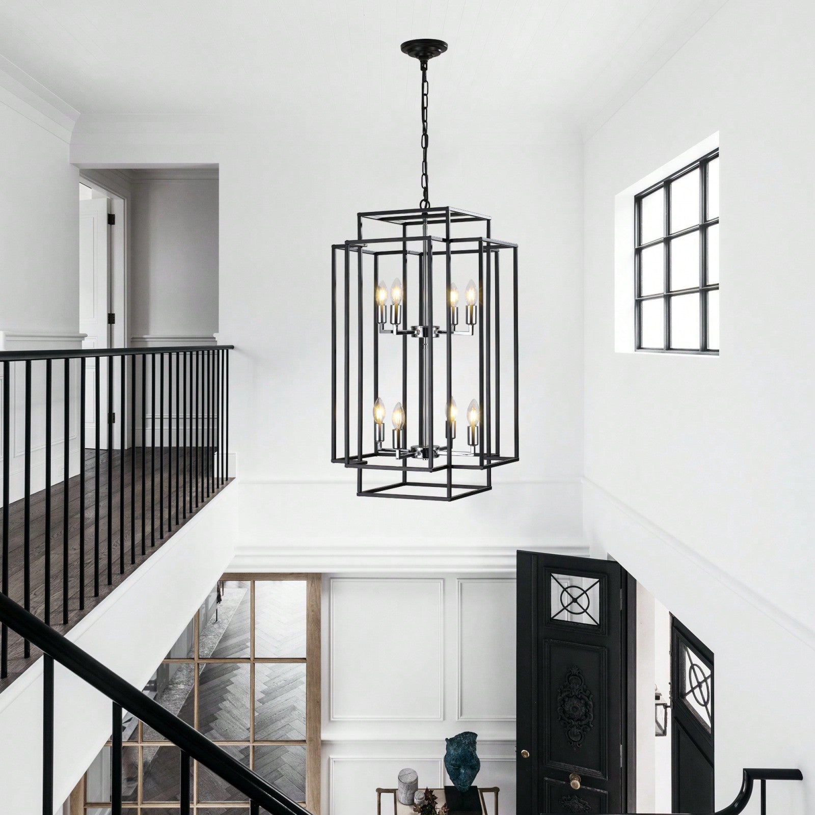 This pendant light fixture features a black geometric frame with a gold central lamp base, adding a touch of industrial farmhouse style to any space. It is a stylish and versatile lighting option for entryways, living rooms, kitchen islands, staircases, and more. The adjustable boom allows for easy customization of the height, while the durable metal frame ensures long-lasting quality. With a sleek design that complements any decor style, this lantern tiered pendant light fixture is a popular choice among customers looking to update their lighting.
