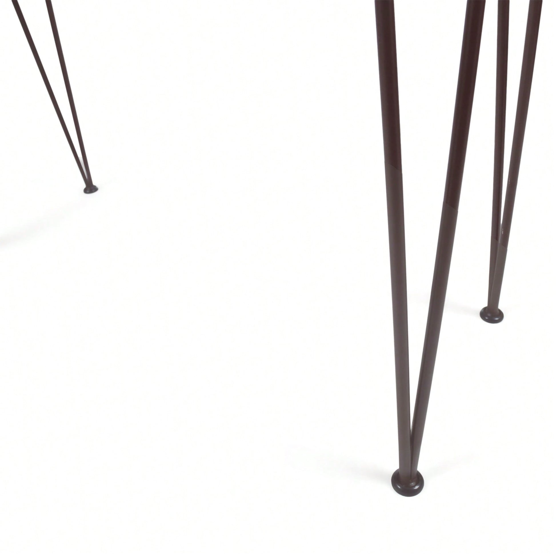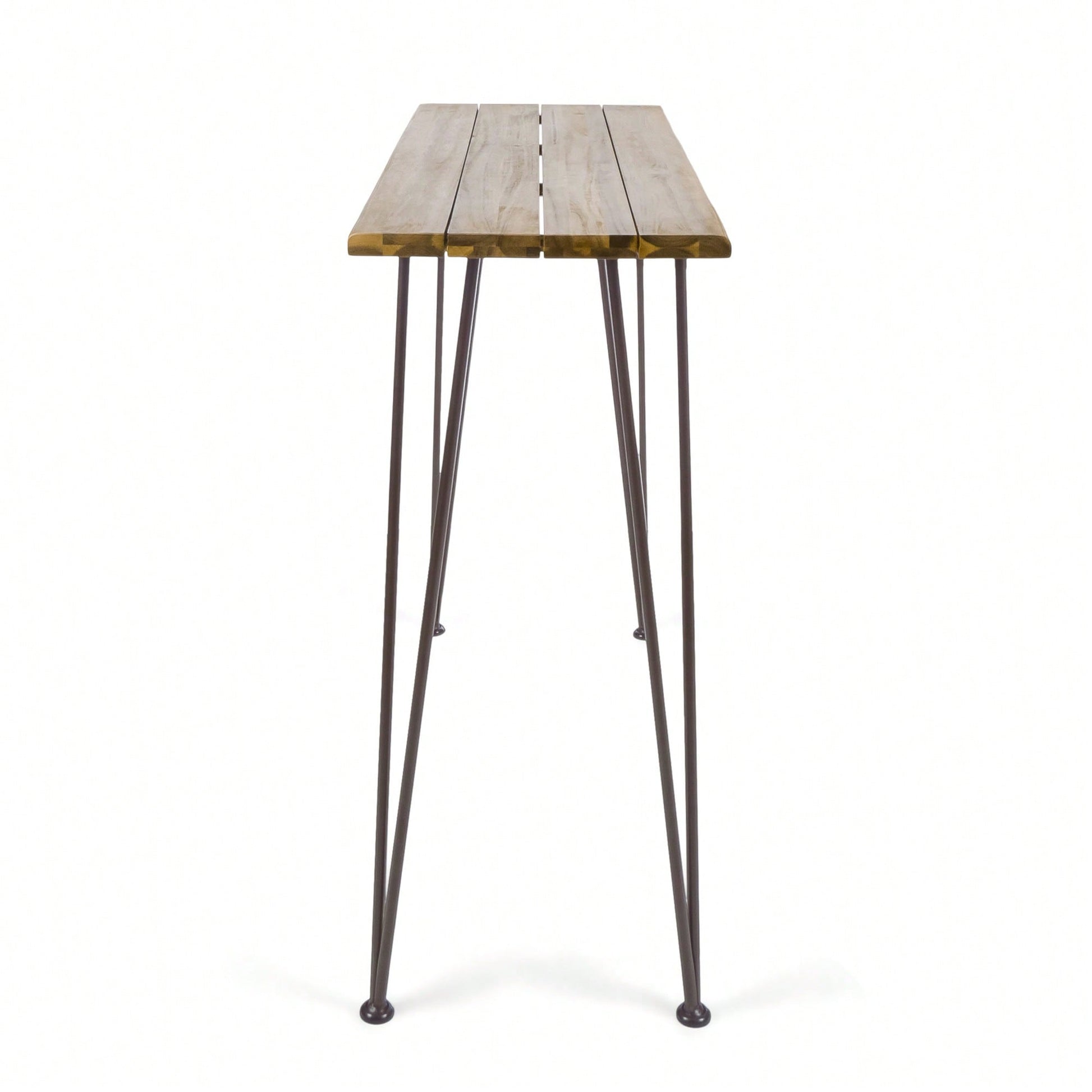 Set the mood with this attractive bar table, crafted from acacia wood and sturdy wrought iron. This piece is designed to withstand the elements while maintaining its aesthetic appeal for years. The industrial-style acacia wood tabletop is complemented by a rustic metal frame, making it a perfect addition to your outdoor space. With its smooth surface and stylish hairpin legs, this table is ideal for gatherings and entertaining guests outdoors.