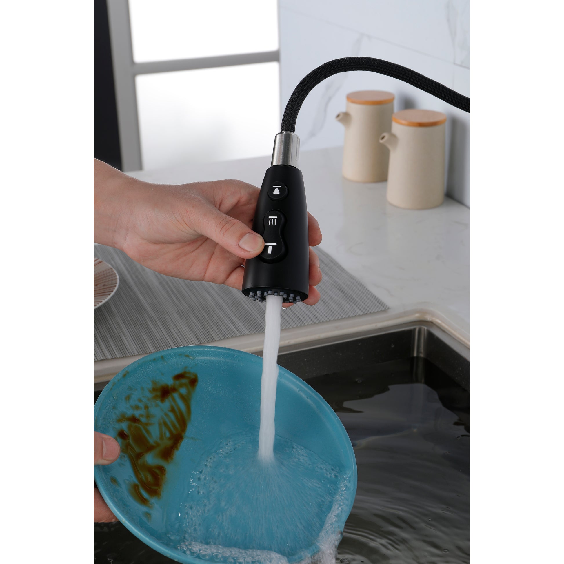 This modern kitchen faucet combines elegance with functionality, featuring a sleek matte black finish that makes it a stylish addition to any kitchen. The pull-down sprayer offers versatility for handling a variety of tasks, such as washing dishes or filling pots. Designed with user convenience in mind, this faucet includes a single handle that allows for easy control of both water flow and temperature. Installation is straightforward, with professional instructions provided, enabling you to set up the faucet in just 30 minutes. Its clean aesthetic and practical design ensure that it enhances the overall style of your kitchen while providing high performance.