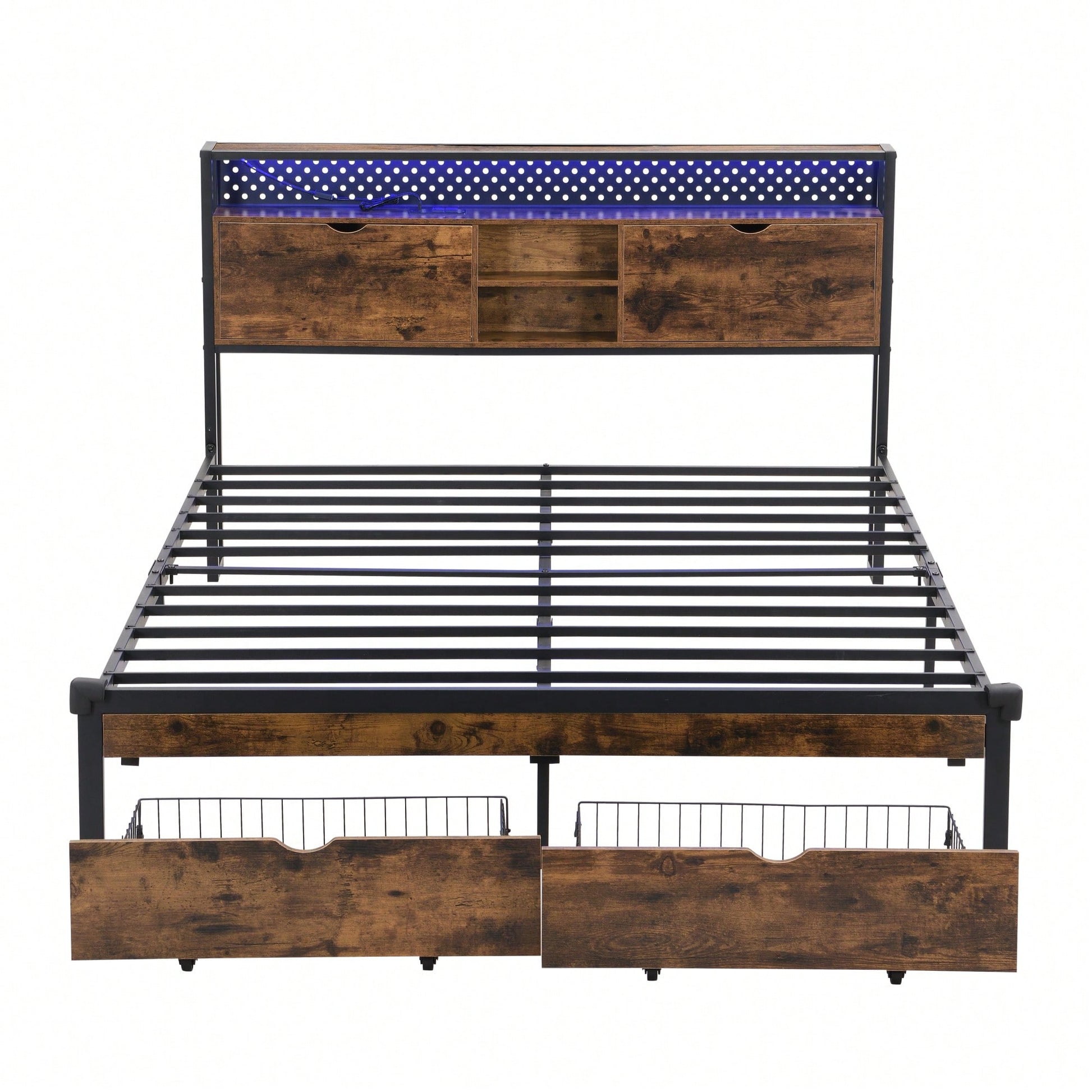 King Size Metal Platform Bed Frame with Wooden Headboard USB Charging Station Storage Drawers LED Lights Easy Assembly No Box Spring Needed
