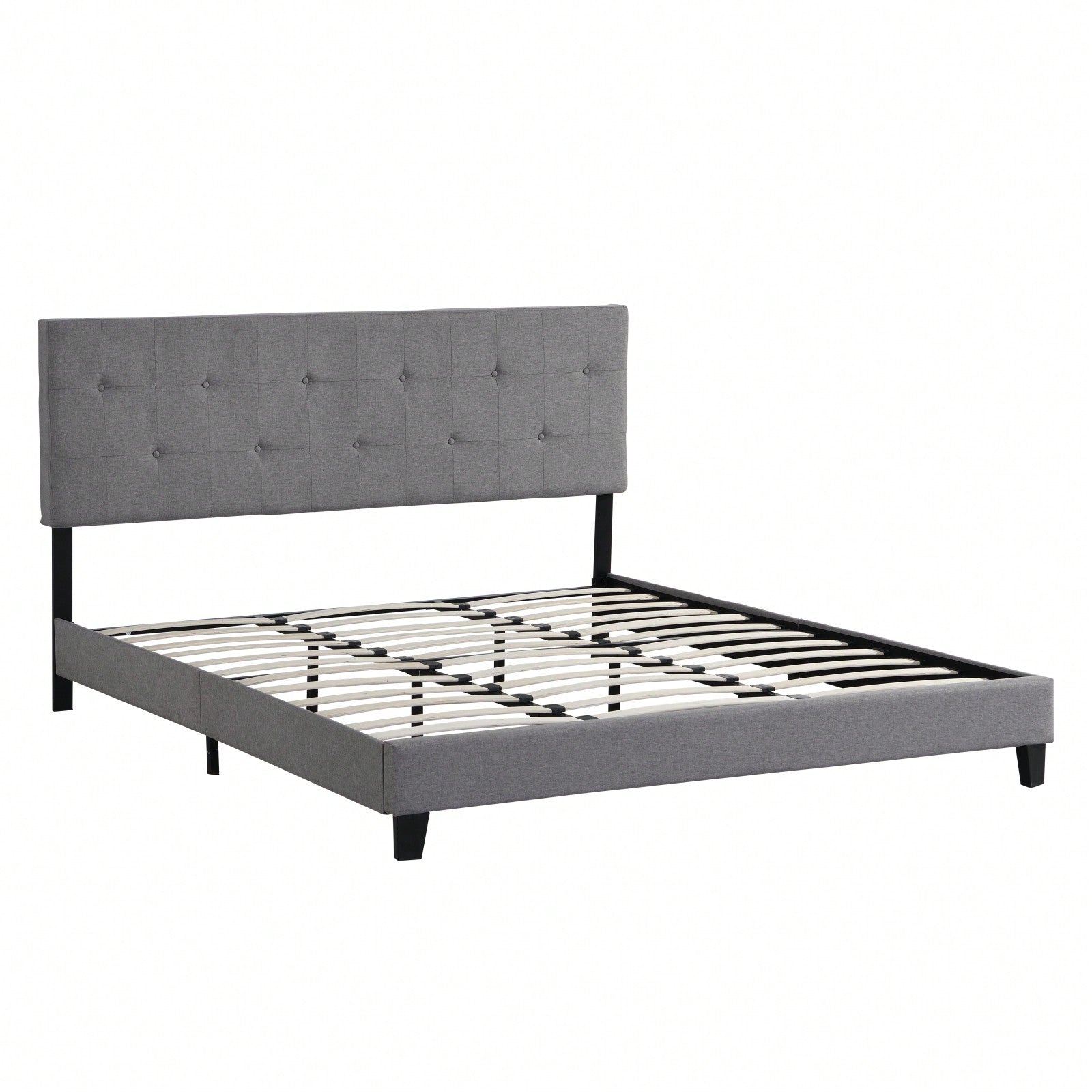 King Size Upholstered Platform Bed Frame With Button Tufted Linen Fabric Headboard, No Box Spring Needed, Wood Slat Support, Easy Assembly