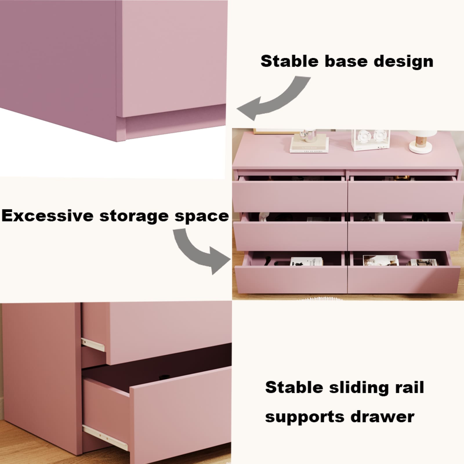 This large six-drawer dresser combines functionality and style, making it a perfect addition to any bedroom or guest room. The warm pink hue and minimalist design create a cozy atmosphere, while the smooth sliding drawers provide ample storage for clothes, linens, and other essentials. Crafted from engineered wood and decorative laminate, this dresser is both durable and aesthetically. The matte white hardware adds a modern touch, enhancing its overall appeal. Assembly is straightforward with included instructions, although it is recommended that two people work together for best results.