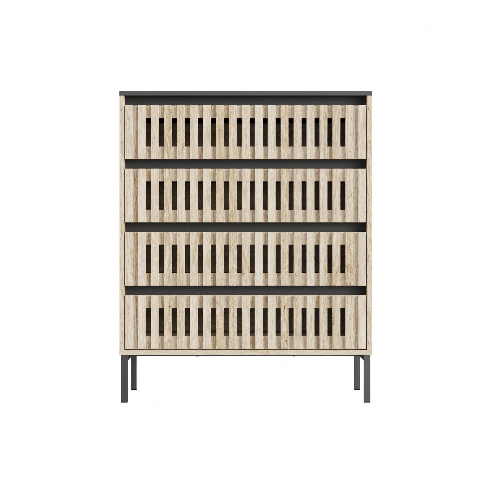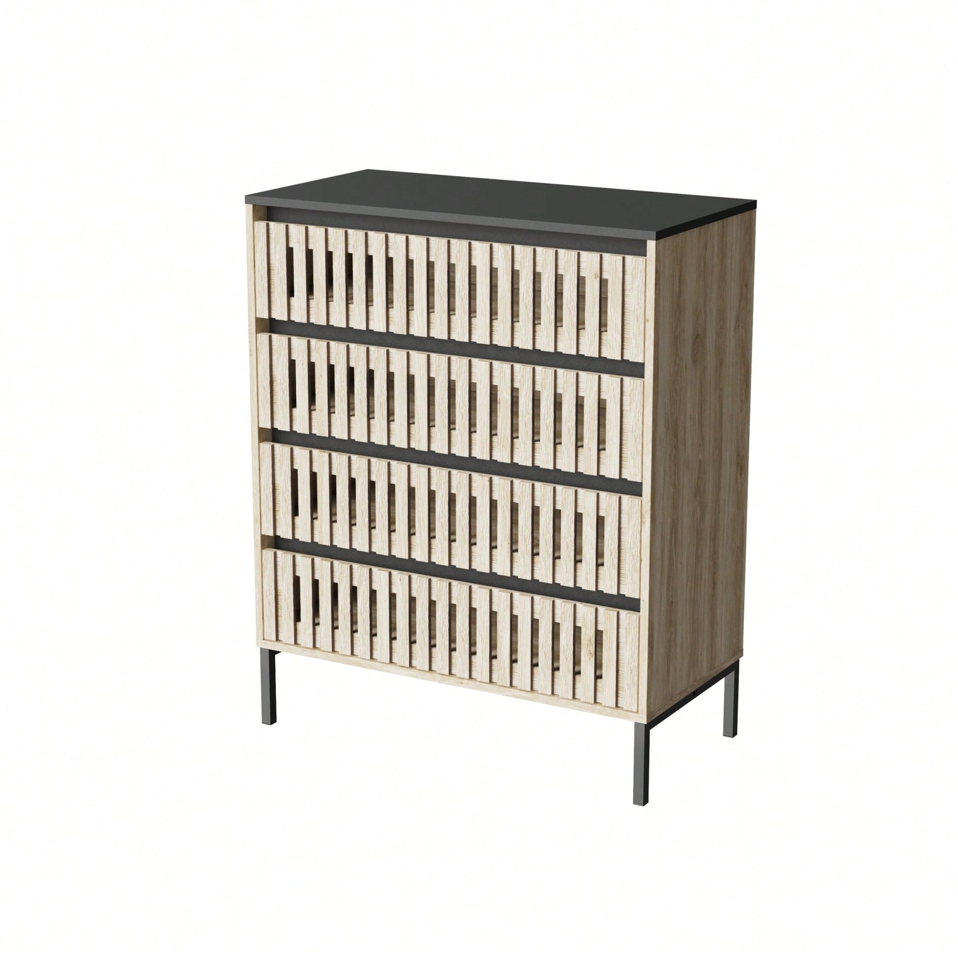 This freestanding four-drawer storage cabinet combines modern and classic aesthetics with its striking two-tone design. The bold contrast between the black top and warm teak-colored body makes it a versatile addition to any room, effortlessly blending with various interior styles. Each of the four large drawers glides smoothly, providing ample space for organizing clothing, accessories, or household essentials. The unique slatted design on the drawer fronts enhances its refined appearance, while the high-quality materials ensure durability and stability for daily use. Ideal for use in bedrooms, hallways, or living rooms, this chest of drawers offers both style and practicality, making it a perfect choice for those who value form and function in their home furnishings.