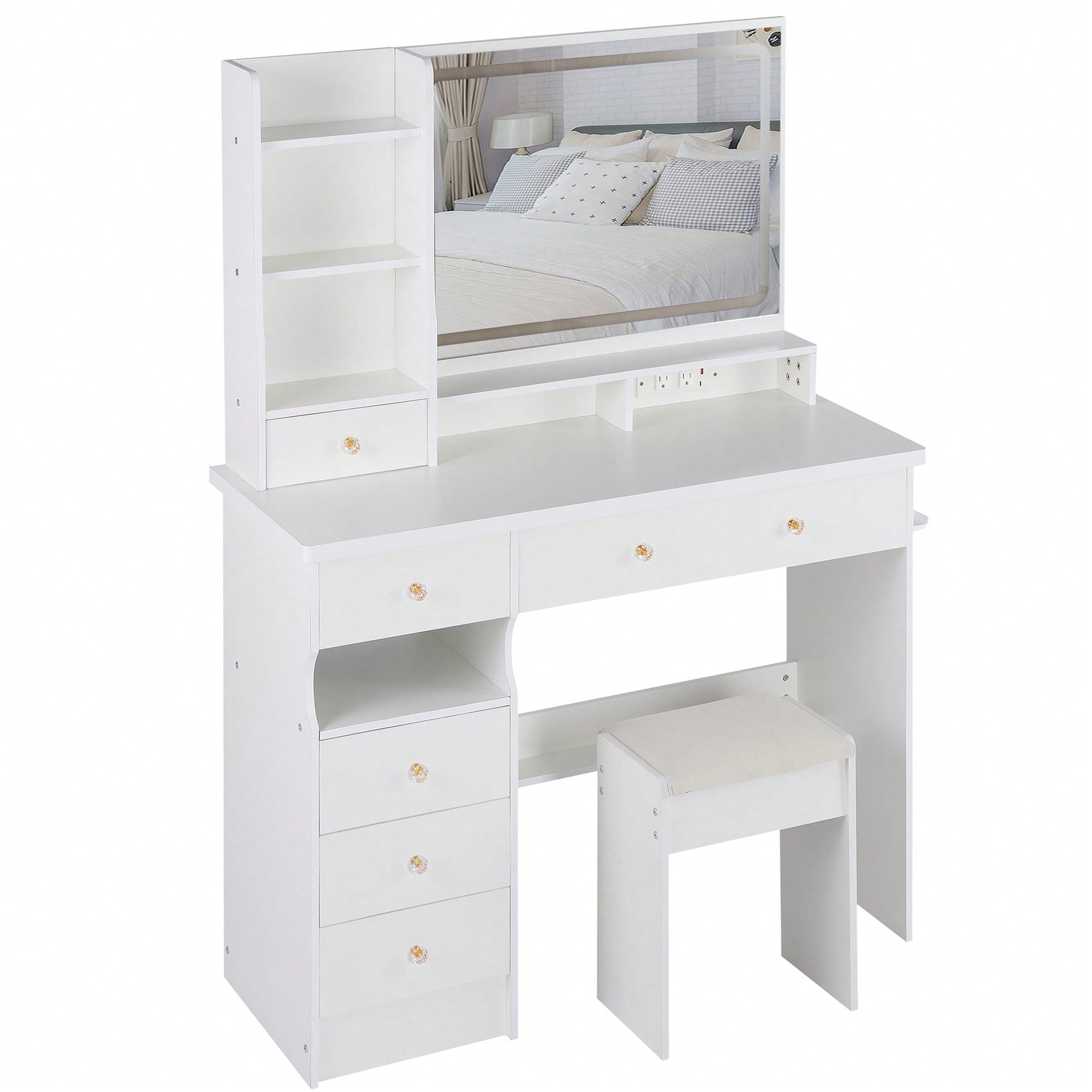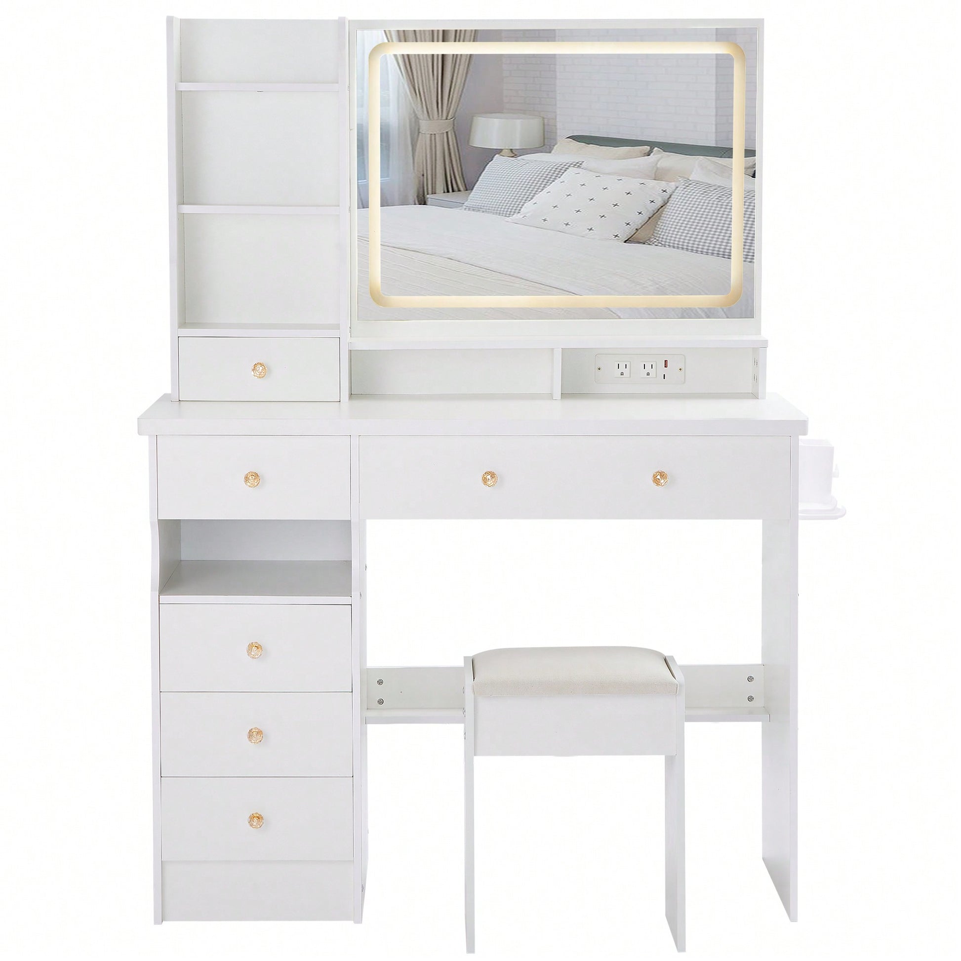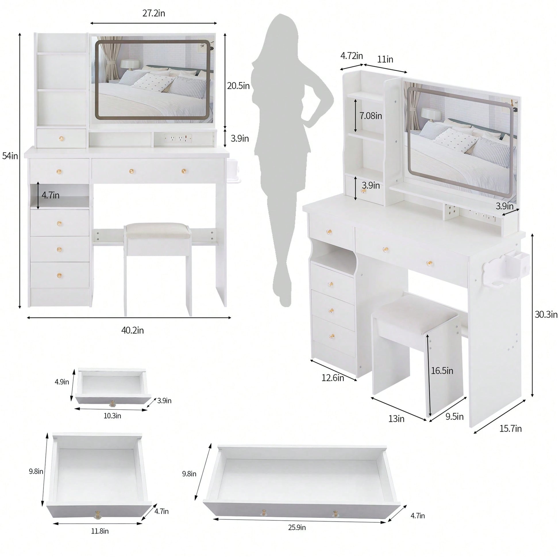 This large size vanity table measures 41" in length, 15.7" in width, and 54" in height, featuring a 27"x20" vanity mirror. It offers ample space for adult use and requires sufficient room for setup. The touch switch on the mirror allows you to select from white, natural, and warm light, with brightness adjustment available. The built-in power station includes 2 AC outlets and 2 USB ports, enabling simultaneous use of devices like hair dryers and curlers. The set comes with a cushioned stool, eliminating the need for separate purchases. Assembly may take approximately 2 hours, and while minor defects may occur during shipping, replacements are guaranteed for any boards that affect appearance.