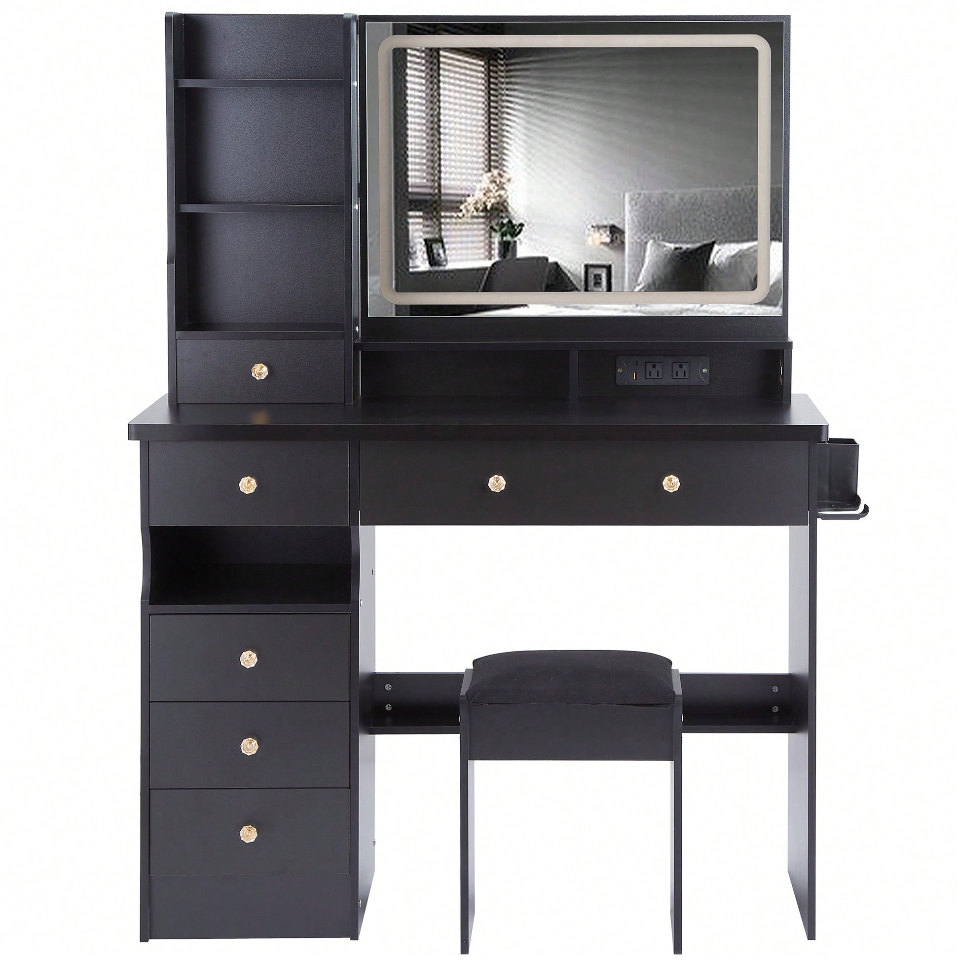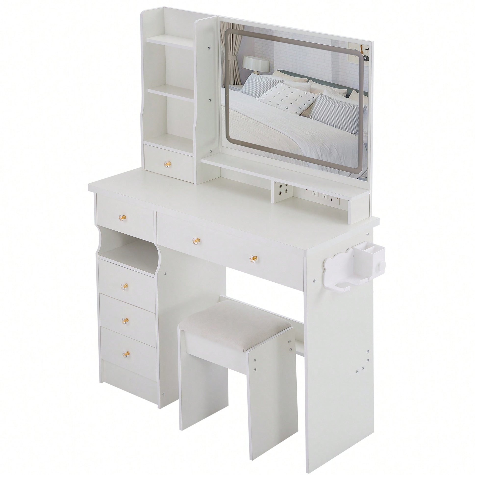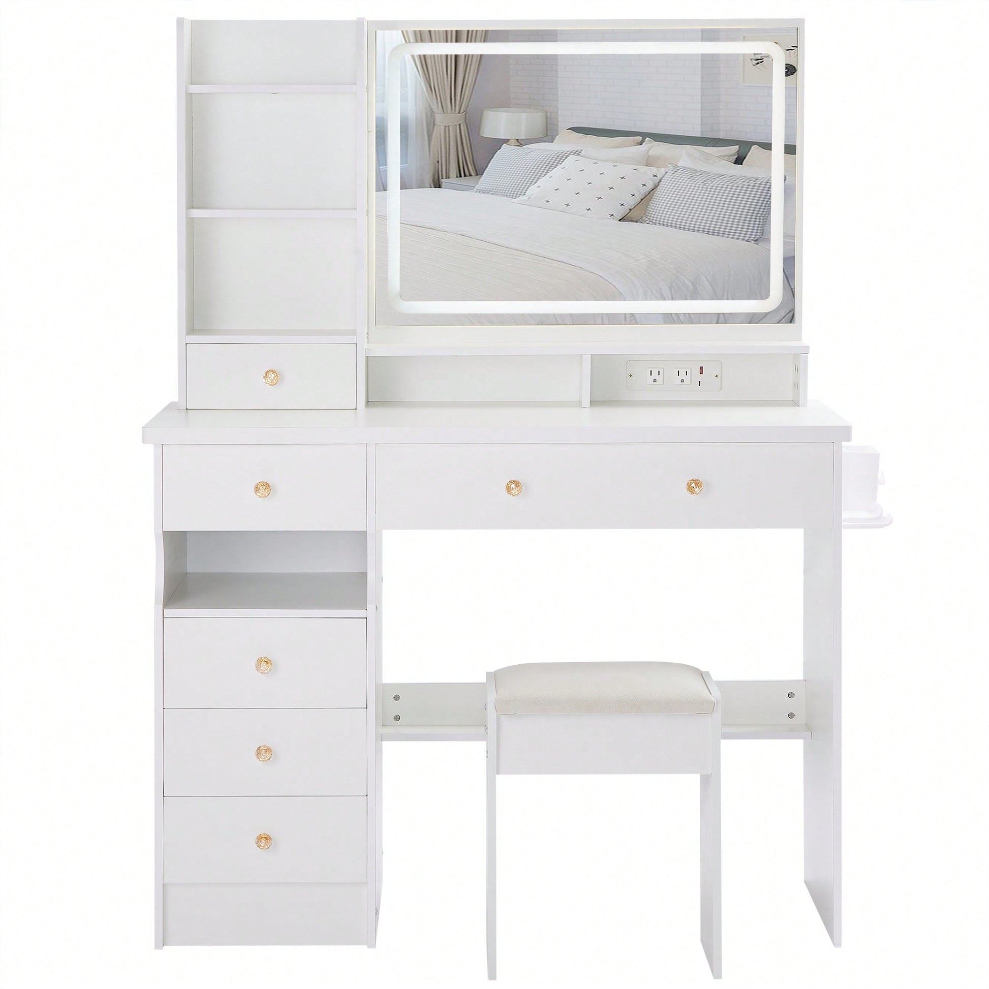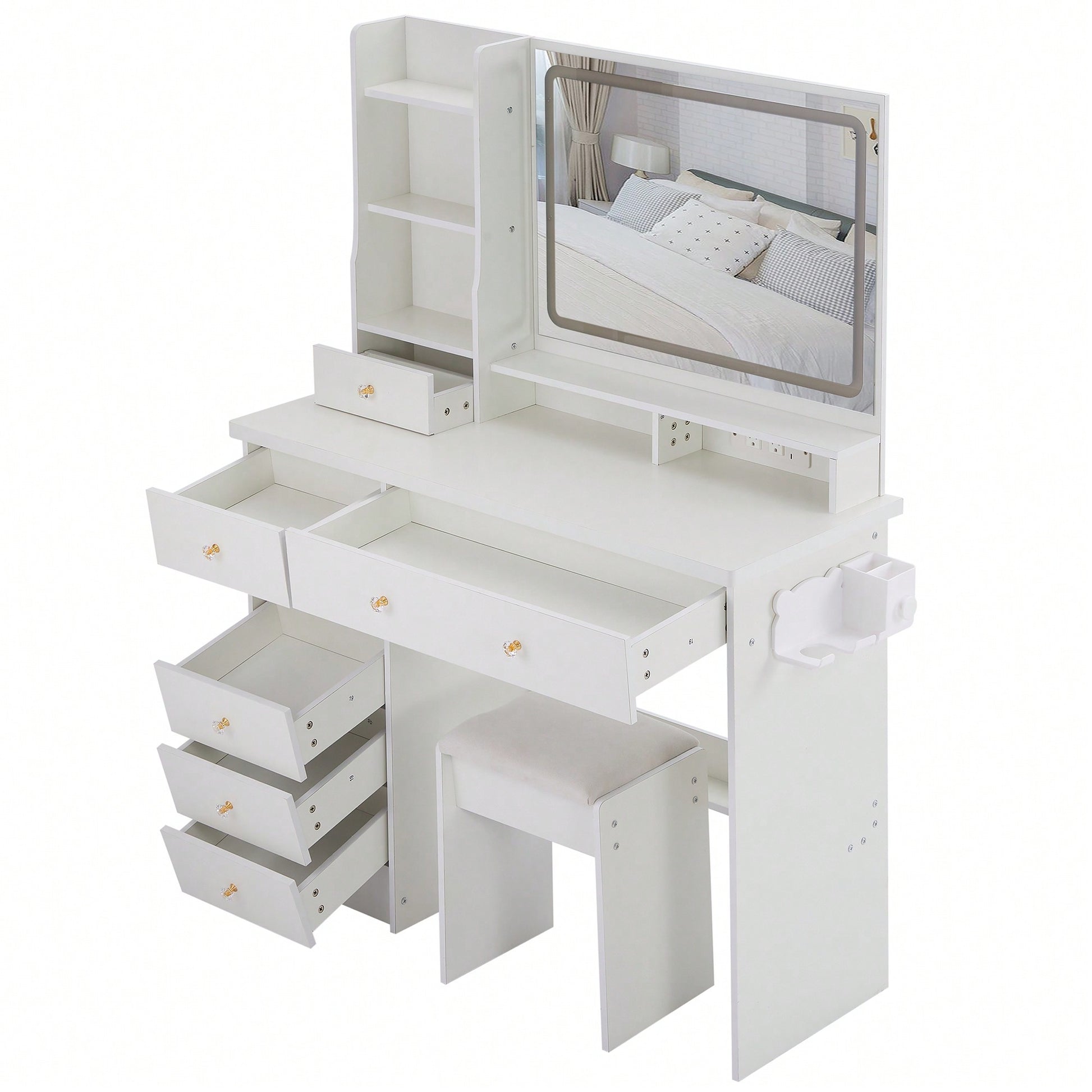 Large Vanity Table Set with Cushioned Stool, 2 AC Outlets, 2 USB Ports, Touch Control LED Mirror, 3 Color Switch, Hair Dryer Stand