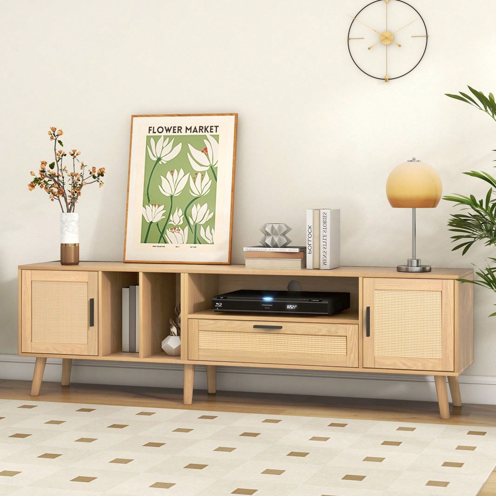 Spacious Rattan TV Stand for 80 Inch TVs with Storage Cabinets and Open Shelves - Stylish Media Console for Living Room and Home Theater