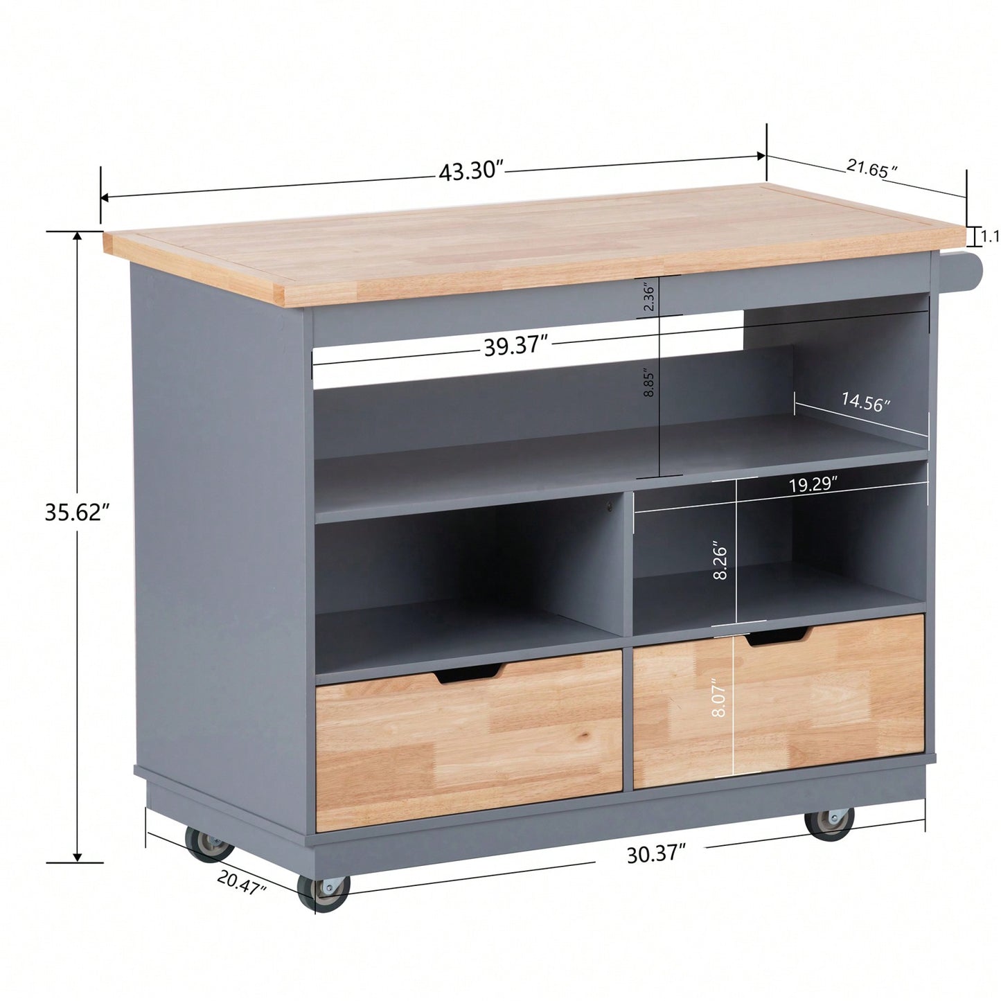 This versatile kitchen island combines spacious storage with mobility. It features three tiers of storage on one side, including two drawers and two open compartments. The spacious top is crafted from durable rubber wood, ideal for food preparation or serving. The island is finished with a protective varnish to resist scratches and spills. Four 360-degree swivel wheels, two of which lock, make it easy to maneuver the island around your kitchen and secure it in place when needed. The island's simple design complements a variety of kitchen styles.