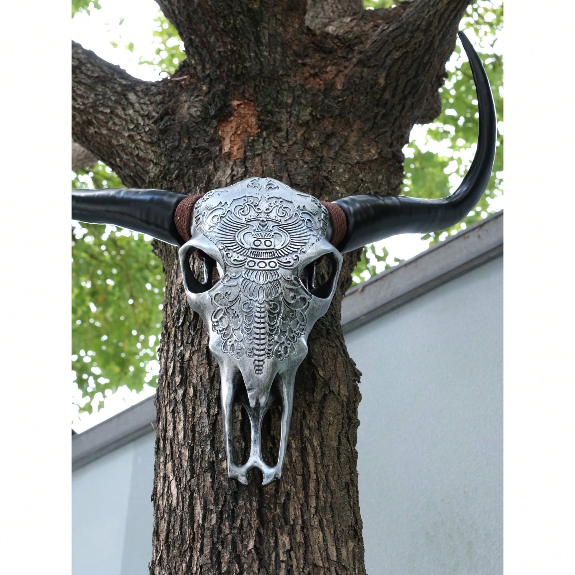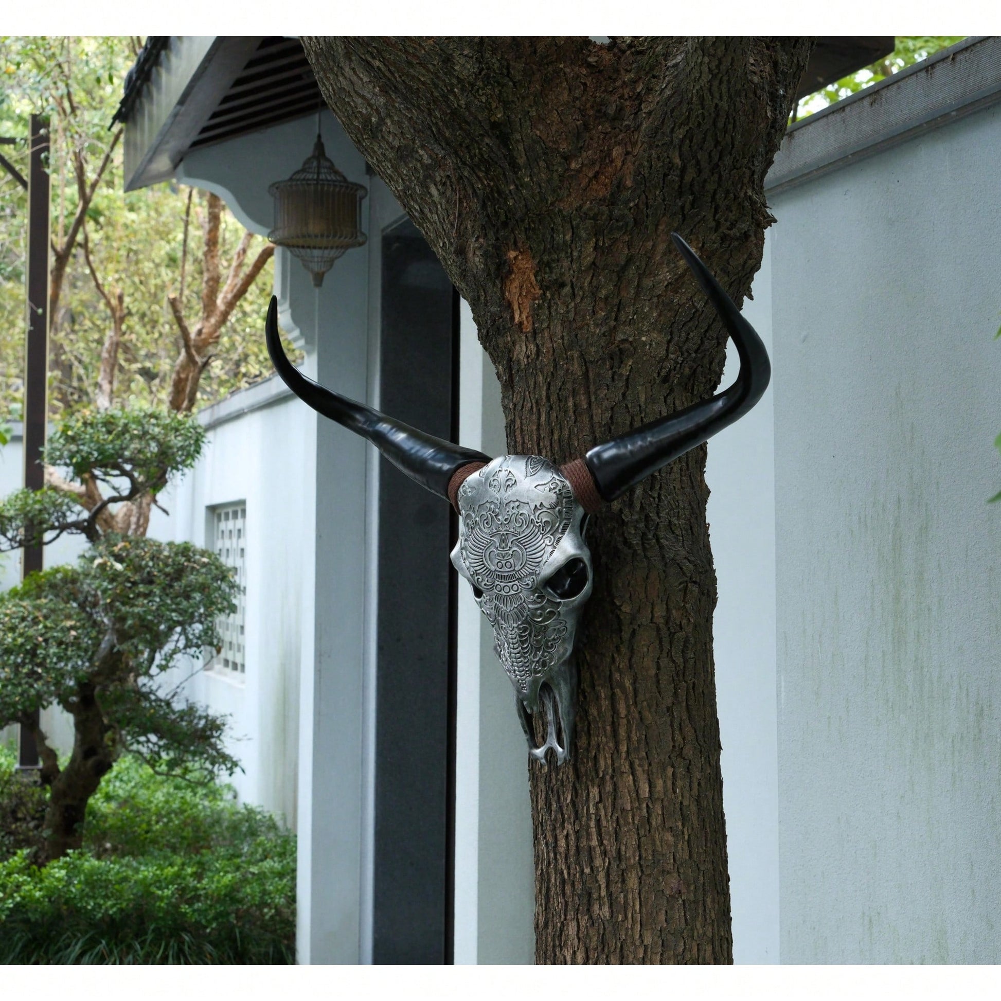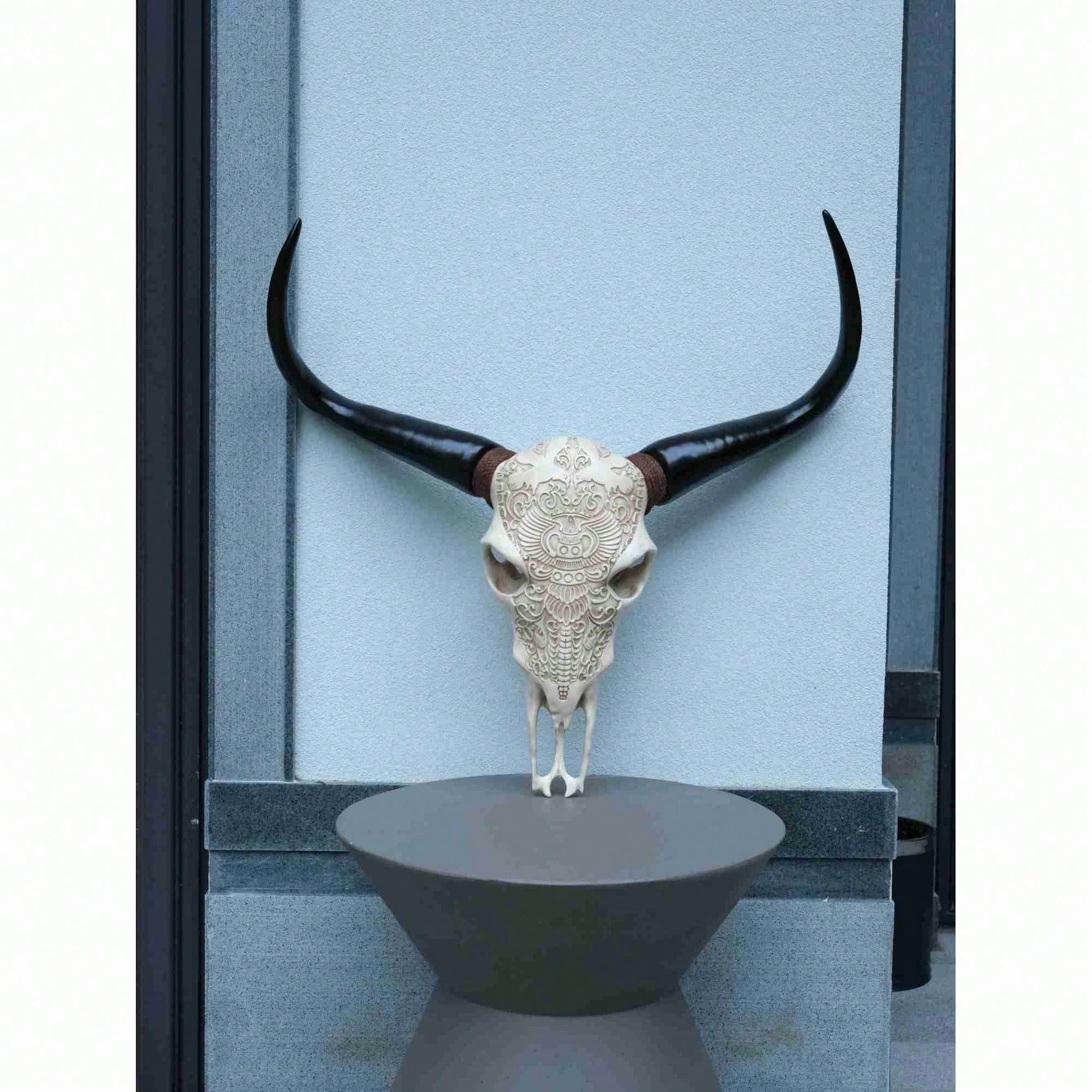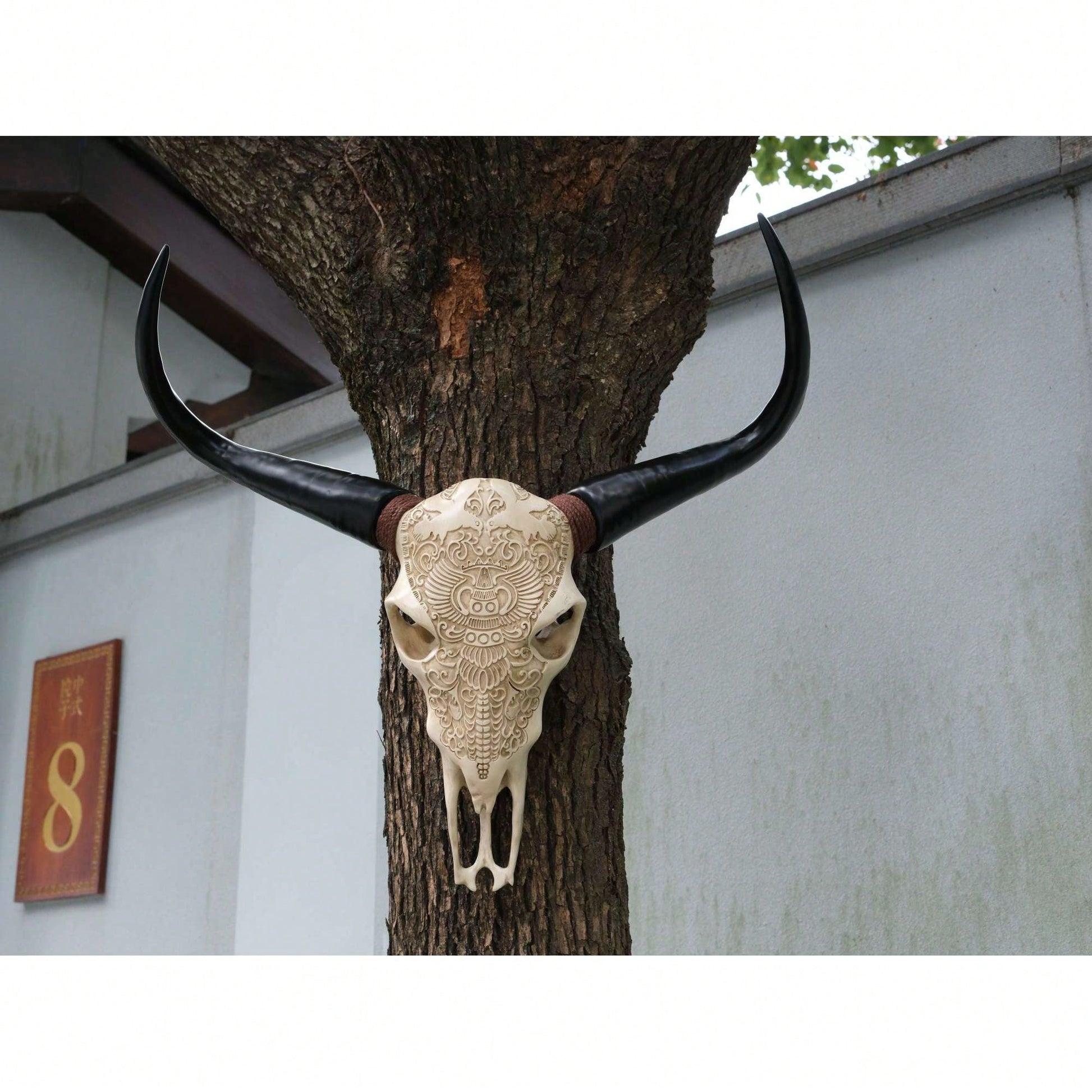 This bone-inspired bull head hanging ornament is a stunning piece of resin art that brings a touch of North American flair to any space. Crafted with exceptional attention to detail, it captures the essence of primal freedom and natural beauty. The lifelike representation of the bull head, from its intricate textures to its overall form, makes it a captivating decorative item. Perfect for enhancing the aesthetic of your home or office, this ornament is designed to impress and reflect the owner's distinctive style. Its three-dimensional design adds depth and realism, making it a striking focal point in any setting.