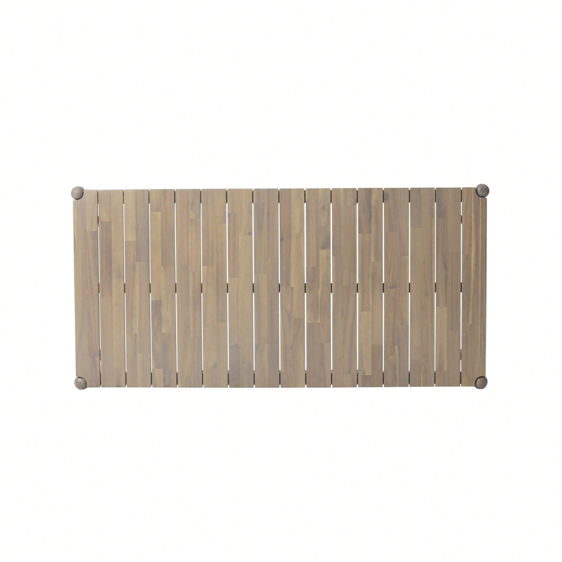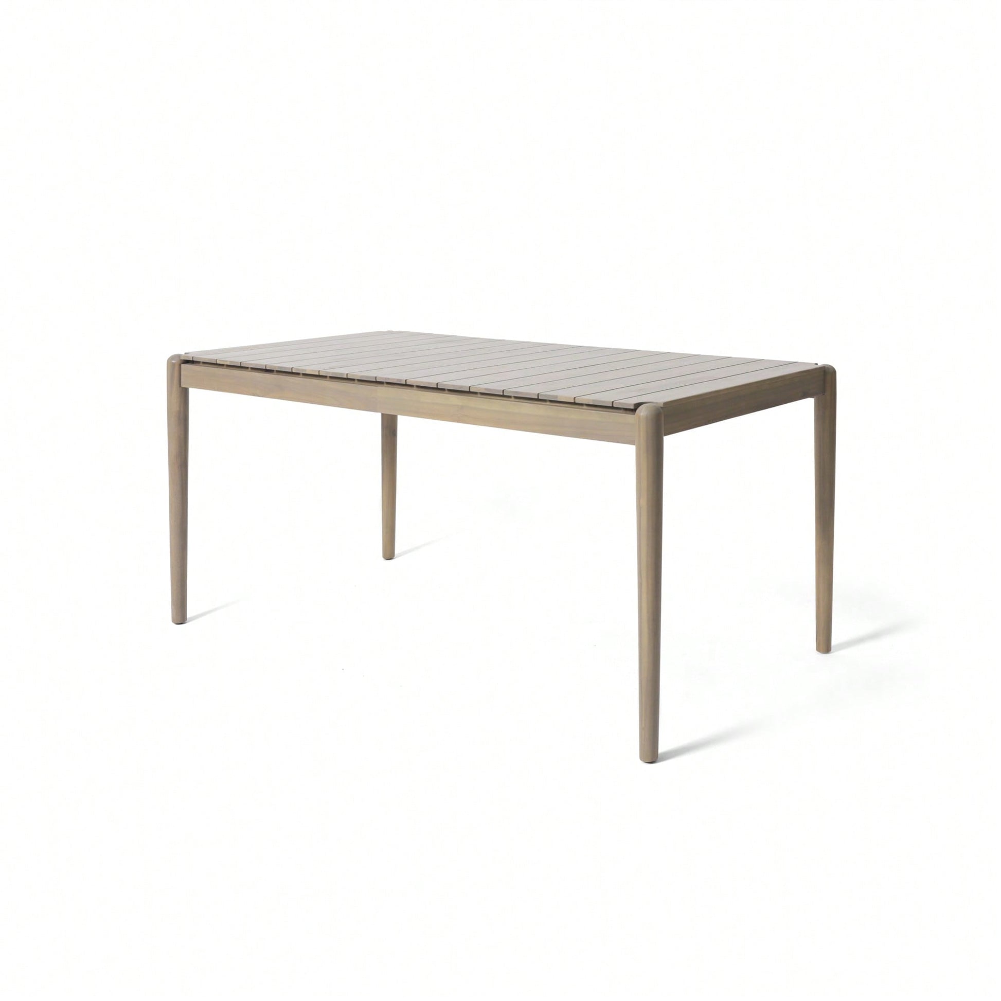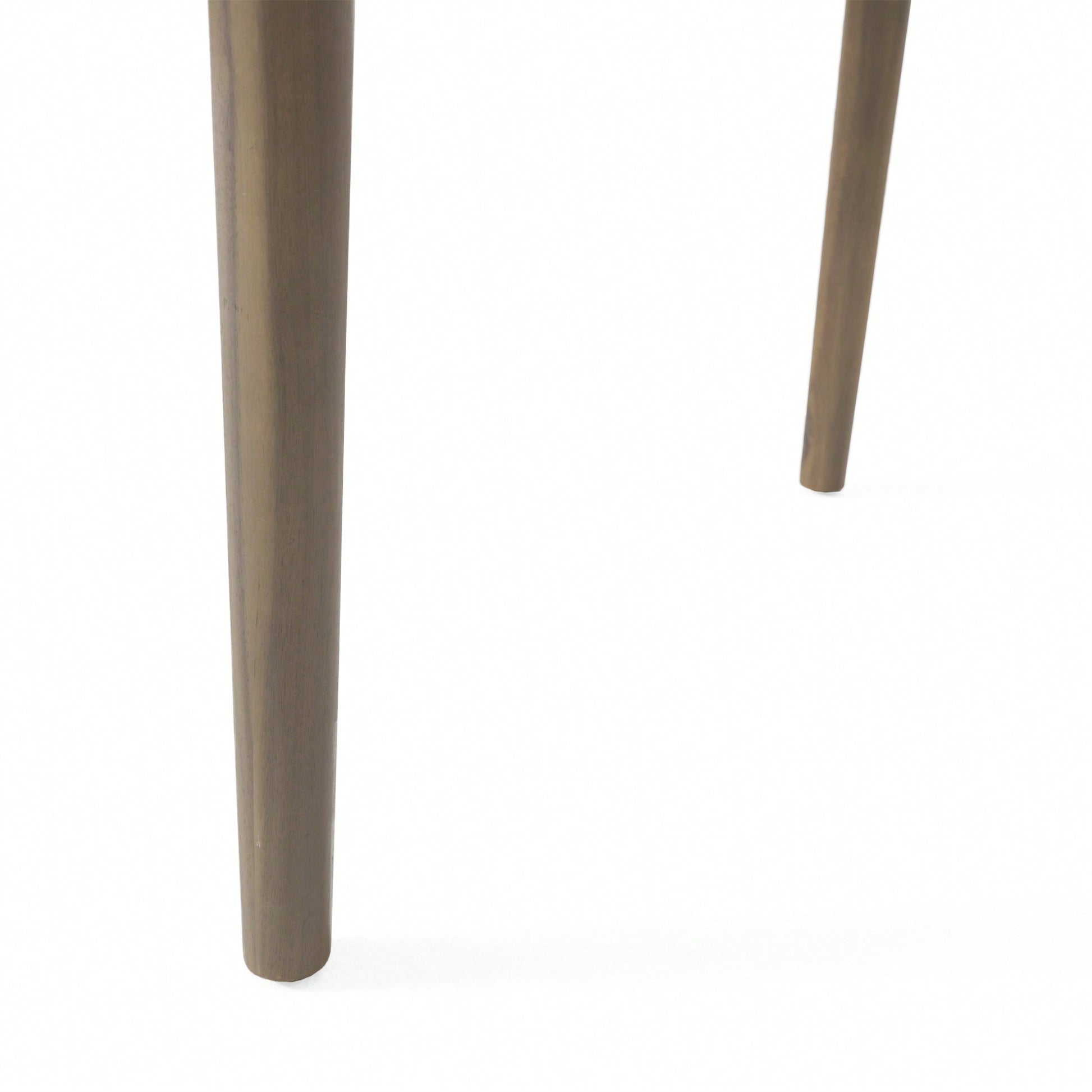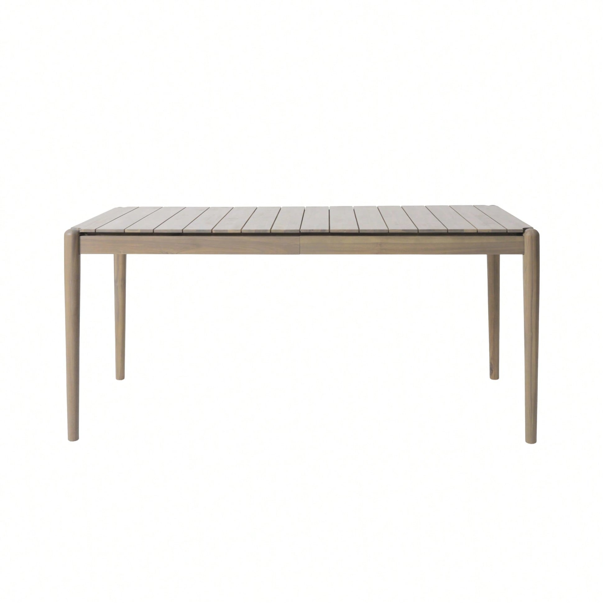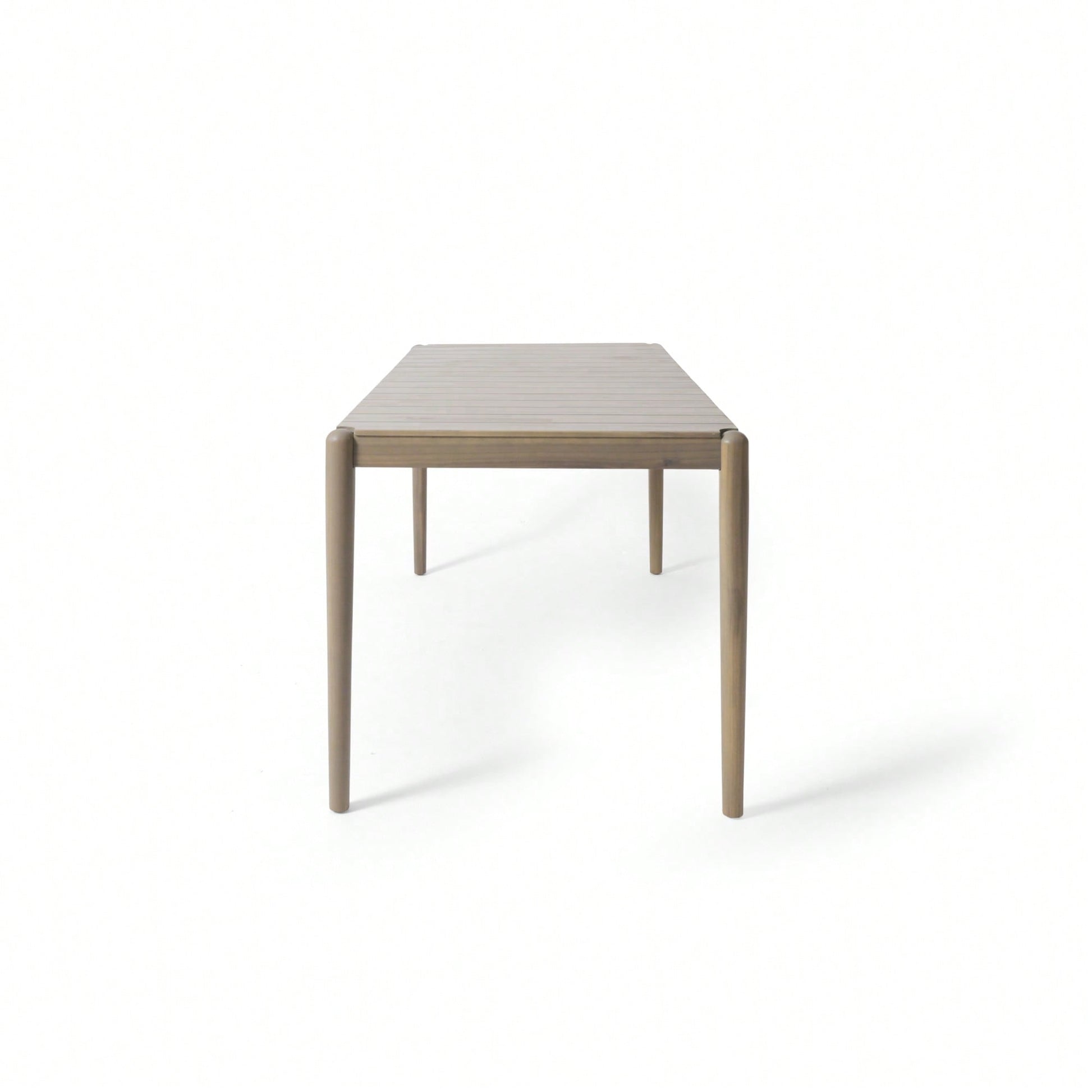 This dining table showcases a mid-century modern aesthetic with its elegant round tapered legs and beautiful wood frame. Crafted from durable acacia wood, it offers a solid and heavy construction that resists wear and tear. The slat panel design adds a touch of sophistication, making it a perfect centerpiece for any dining area.