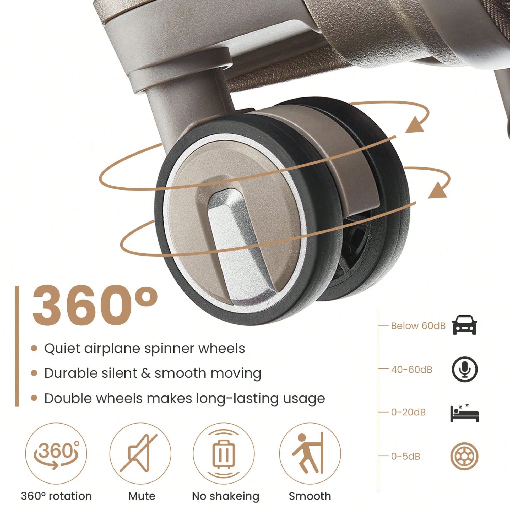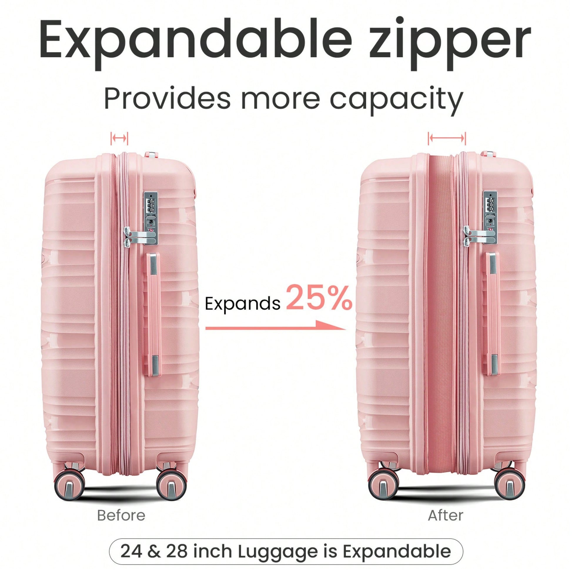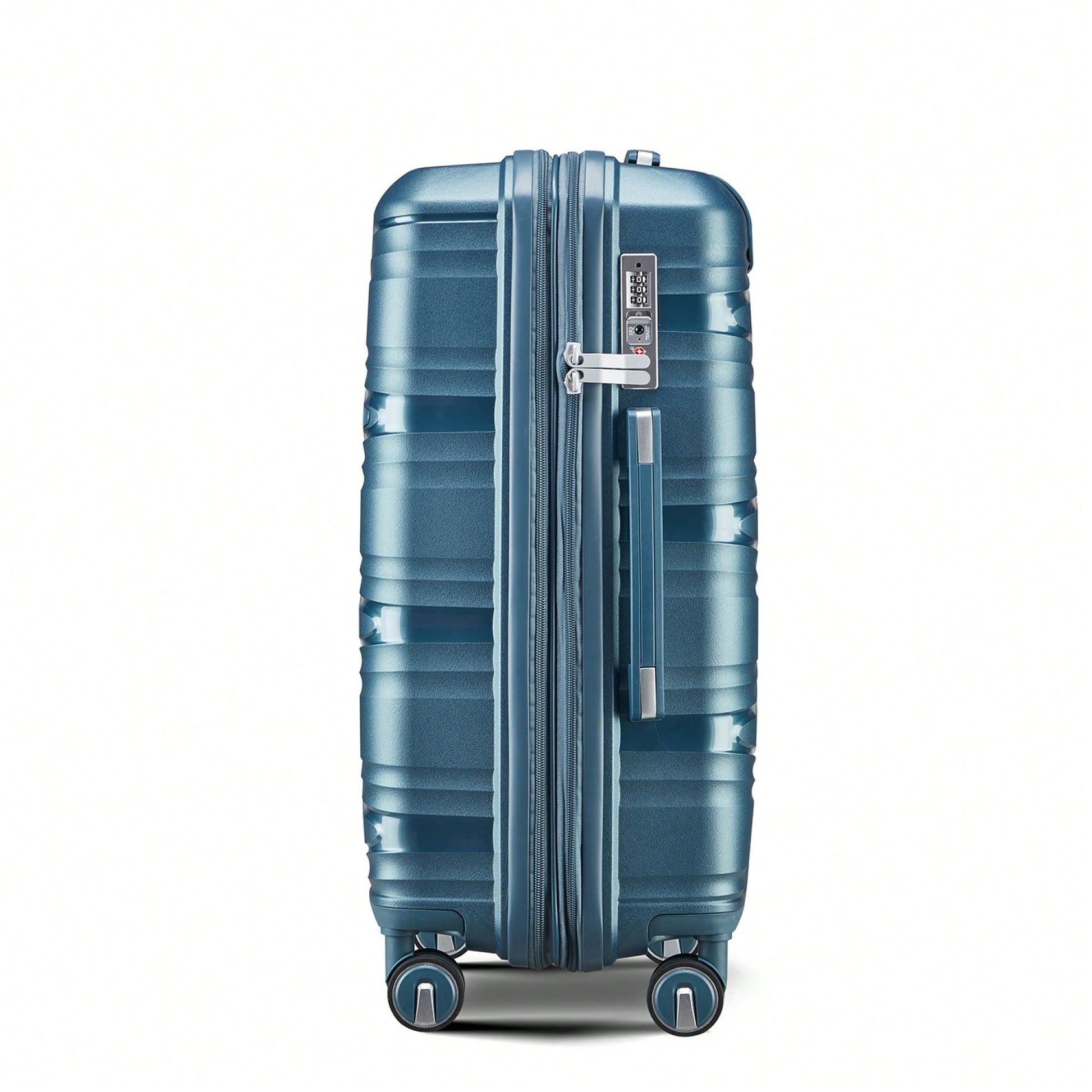 This lightweight luggage set is crafted from durable and friendly PP material, ensuring resilience and the ability to return to its original shape after impact. The 4 piece set is designed for versatility, with a 14 inch suitcase ideal for daily essentials, a 20 inch carry-on for business trips, and expandable 24 and 28 inch luggage for longer journeys. Each suitcase features a TSA-approved lock for added security during travel, allowing TSA agents to inspect your luggage without damaging the lock. The 360° spinner wheels provide smooth and silent movement, making it easy to navigate through airports and other travel environments. The fully lined interior includes adjustable tie-down straps to keep your belongings secure, while reinforced padded handles offer comfort when lifting or carrying.