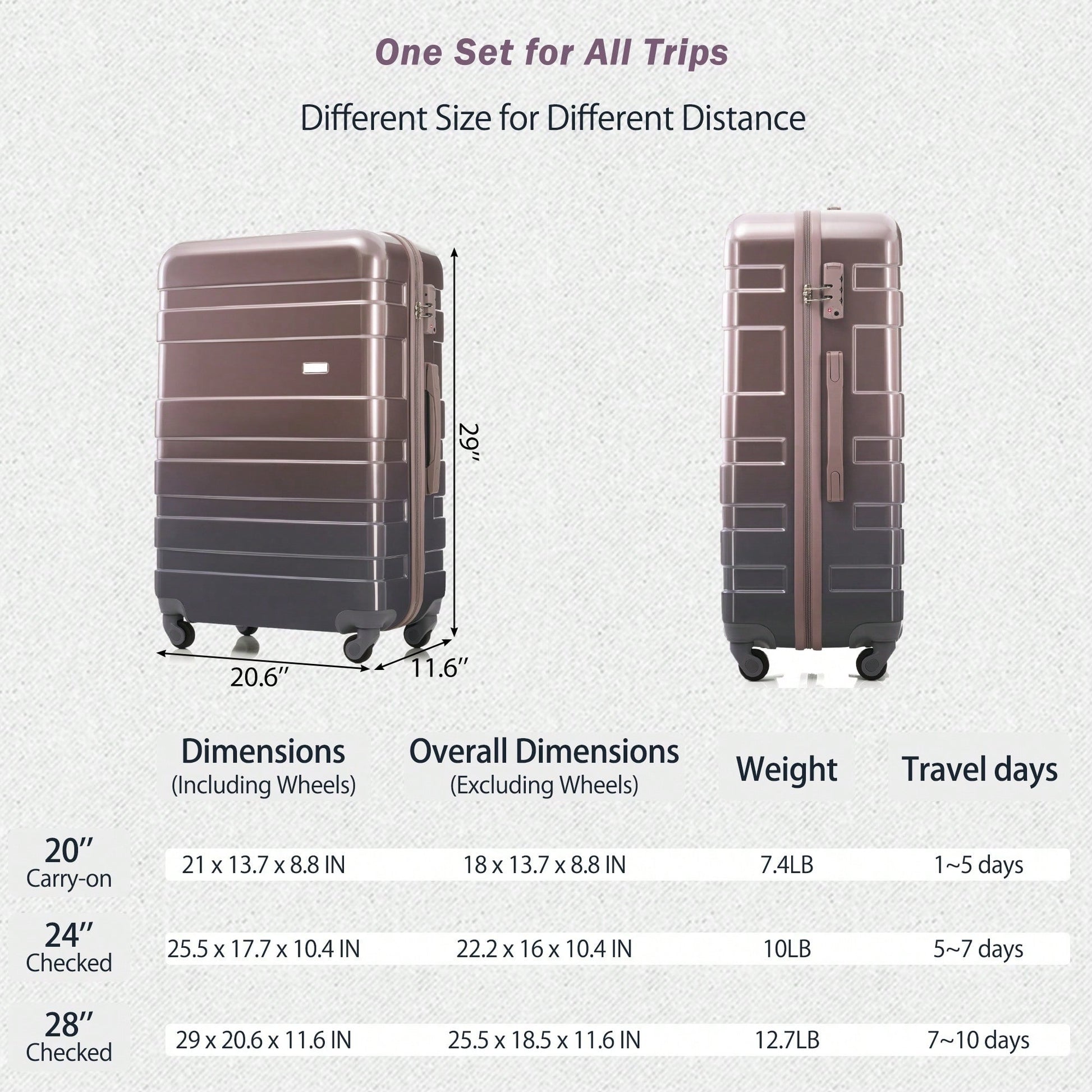 1. Features - Made from extra strong ABS material for durability - Textured finish to resist scratches - 4 360-degree rotating wheels for easy maneuverability - TSA lock for secure travel inspections - Lightweight design for hassle-free transport 2. Product Description This luggage set includes three pieces crafted from high-quality ABS material, ensuring both lightweight handling and exceptional durability. The textured surface not only enhances the aesthetic appeal but also protects against scratches, keeping your luggage looking new trip after trip. With four 360-degree rotating wheels, maneuvering through crowded airports or busy streets is a breeze, allowing you to push, pull, or drag your suitcase effortlessly. The integrated TSA lock provides peace of mind, enabling TSA agents to inspect your luggage without damaging the lock. Each suitcase offers ample packing space to organize your belongings neatly and securely, making it an ideal choice for travelers seeking convenience and reliability. Specifications: - Sizes: 20'', 24'', 28'' - Material: ABS - Wheel Type: 360-degree rotating - Lock Type: TSA lock