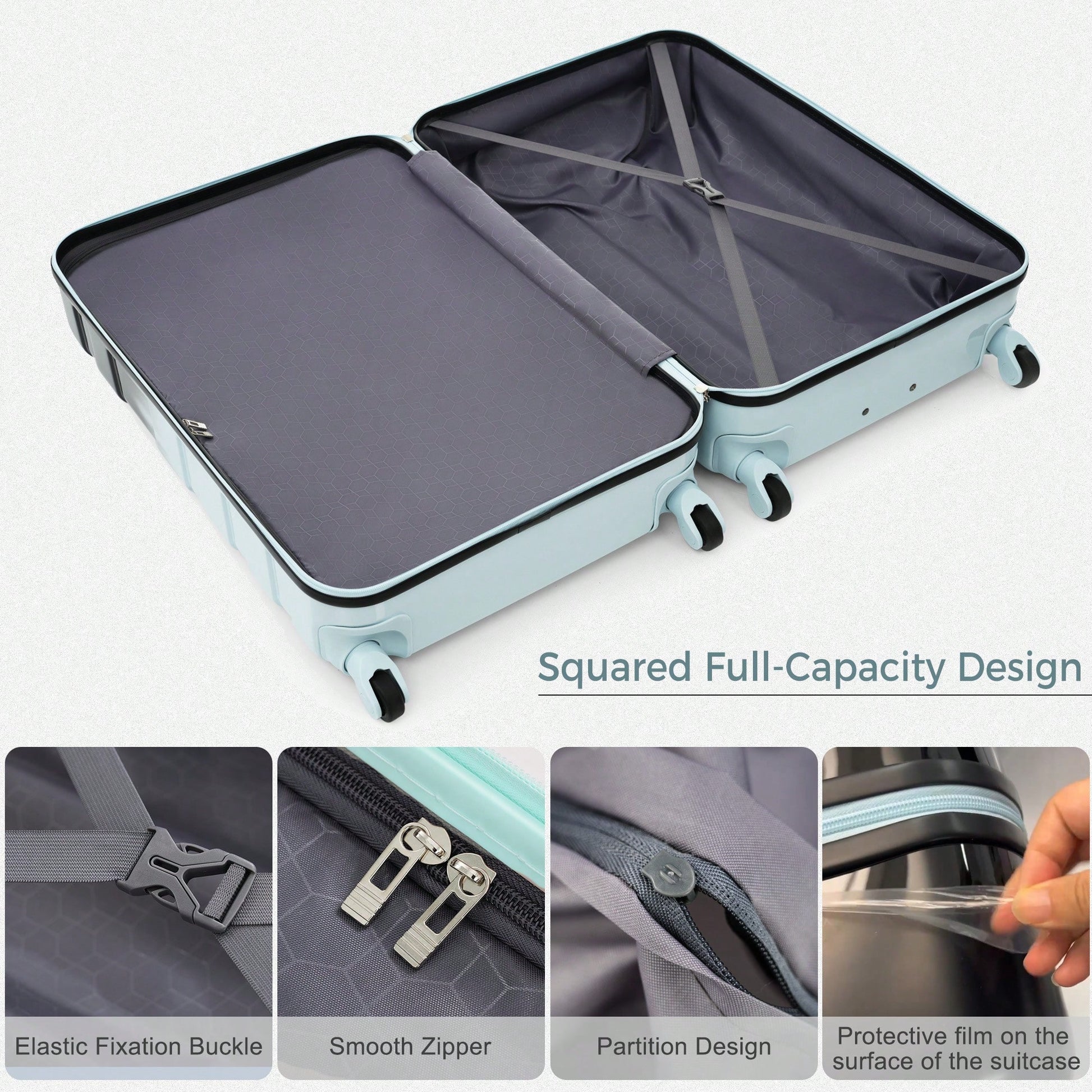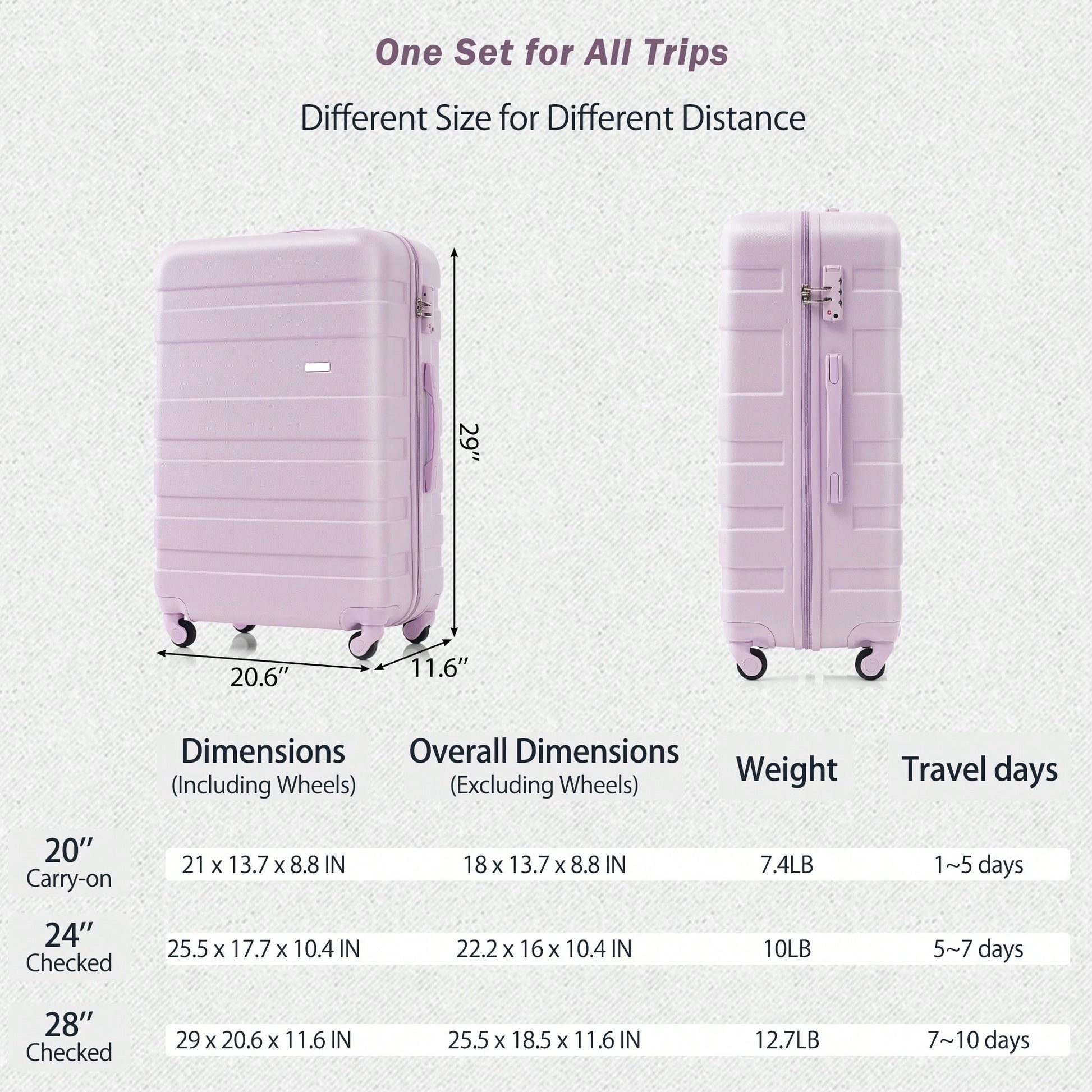 1. Features: - High-quality luggage set made from strong ABS material - Lightweight and durable with a textured finish to prevent scratches - Features 4 360-degree rotating wheels for easy maneuvering - Equipped with a TSA lock for secure travel - Spacious interior for organized packing 2. Product Description: This luggage set is crafted from extra strong ABS material, ensuring both lightweight handling and exceptional durability. The textured finish not only adds to its aesthetic appeal but also protects against scratches, allowing your luggage to maintain its pristine look trip after trip. The innovative 4-wheel design allows for effortless maneuvering in any direction, keeping your suitcase upright and easy to handle. Additionally, the TSA lock provides peace of mind, enabling TSA agents to inspect your luggage without damaging the lock. With a spacious interior, this set is designed for efficient packing, making it a perfect travel companion. Specifications: - Sizes: 20'', 24'', 28'' - Material: ABS - Wheel Type: 360-degree rotating wheels - Lock: TSA lock