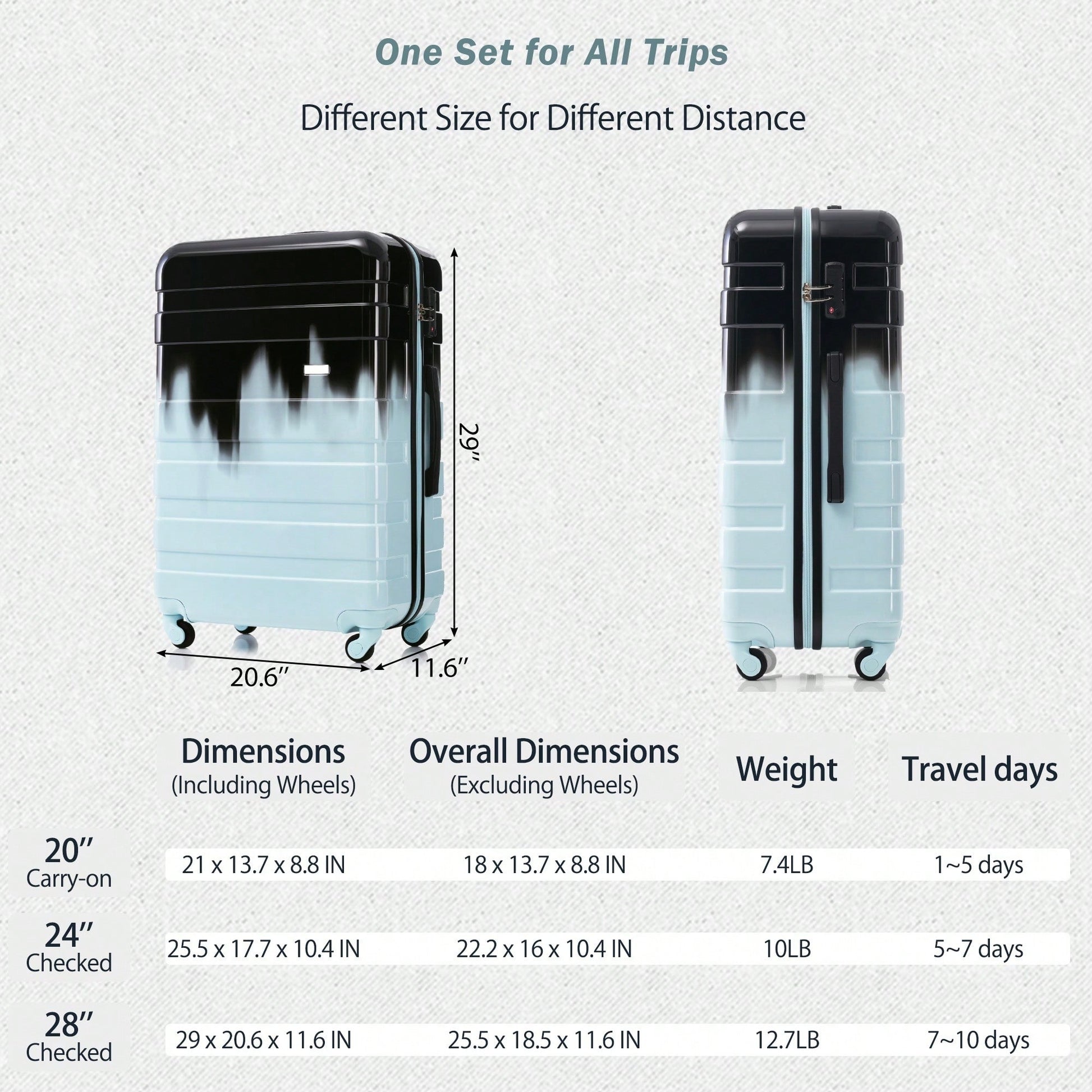 Lightweight Durable ABS Hardshell 3-Piece Luggage Set With Spinner Wheels And TSA Lock In Blue And Black - 20'', 24'', 28'' Sizes