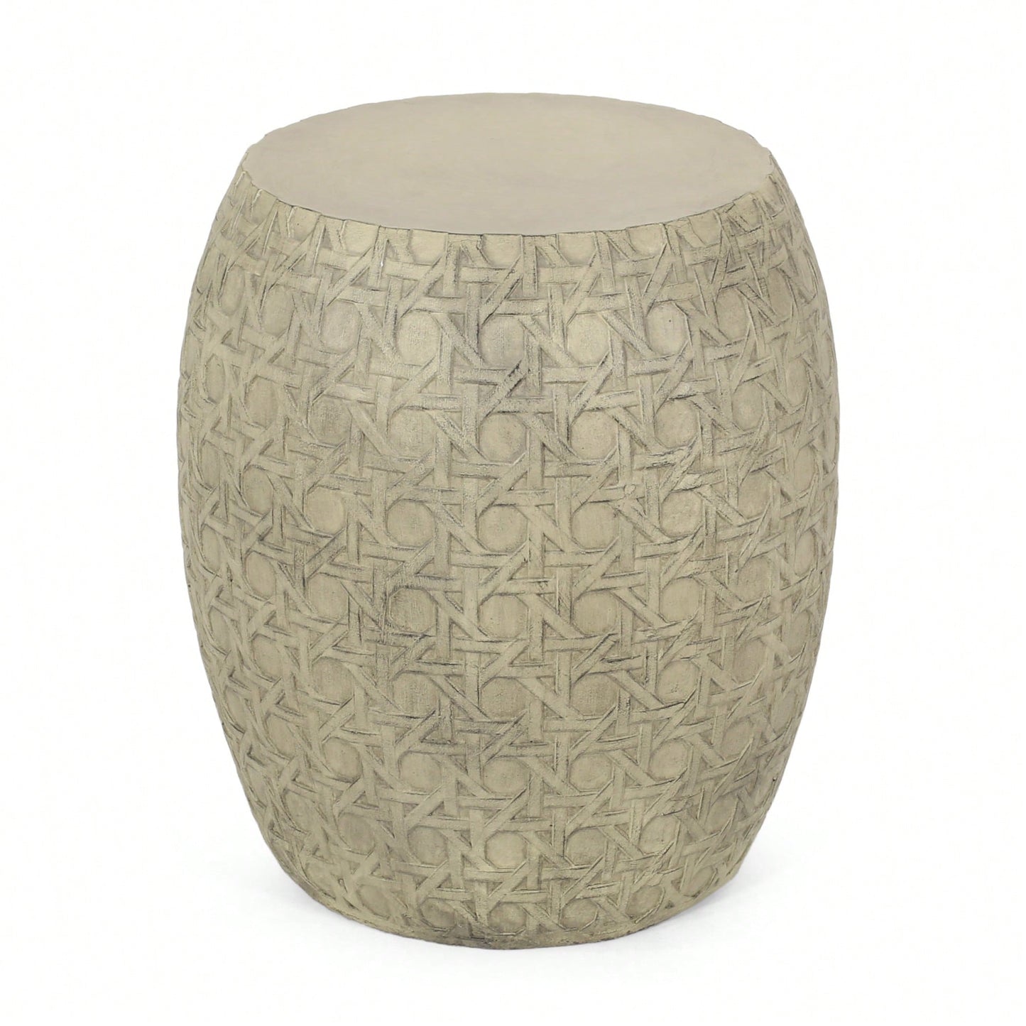 Enhance your outdoor space with this delightful side table, designed to bring personality and style to your patio. The table features a unique barrel shape and an intricate cane wicker pattern, making it a standout piece in any decor. Its boho design offers a blend of textures and a minimalist yet refined structure, emphasizing both aesthetics and functionality. Crafted from lightweight concrete, this table is not only visually appealing but also highly durable, ensuring it can withstand the elements while providing a stable surface for your needs.