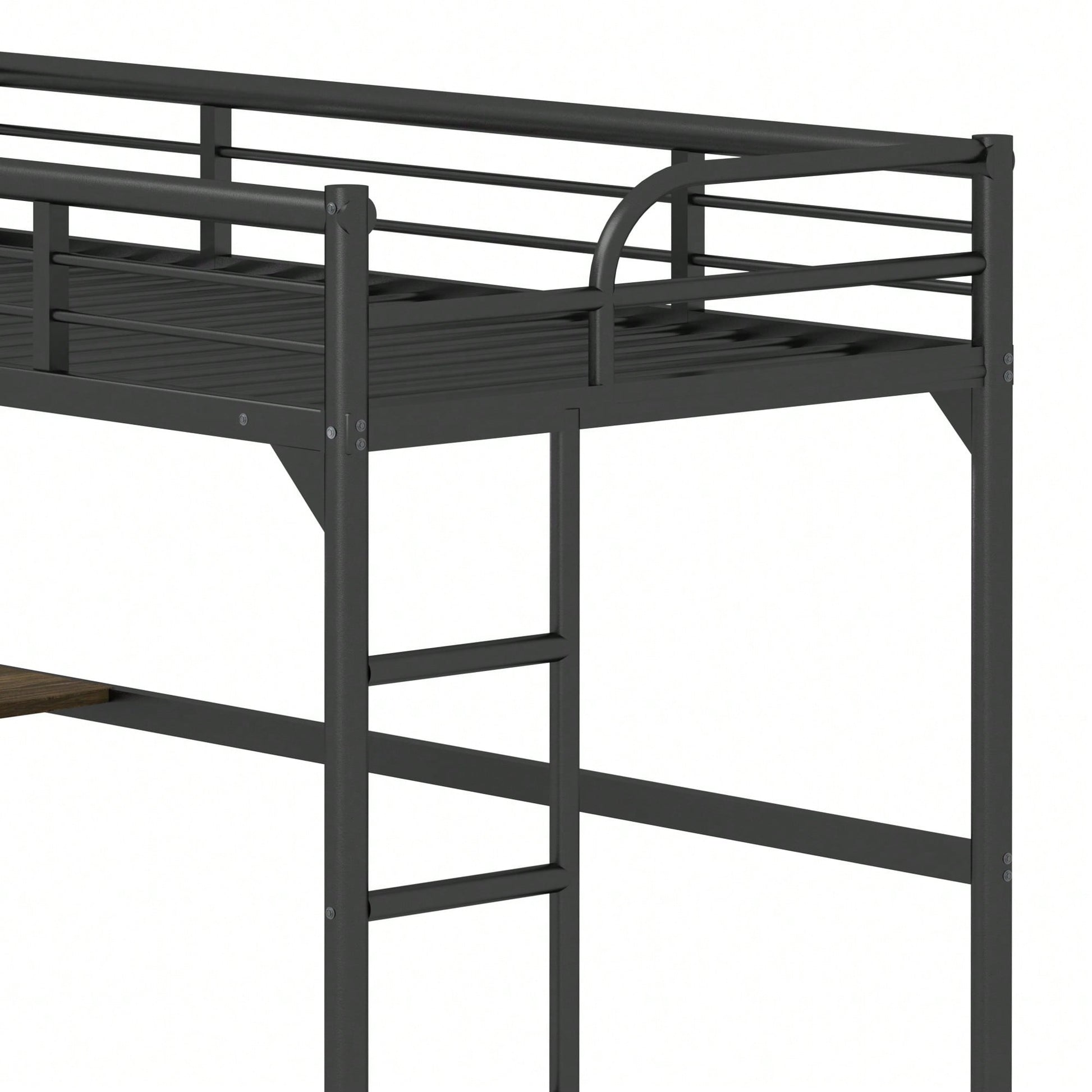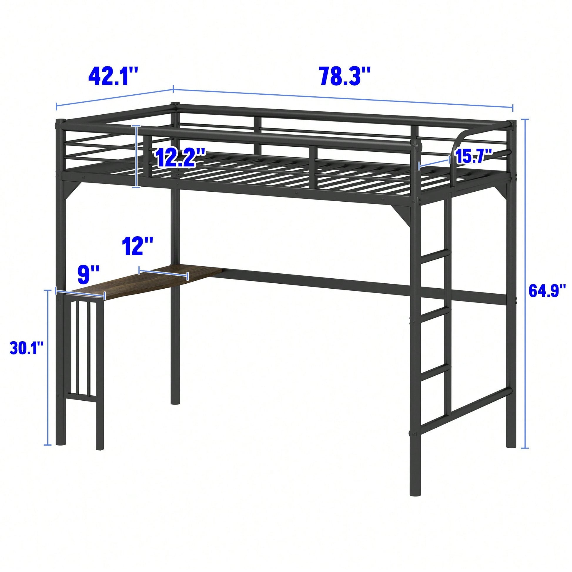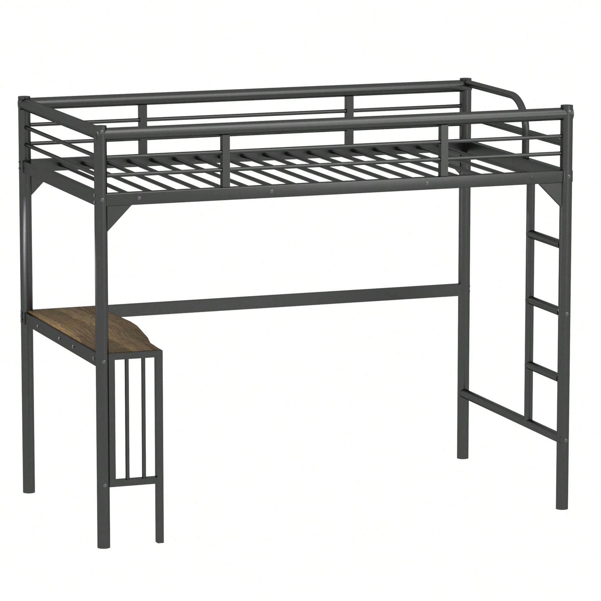 2. This twin size metal loft bed features a simple and durable design that complements any room decor. The loft bed is constructed from sturdy metal, ensuring long-lasting use. Safety is prioritized with guardrails and a conveniently located ladder on the right side. The lower level offers abundant space, allowing for various configurations to suit different needs.