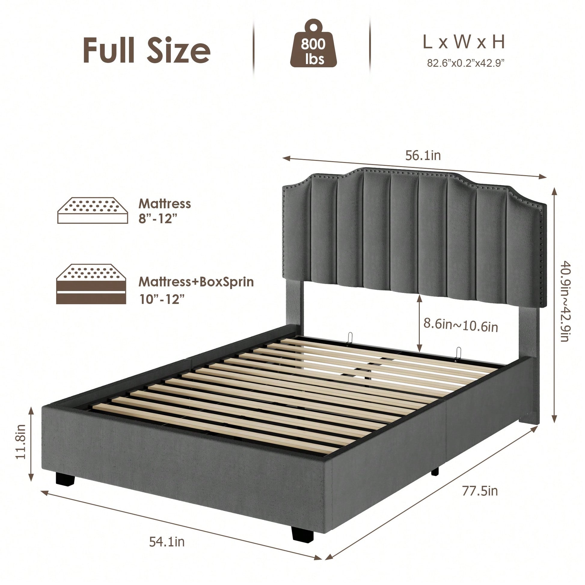 1. Features: - Lift-up design maximizes under-bed storage for toys, clothing, and more - Upholstered in soft grey velvet with elegant decorative details - Sturdy pine wood and plywood frame supports up to 500lbs - Heavy-duty metal construction with extra support legs for stability - Easy assembly with illustrated instructions and numbered parts 2. Product Description: This lift-up double size bed in grey velvet offers a stylish solution for maximizing storage in your bedroom. The innovative design allows for easy access to the spacious storage area beneath the platform, perfect for organizing toys, clothing, and other items. Upholstered in soft, carefully-selected grey velvet, the bed features a beautifully carved headboard adorned with copper nail accents, adding a timeless elegance to any home décor. Constructed from solid pine wood and plywood, this bed frame provides robust support for up to 500lbs, ensuring durability and stability for years to come. The package includes easy-to-follow instructions for quick assembly, allowing you to set up your new bed with minimal hassle. Specifications: - Bed type: Lift-up double size - Upholstery: Grey velvet - Frame material: Pine wood and plywood - Weight capacity: 500lbs - Assembly: Easy with illustrated instructions