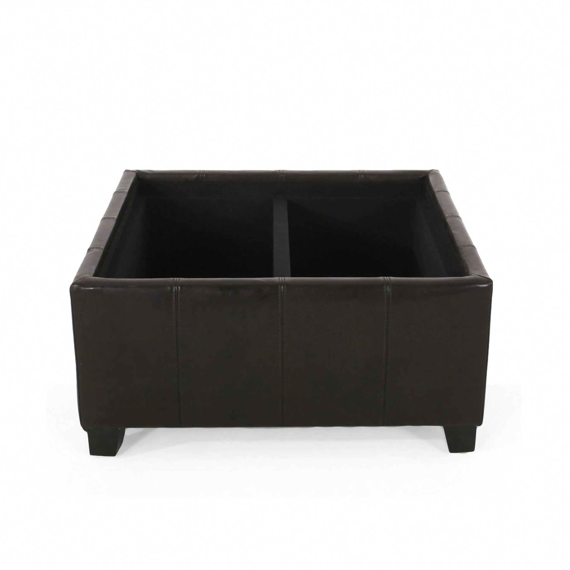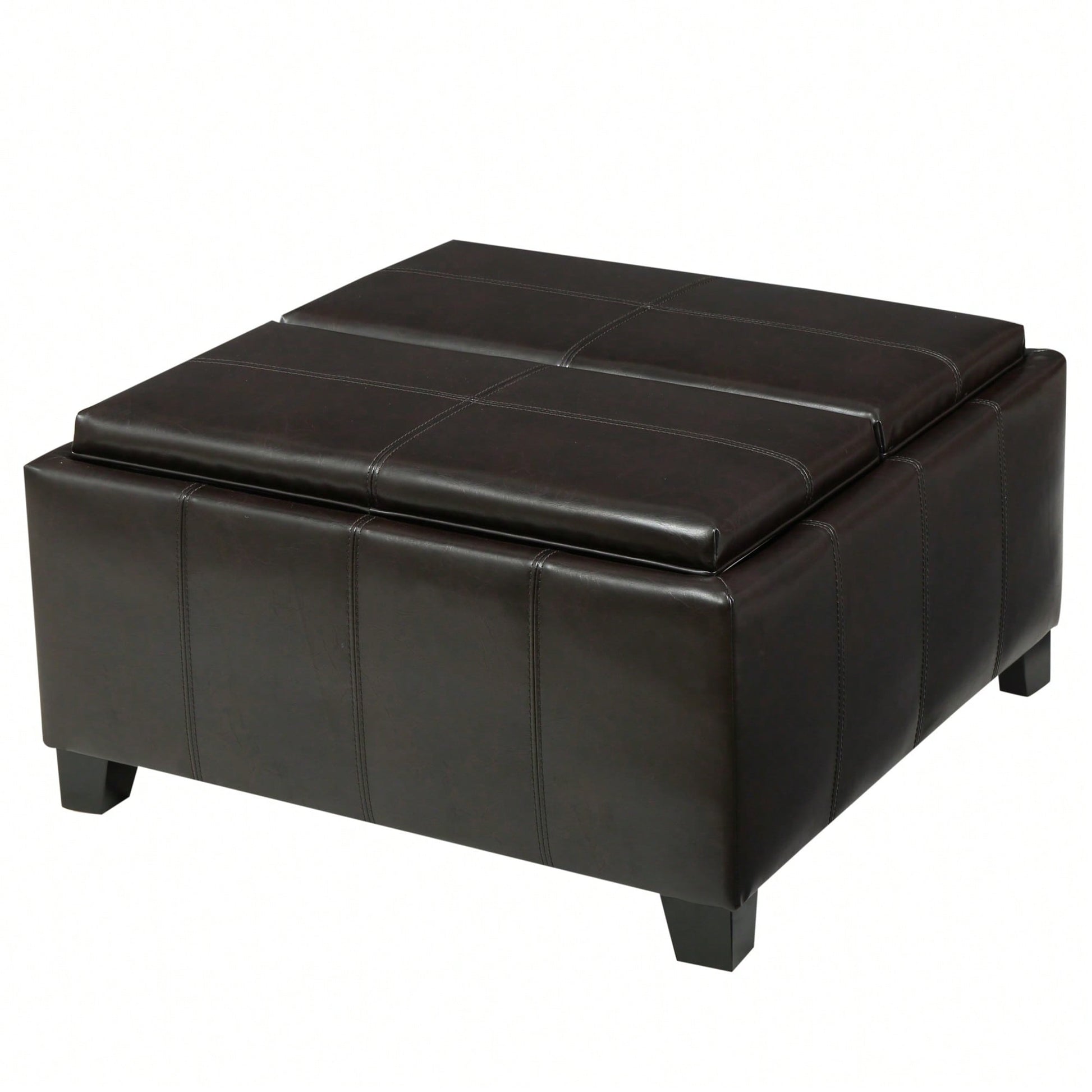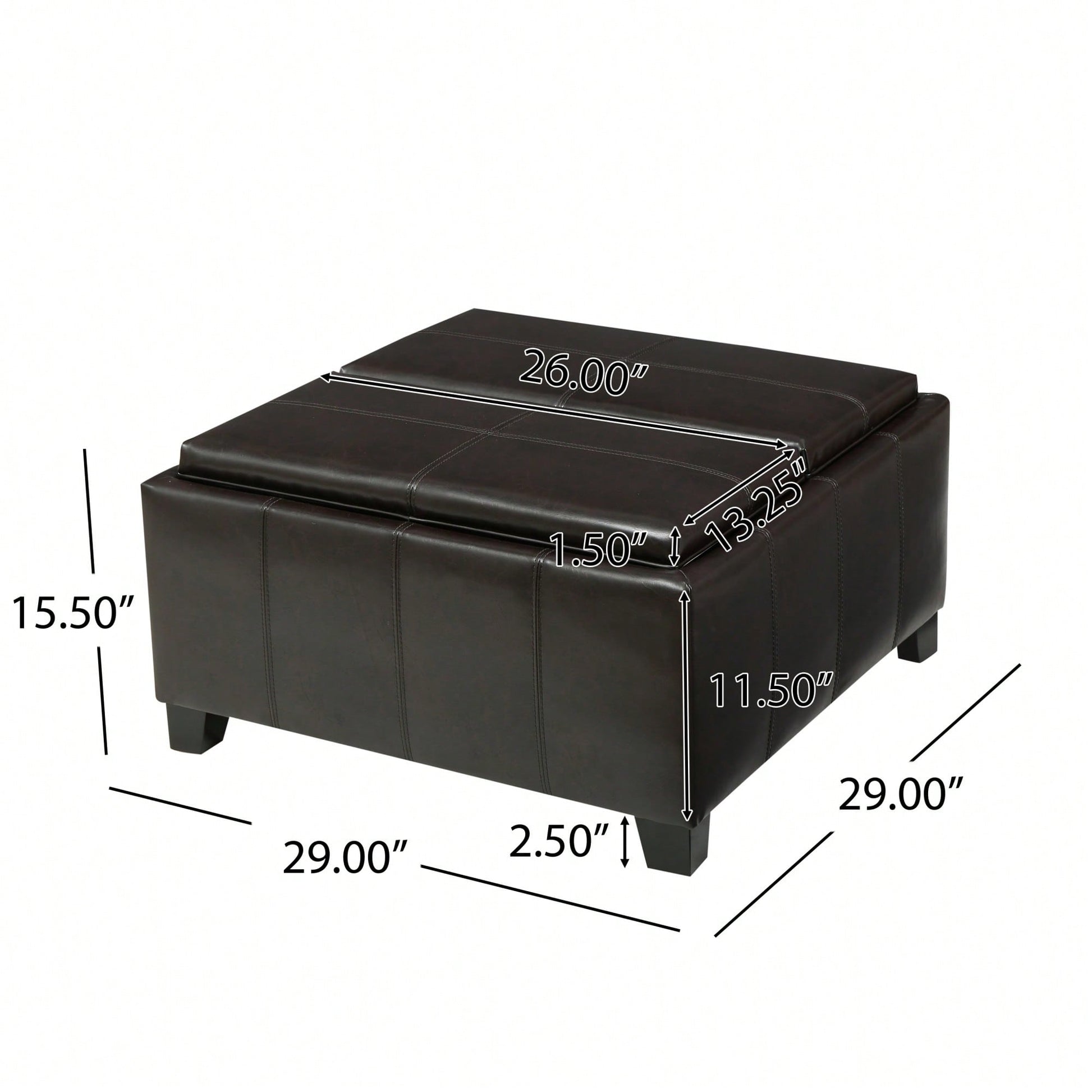 1. Key Features: - Contemporary design with clean lines and smooth upholstery - Tray top with reversible options for versatile use - Ample storage space for pillows and blankets - Generously upholstered for a refined appearance - Plush top for extra comfort 2. Product Description: This storage ottoman features a contemporary design that enhances any room with its clean lines and smooth upholstery. The tray top is reversible, allowing for easy transformation from a footrest or extra seat into a convenient table. With ample storage space, it is perfect for keeping pillows and blankets organized. The generous upholstery adds a refined touch and provides a plush top for added comfort. Specifications: - Color: Brown