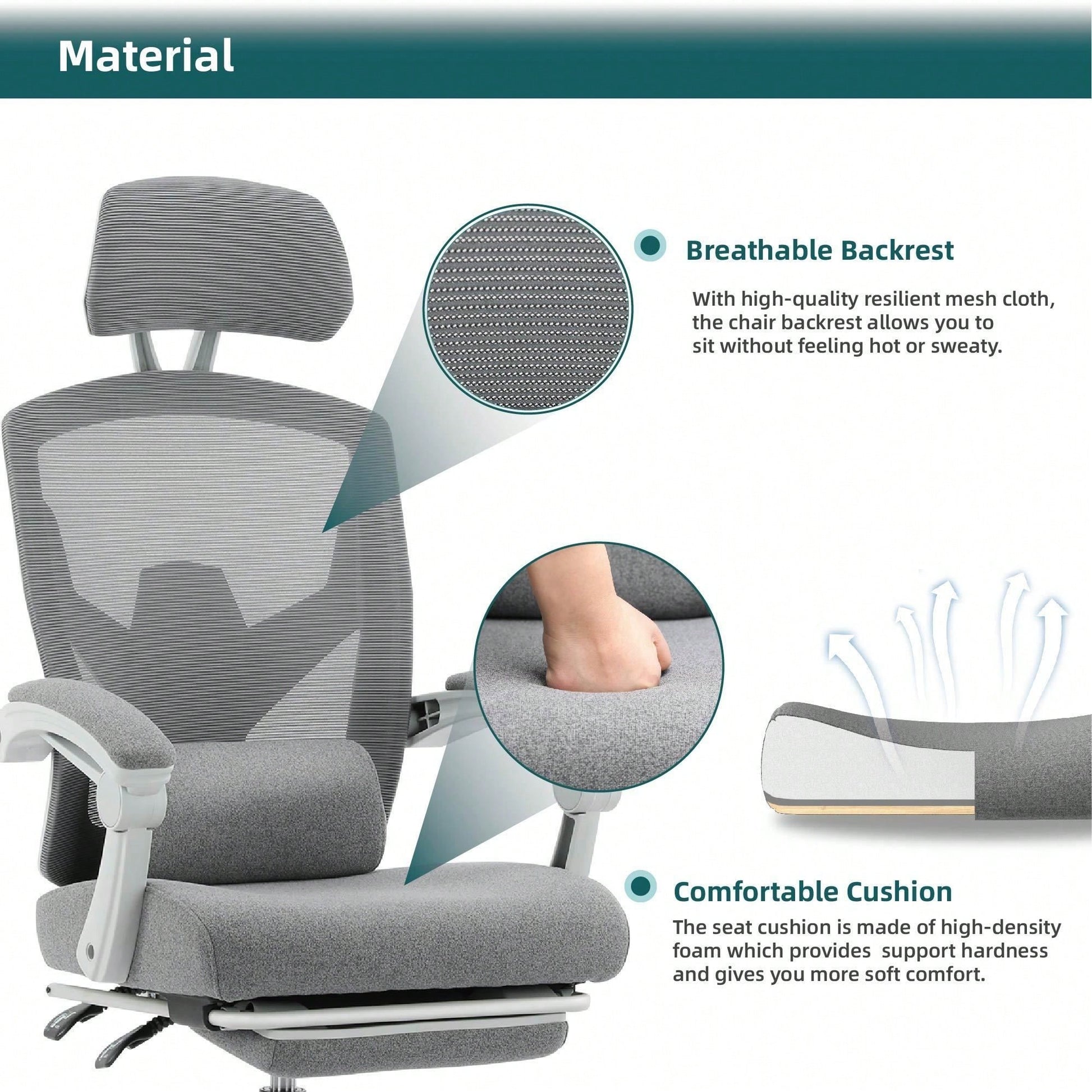 2. Ergonomic Lumbar Support. The mesh backrest, made of porous material, offers you a breathable feel. The sturdy backrest frame supports the natural curve of the spine, allowing you to maintain a good sitting posture. Besides, the soft lumbar support pillow relieves the pressure on the lower back, bringing you the ultimate comfort.