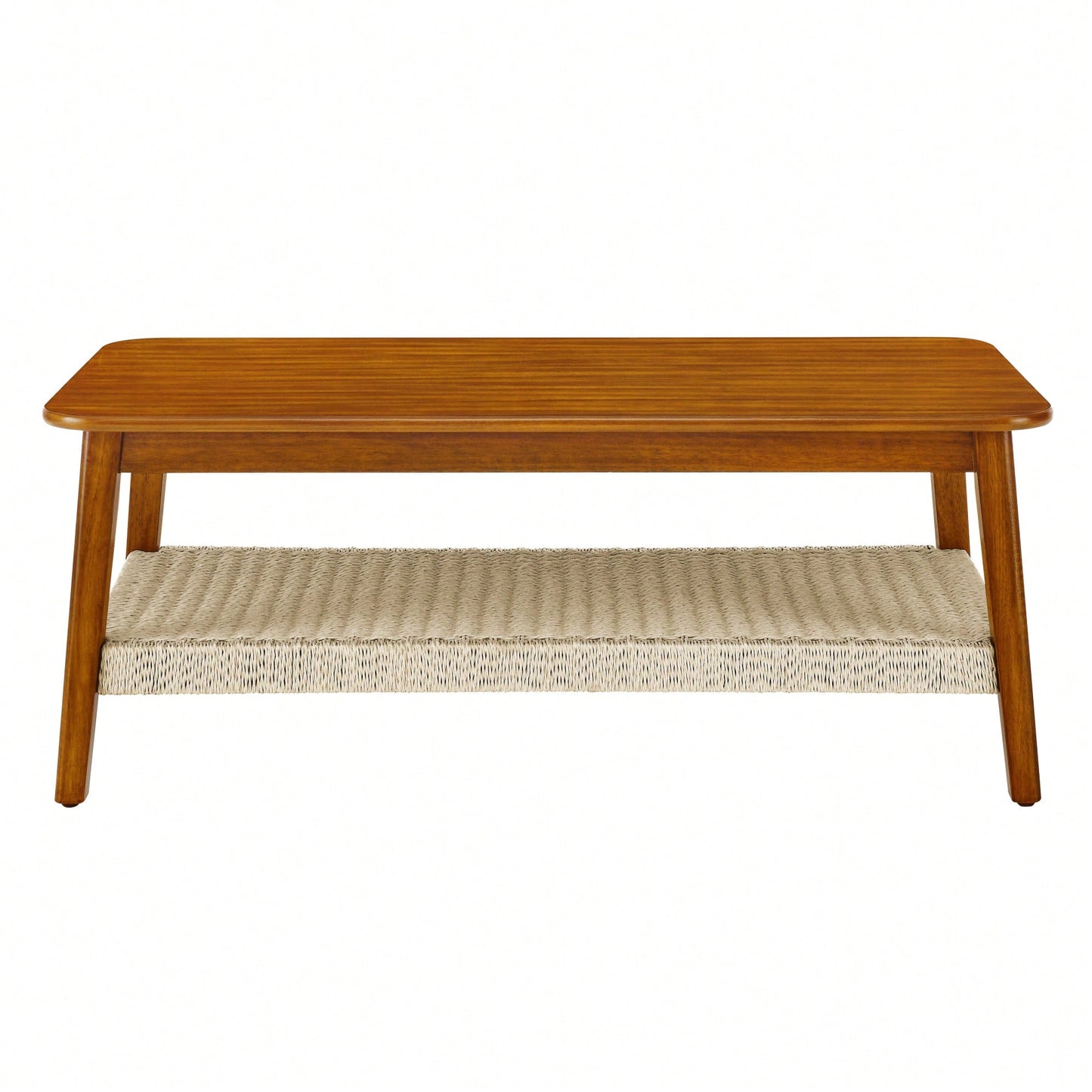 This 47.25" coffee table blends classic and modern aesthetics, featuring a beautifully woven rattan shelf that adds both style and functionality. The high-quality MDF construction with a rubberwood veneer ensures a textured appearance, while the solid wood legs provide sturdiness and moisture resistance. Perfect for living rooms, bedrooms, or patios, this table maximizes storage space with its wide desktop and integrated shelf. The handmade rattan weaving not only enhances visual appeal but also contributes to moisture absorption, making it a practical choice for any home. The smooth surface is easy to clean and maintain, ensuring long-lasting beauty and usability.