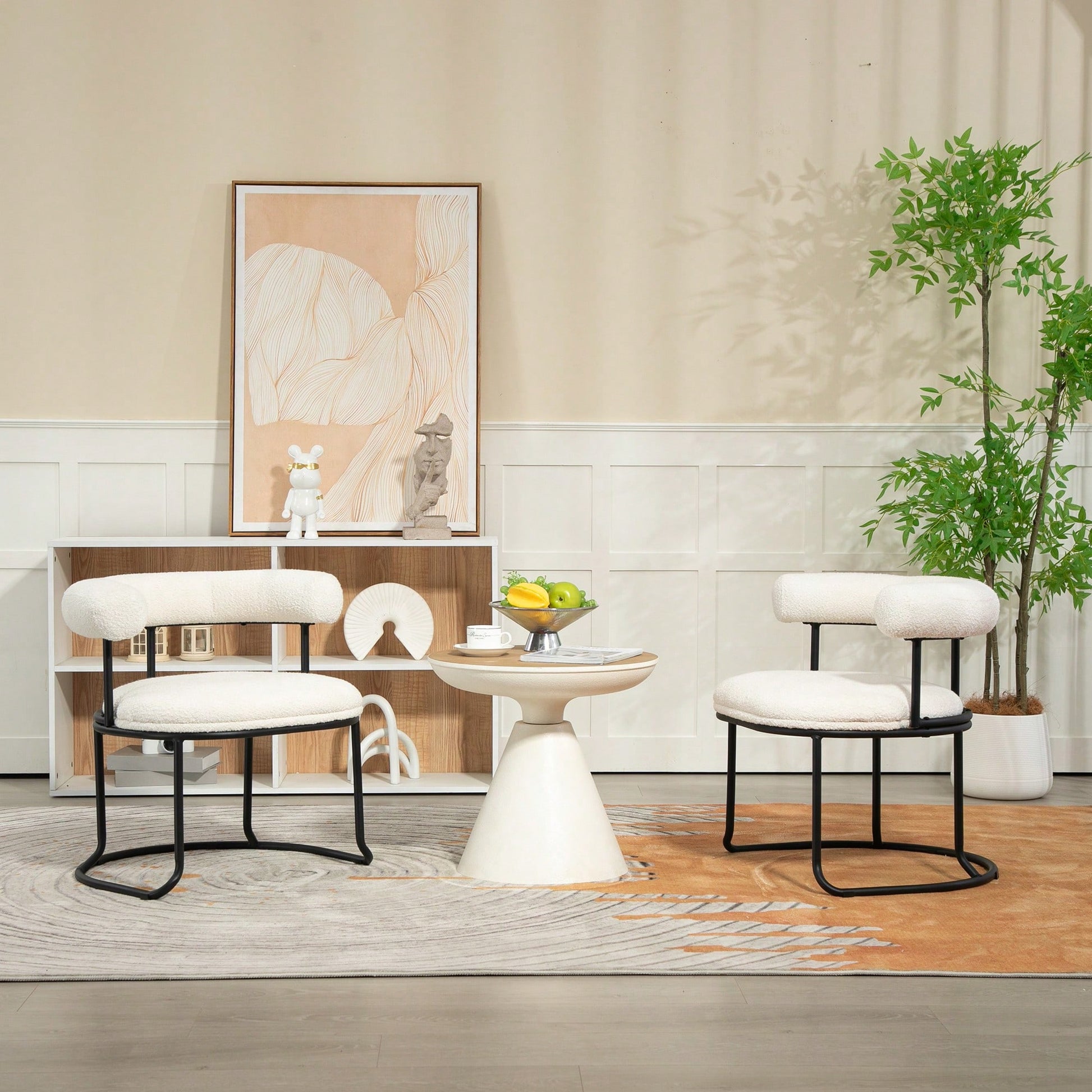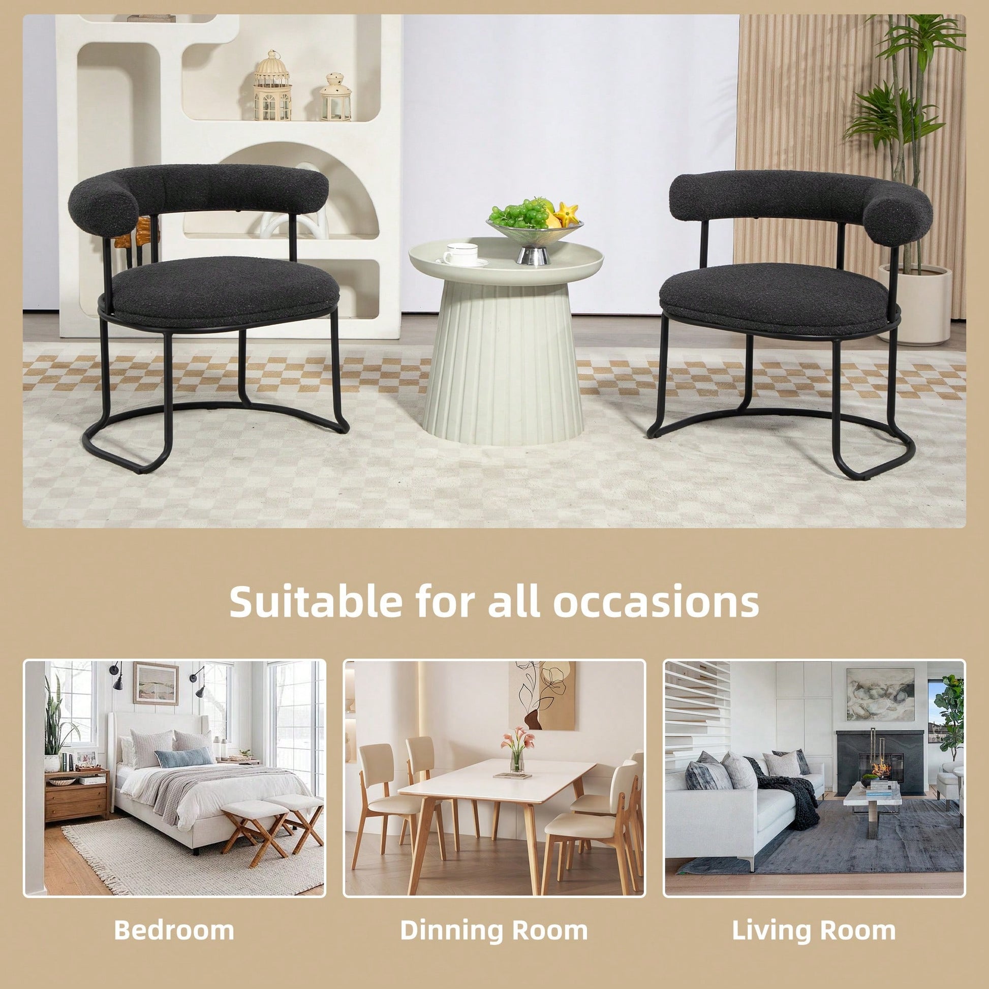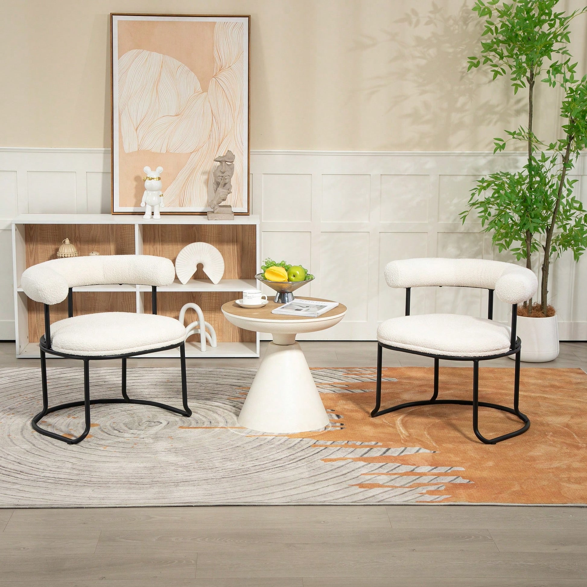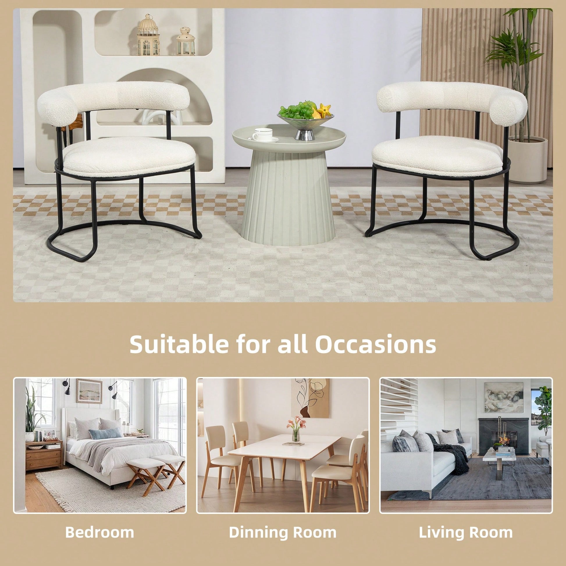 Mid-Century Modern Curved Backrest Boucle Dining Chairs Set Of 2 Upholstered Round Kitchen Chairs In Beige