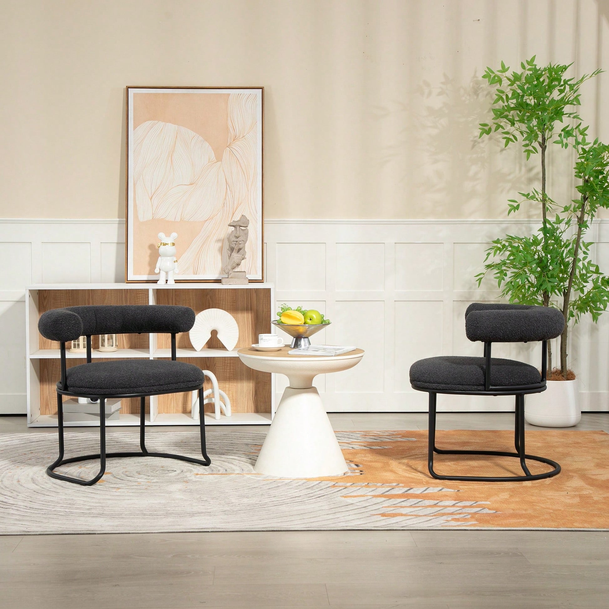 - Material: Boucle fabric and black metal legs