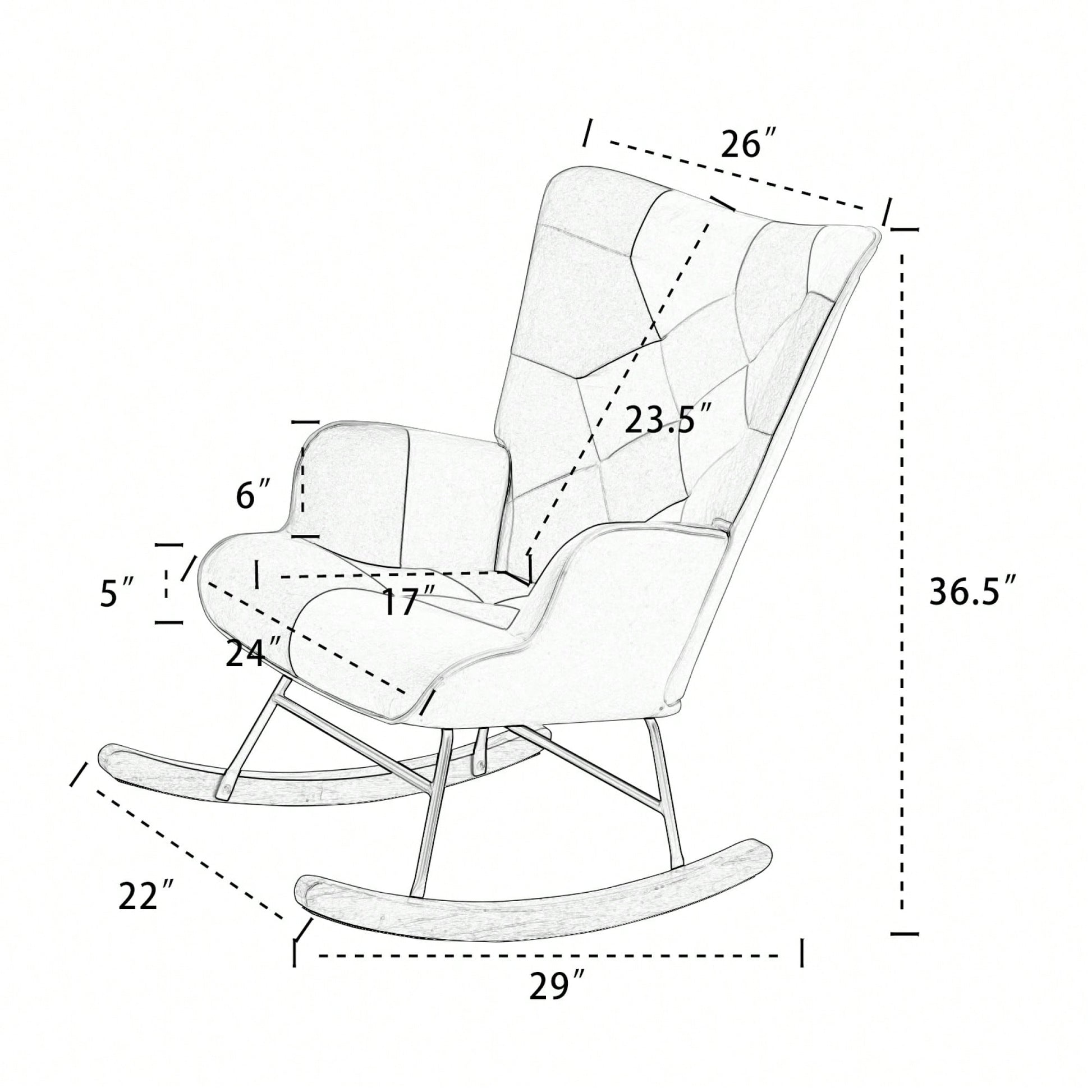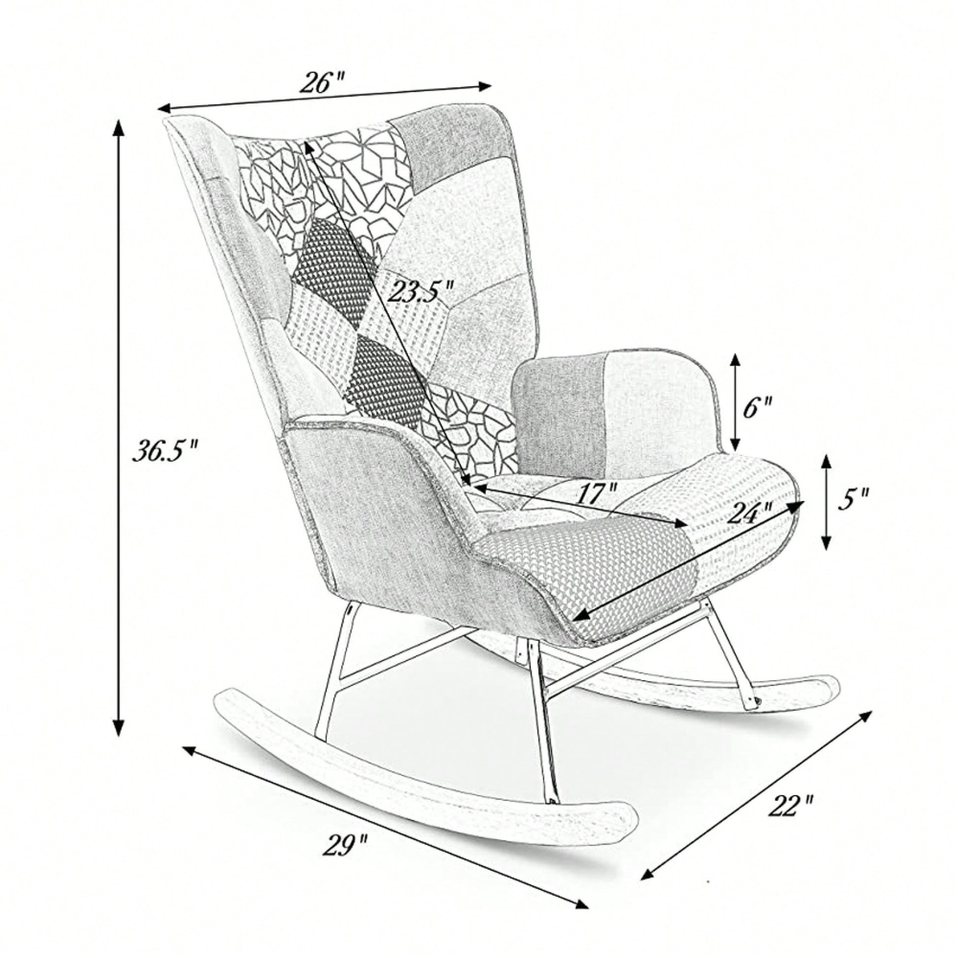 This mid-century fabric rocking chair features a unique patchwork linen design complemented by sturdy wood legs. Crafted from premium materials, it offers both stability and durability, ensuring it can withstand years of use. The chair's soft cushion delivers comfort, while the high back effectively supports your neck and head, allowing you to relax as you rock. Its vibrant splicing design makes it a versatile addition to any space, including the bedroom, living room, porch, or office, evoking a nostalgic warmth reminiscent of childhood. Assembly is straightforward, requiring only the tightening of screws.