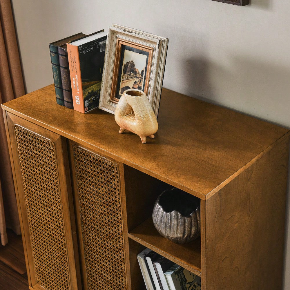 Mid Century Modern Rattan Buffet Cabinet with Adjustable Shelf and Solid Wood Legs for Entryway Living Room Kitchen Dining Room