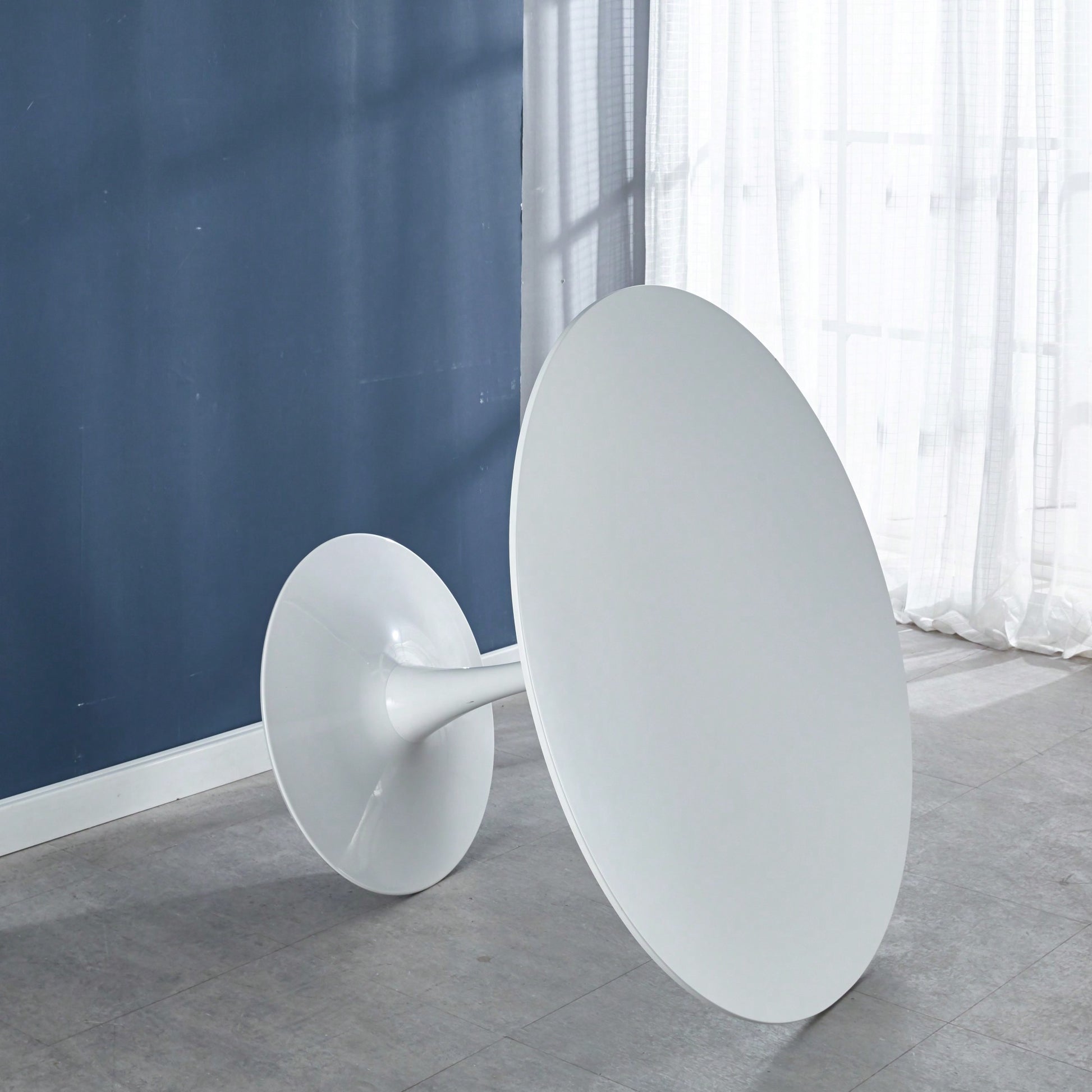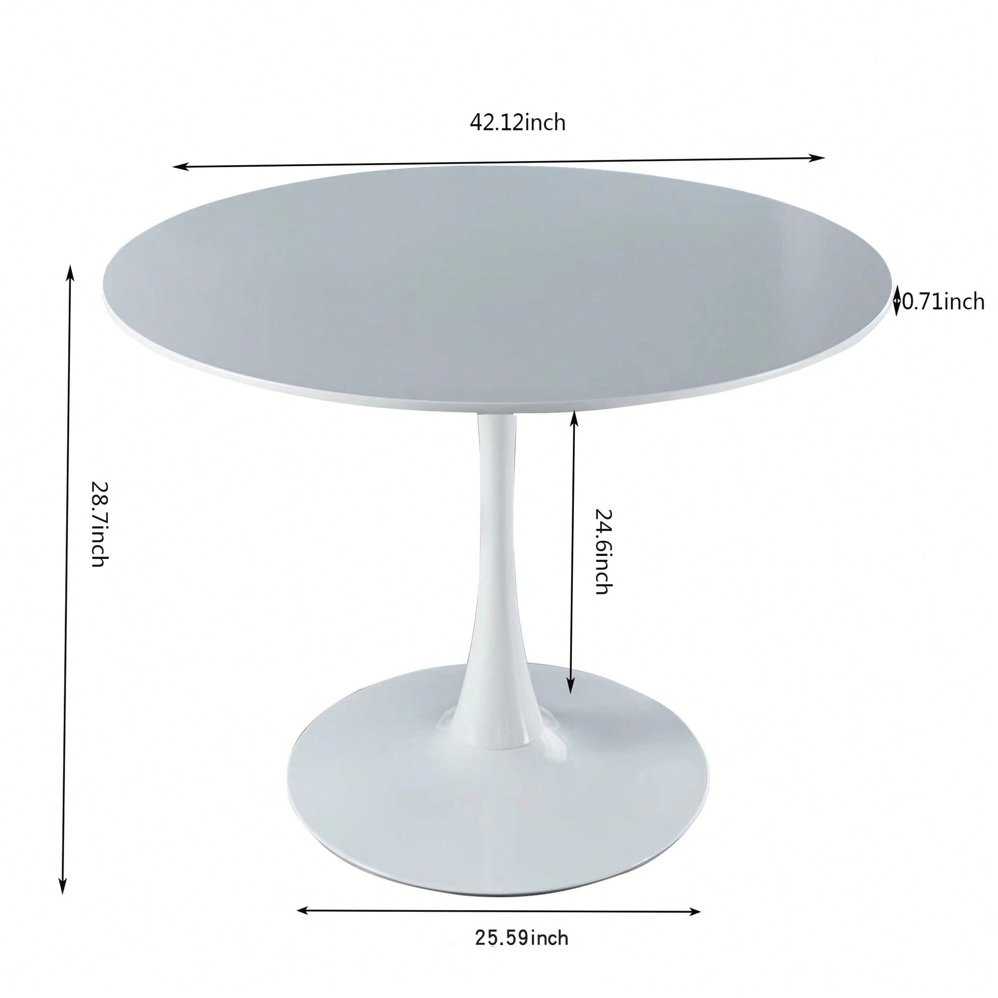 1. Key Features: - Mid-century design perfect for dining or leisure - Suitable for 4-6 people - Sturdy MDF top with stable metal legs - Easy assembly with included hardware and instructions - Smooth surface for effortless cleaning 2. Product Description: This 42.1" White Tulip Table features a sleek mid-century design that complements any dining space or leisure area. With a round MDF tabletop and sturdy metal pedestal legs, it provides stability and style for gatherings of 4-6 people. Assembly is a breeze with all necessary hardware and detailed instructions included, making it a convenient choice for any home. The smooth surface not only enhances its aesthetic appeal but also simplifies cleaning, allowing you to enjoy your time with family and friends without the hassle of maintenance. Specifications: - Table Diameter: 42.1 inches - Material: MDF top, metal legs - Seating Capacity: 4-6 people