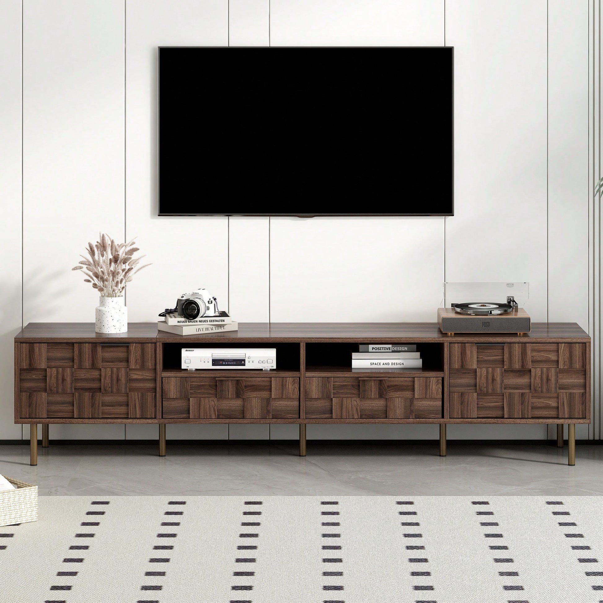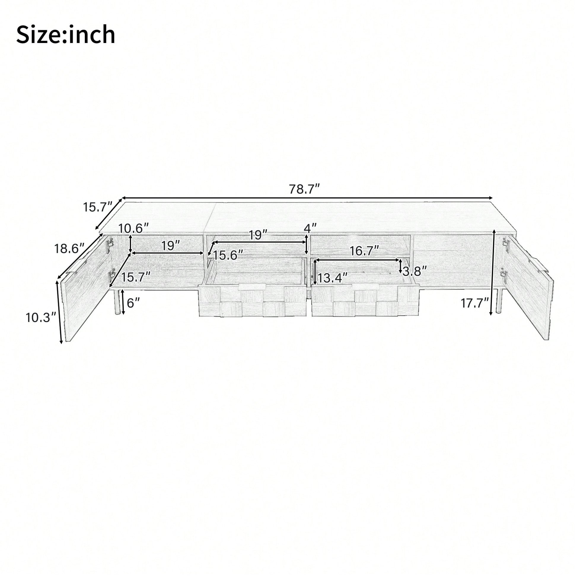This mid-century TV stand is designed to accommodate large TVs up to 85 inches, making it a perfect centerpiece for your living room or home theater. The spacious surface area of 78.7'' x 15.7'' allows you to either place your TV on the stand or mount it above for a sleek look. With ample storage provided by two cabinets and two open compartments, you can easily organize your media essentials, gaming consoles, and DVDs. The unique mid-century style adds a vintage charm to your decor, while cable management holes ensure a tidy appearance by concealing wires. Built from high-quality materials, this TV stand promises both beauty and durability, and the easy installation process is supported by clear instructions and labeled components.