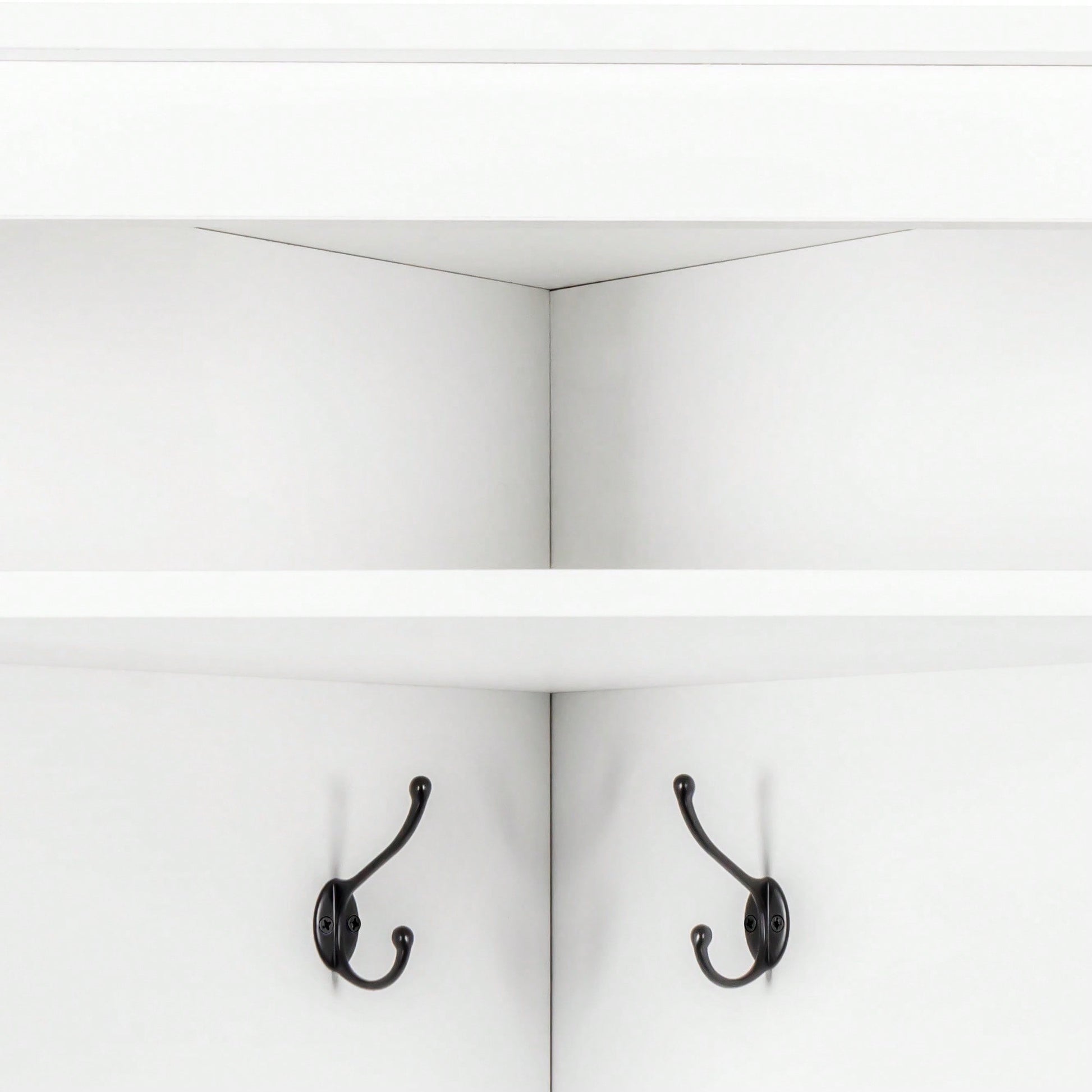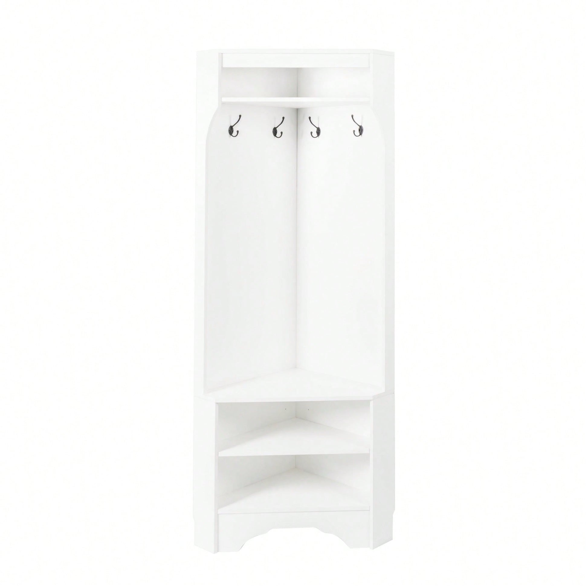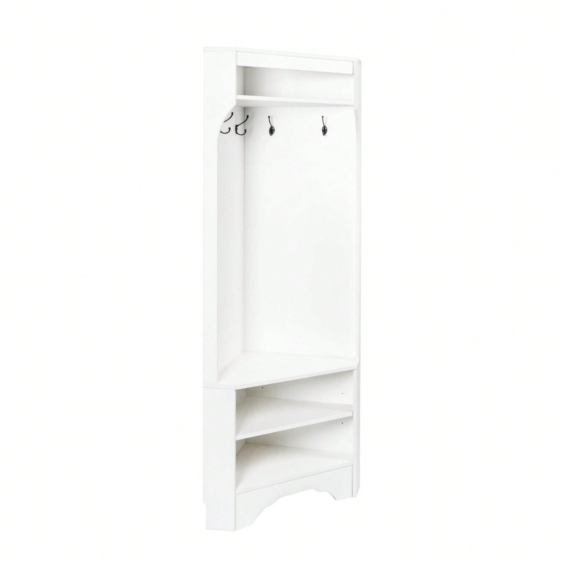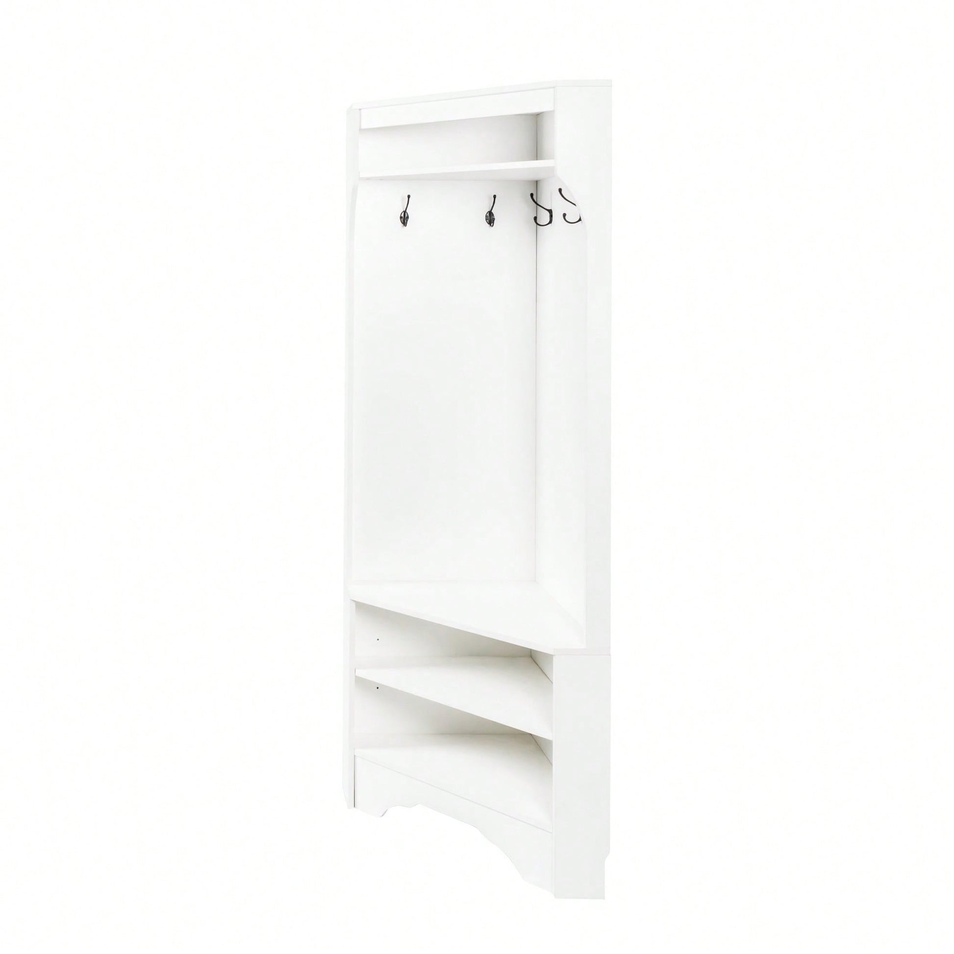 Minimalist Corner Hall Tree with Shoe Bench and Coat Rack, Stylish Entryway Organizer with 4 Hooks and Adjustable Shelf, White Finish