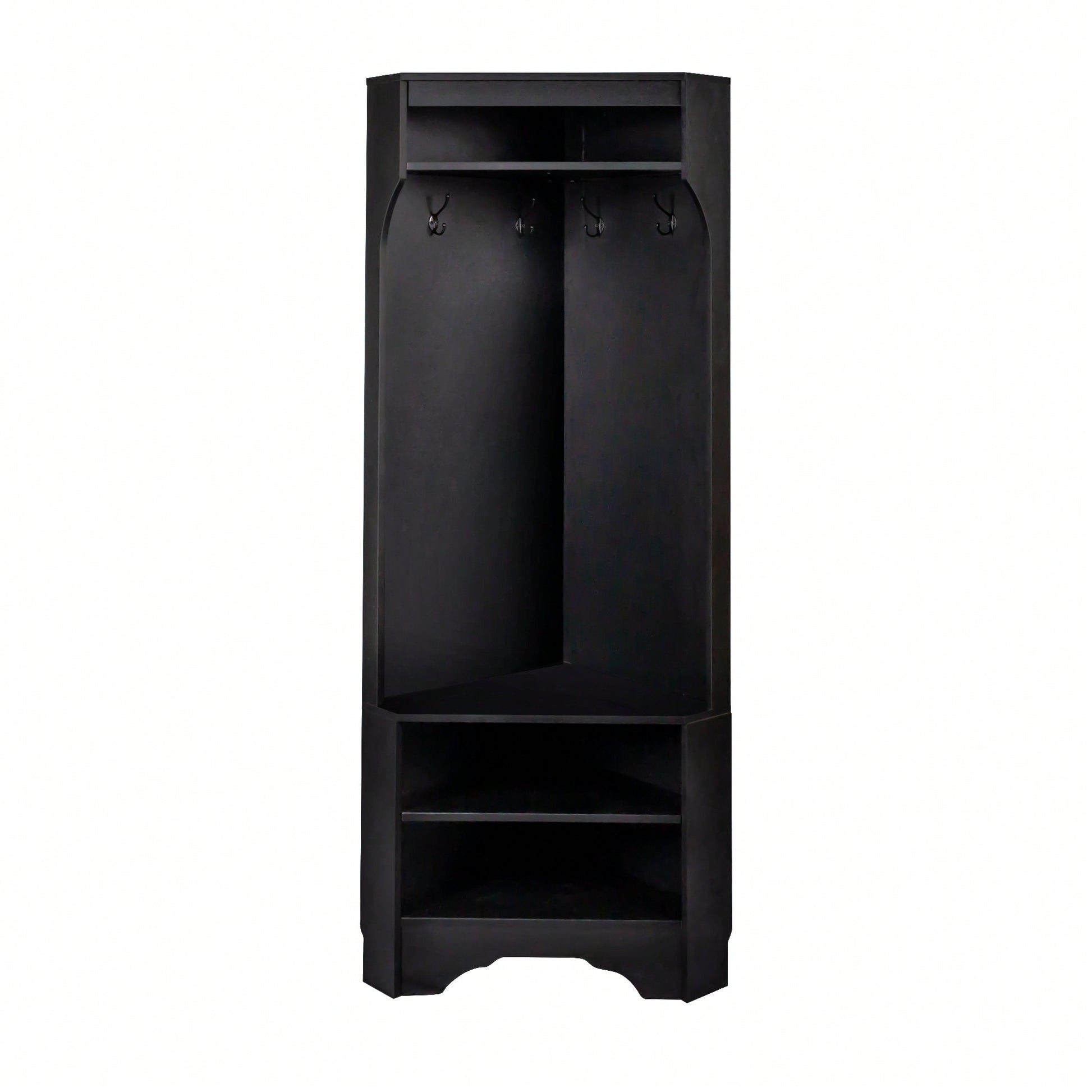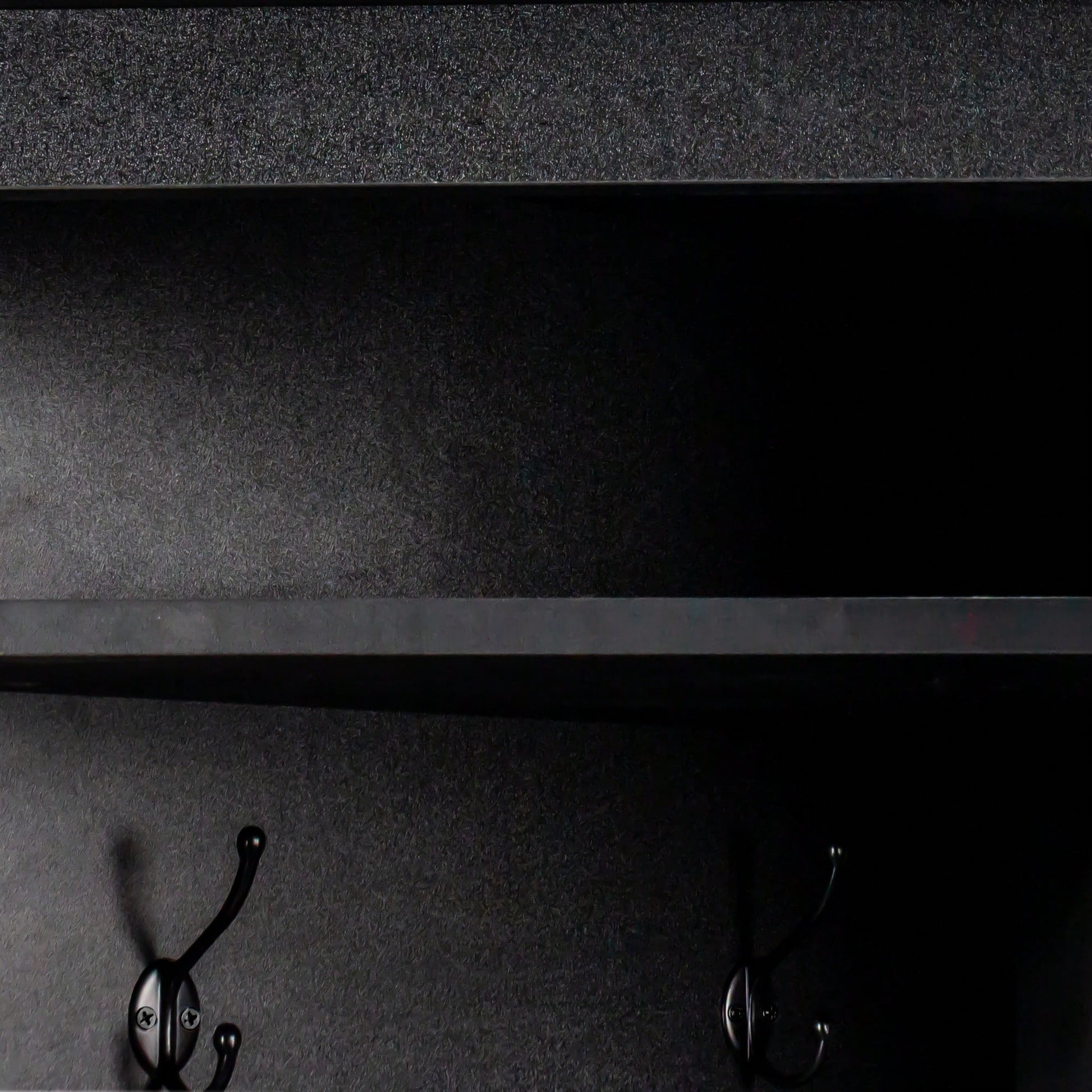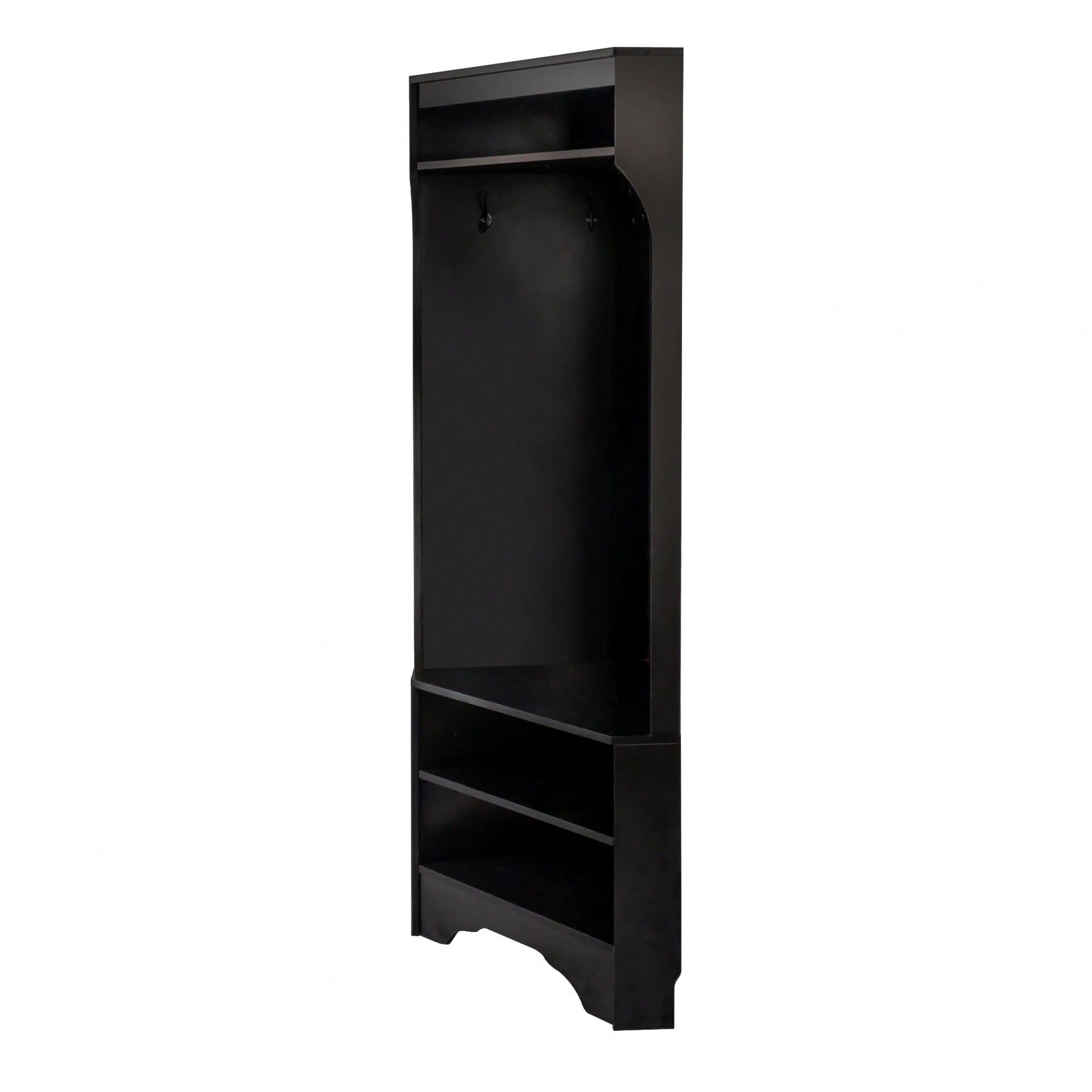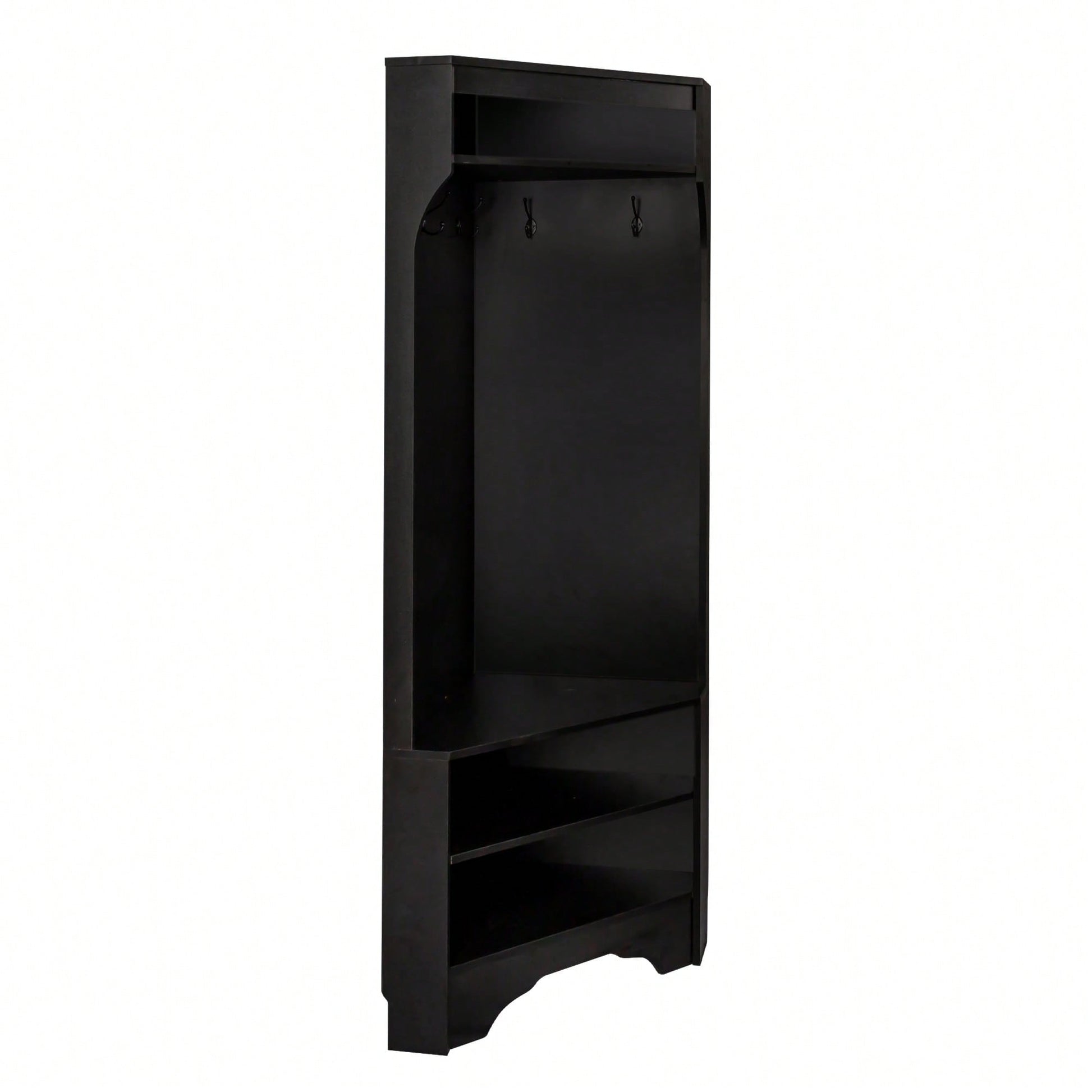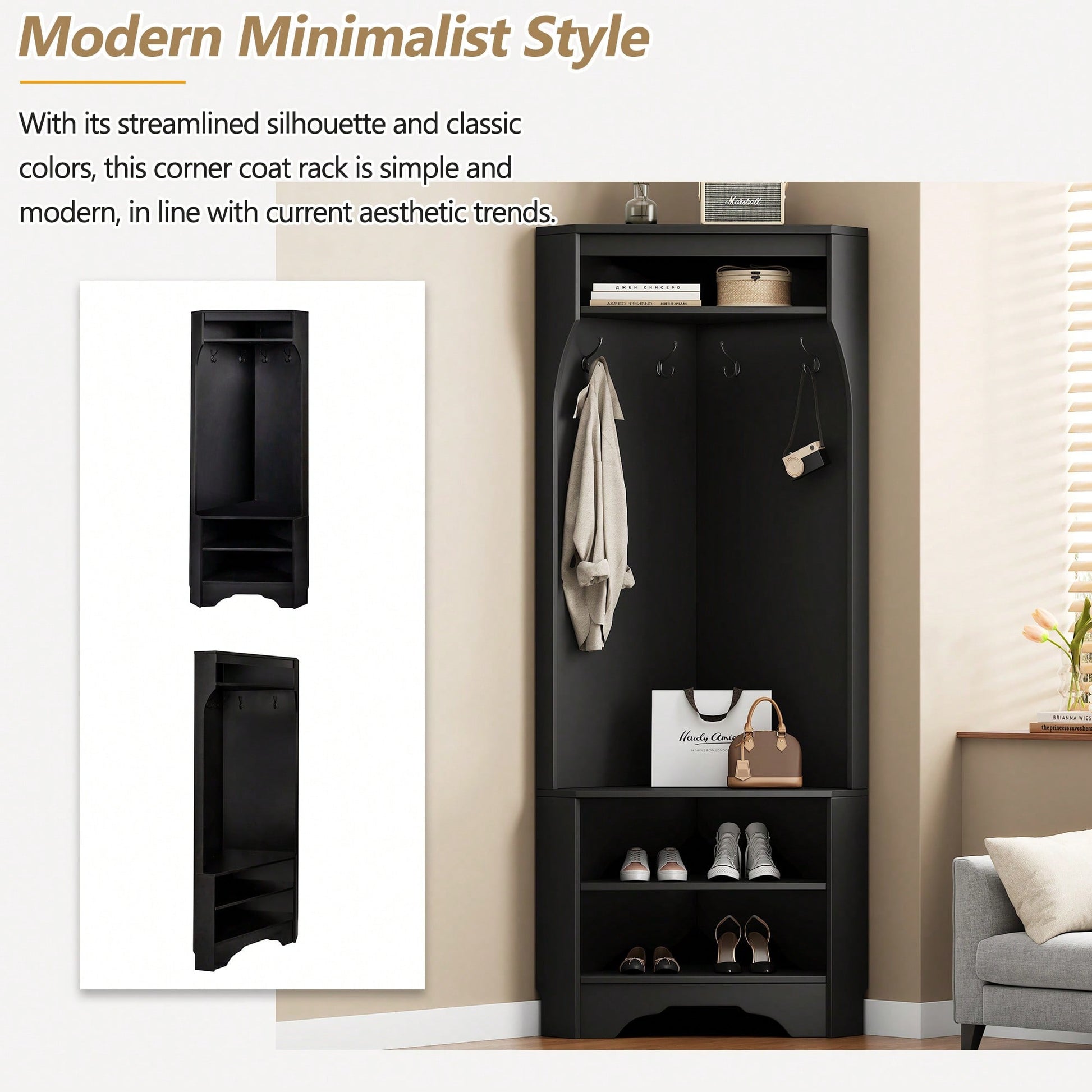 This minimalist corner hall tree combines beauty and functionality, making it a perfect addition to any entryway. Its modern design seamlessly integrates into diverse home aesthetics while providing essential storage solutions. The hall tree features a comfortable shoe bench, an adjustable shelf for shoes, and ample top storage space. With four hooks for coats and bags, it offers convenience for everyday use. The skirting line design at the bottom enhances stability and adds a touch of traditional elegance, ensuring it fits snugly against the wall and is easy to clean.